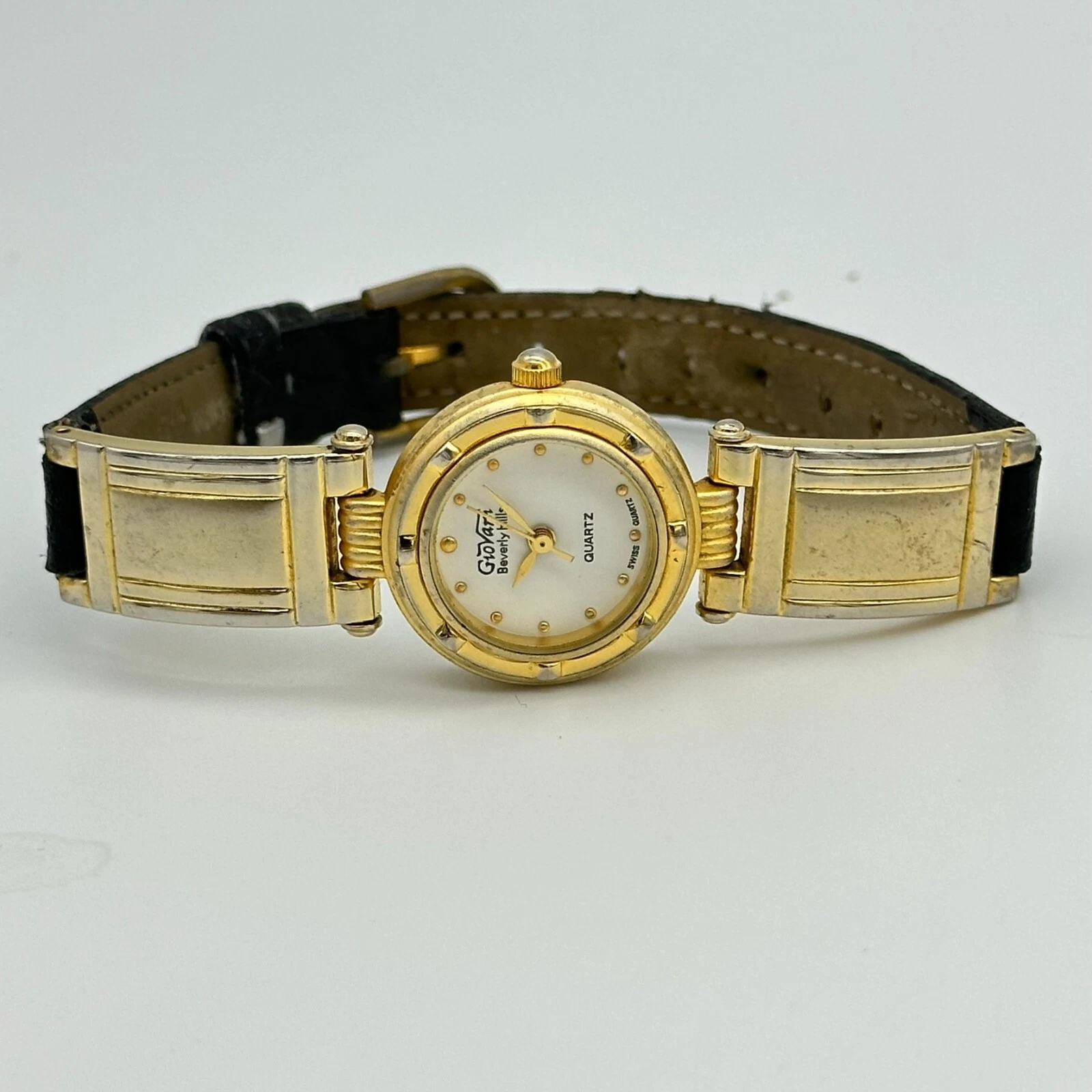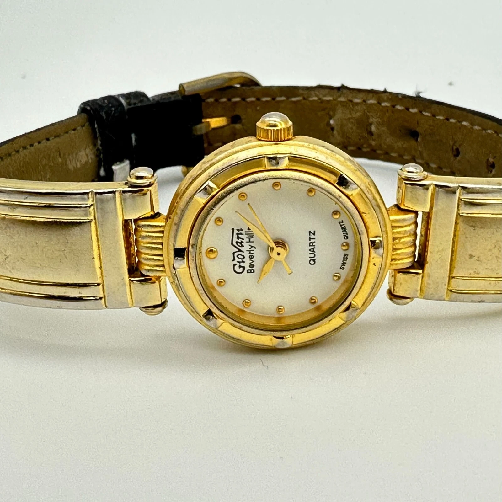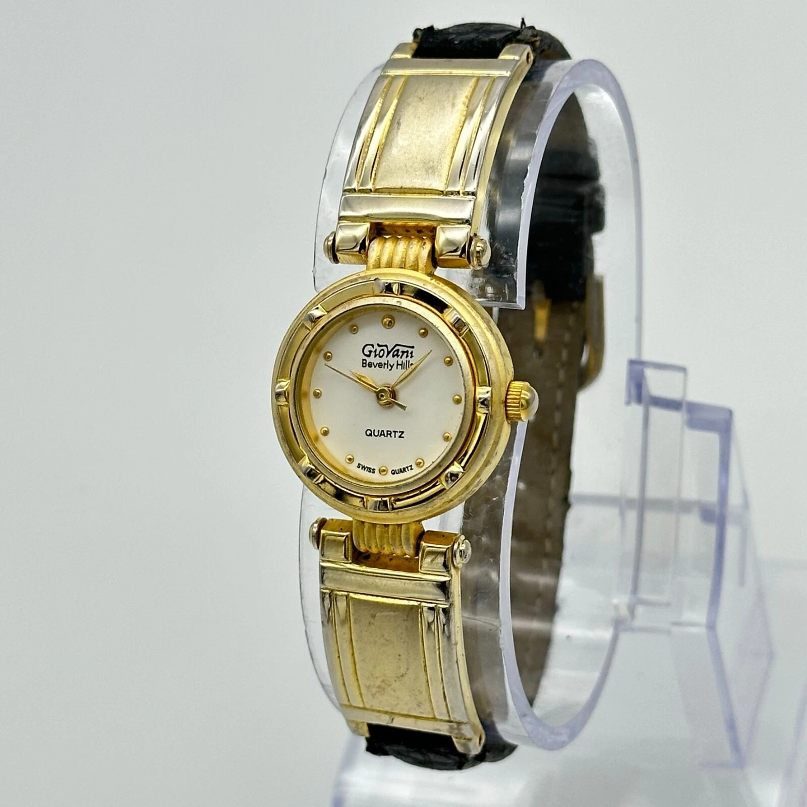 Ladies GIOVANNI Beverly Hills Gold Tone Dress/Casual Black Leather Band Watch