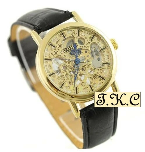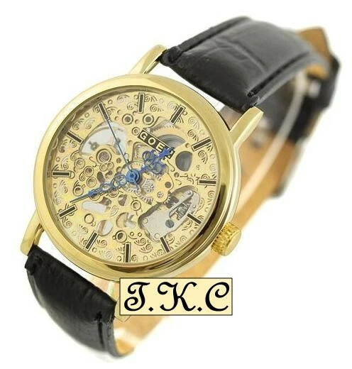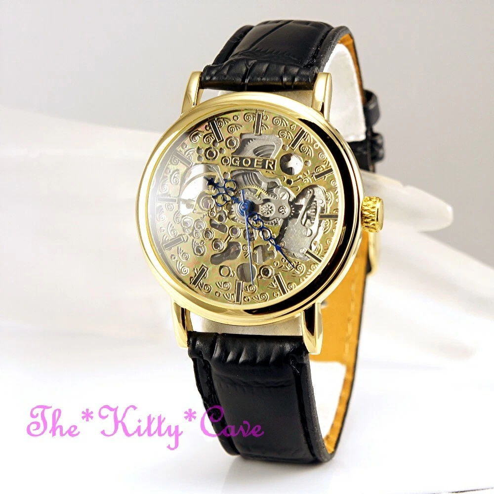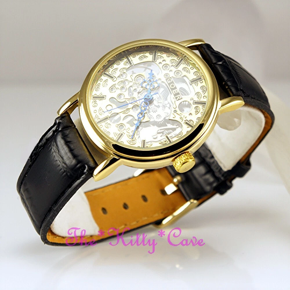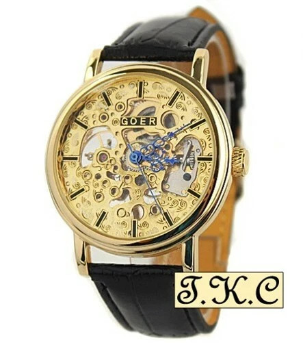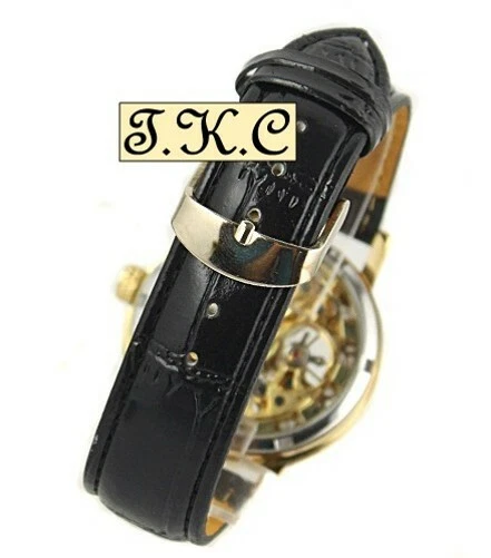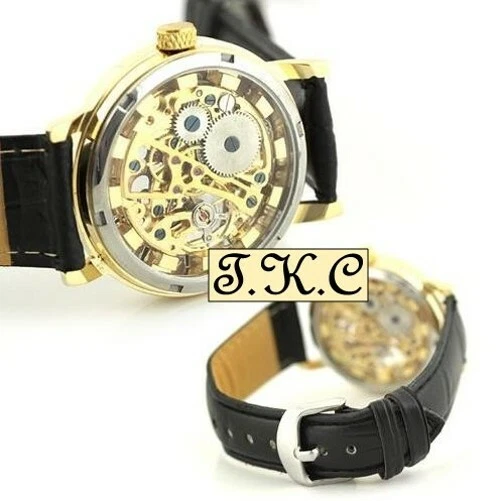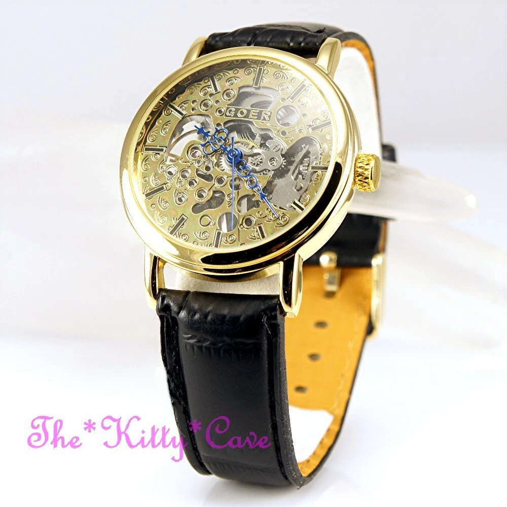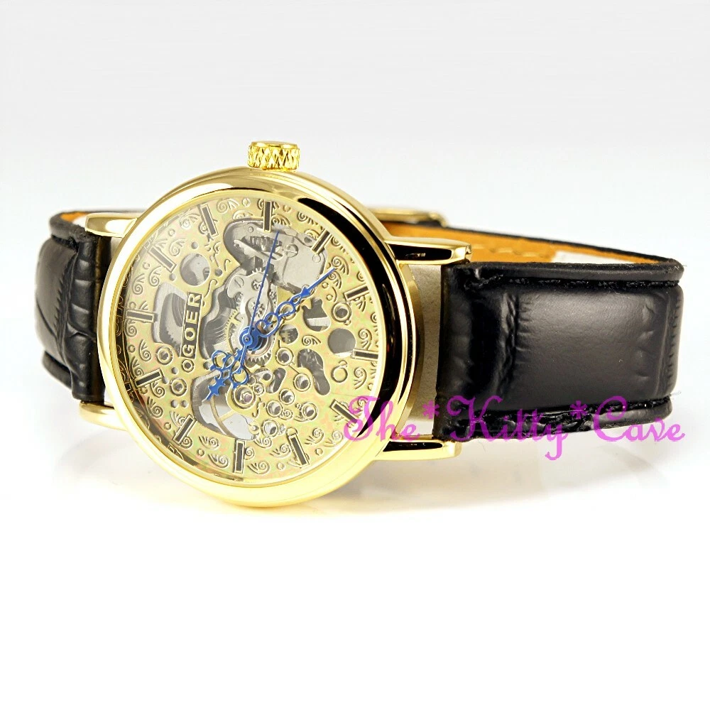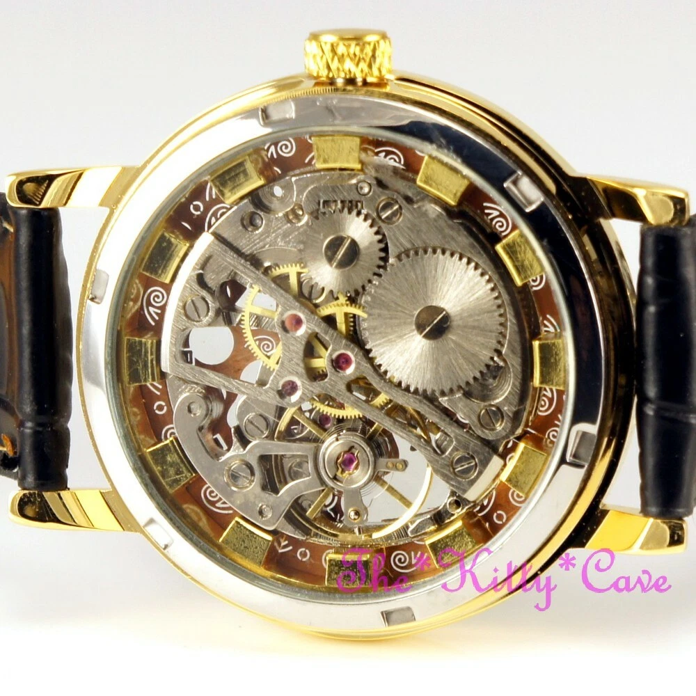 Gold pl Mechanical Windup Skeleton Steampunk Black Leather Unisex Heirloom Watch