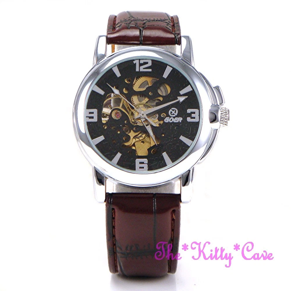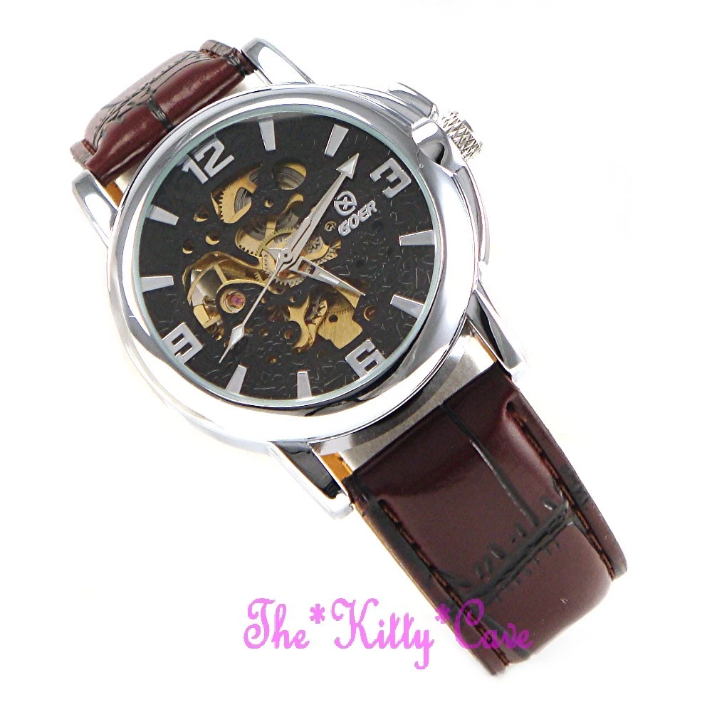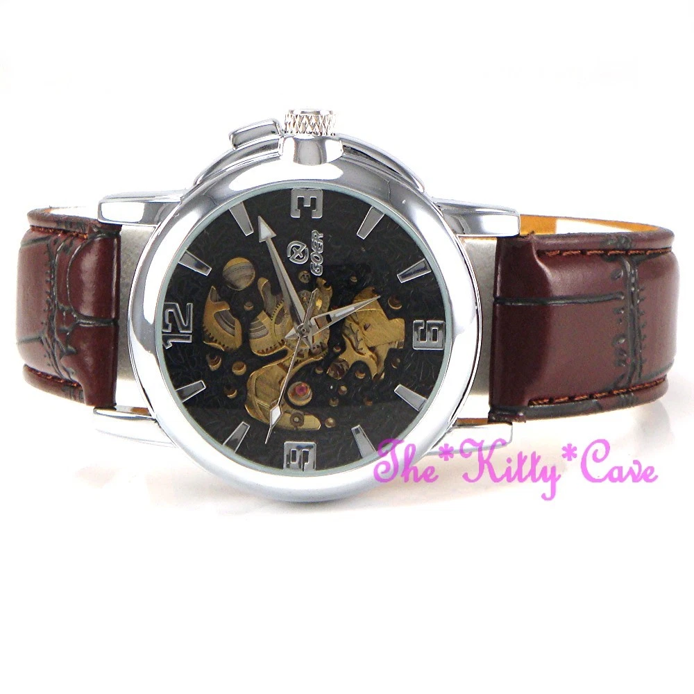 Automatic Mechanical Steampunk Skeleton Silver Brown Leather Wind-Up Wrist Watch