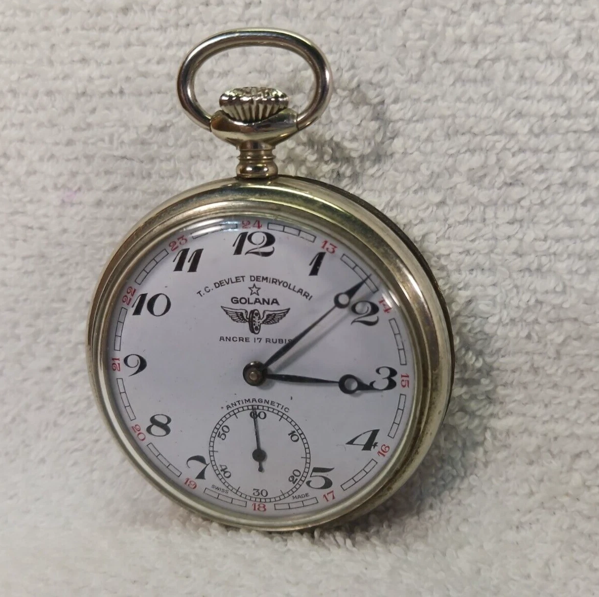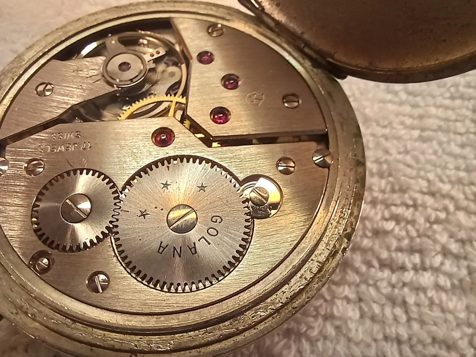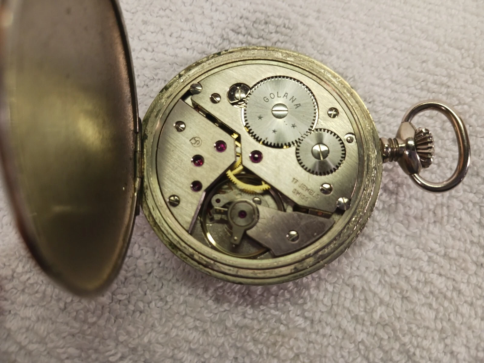 VINTAGE GOLANA POCKET WATCH, 17 JEWELS, SWISS MADE - LOCOMOTIVE ON BACK