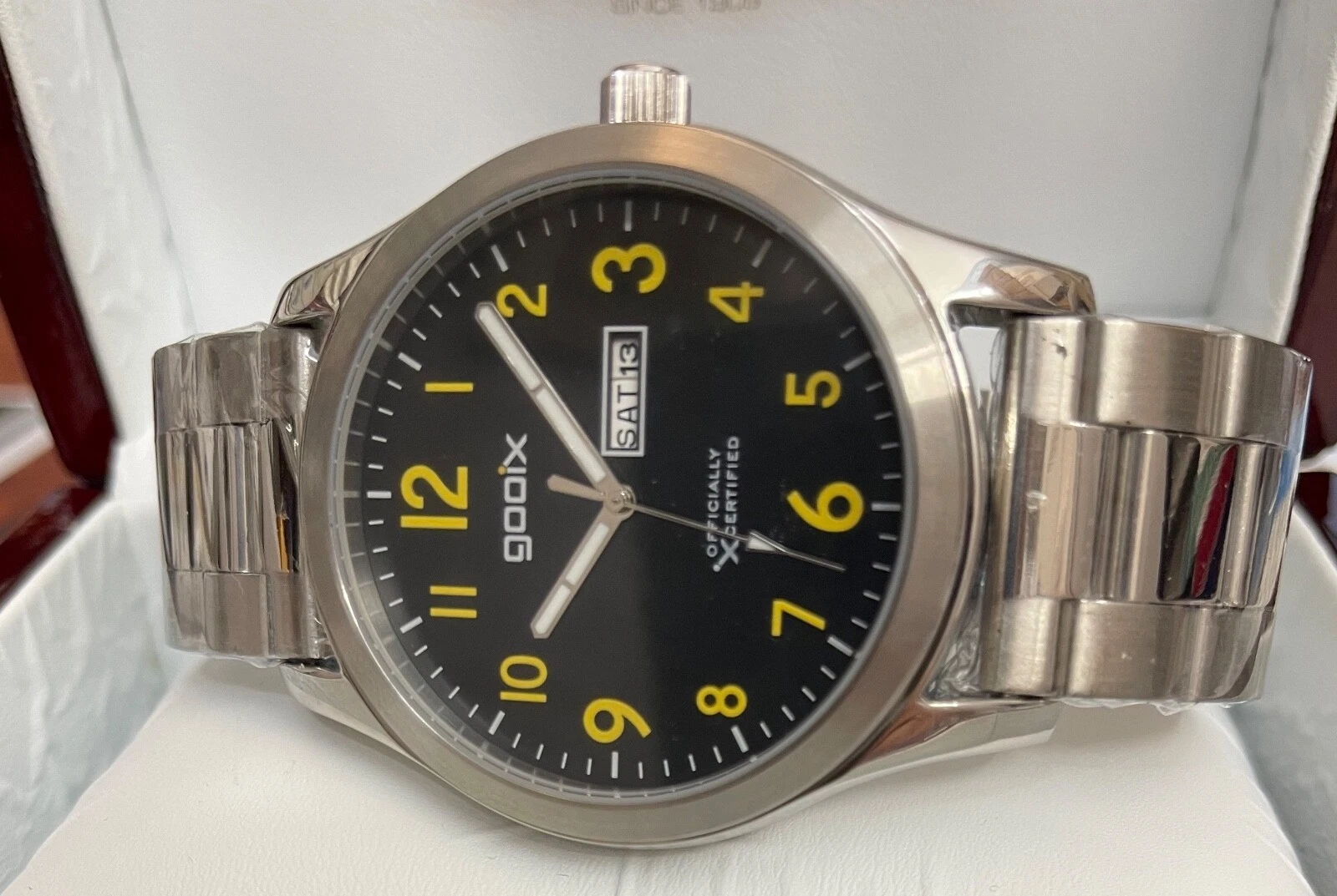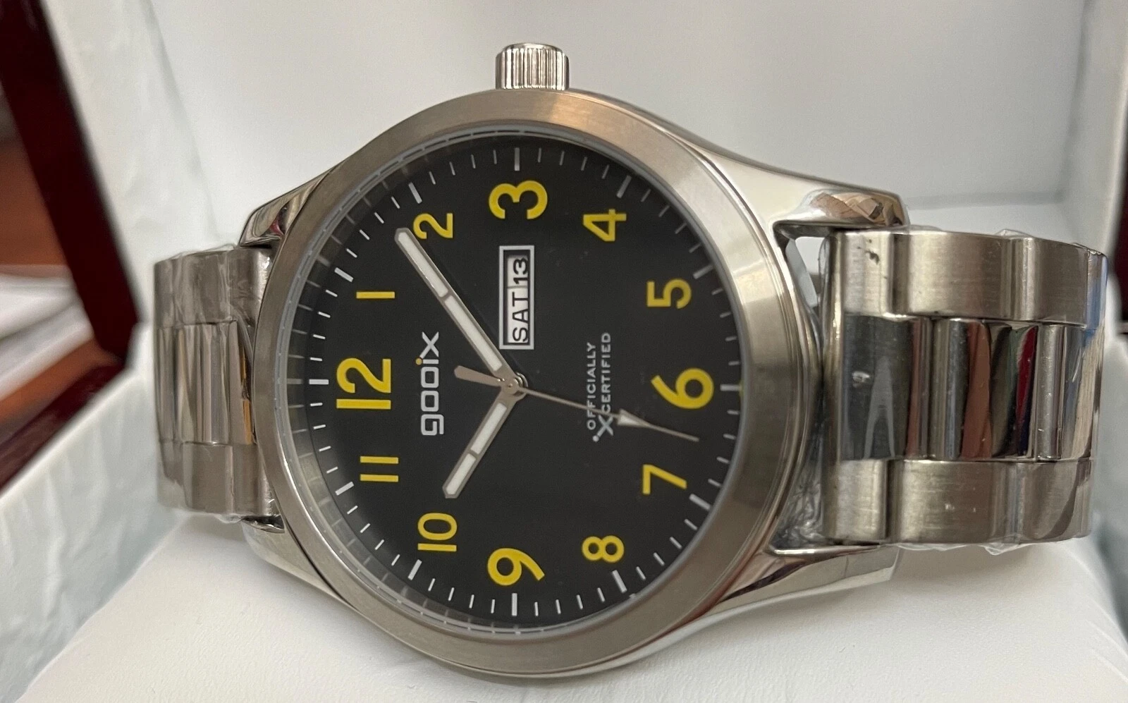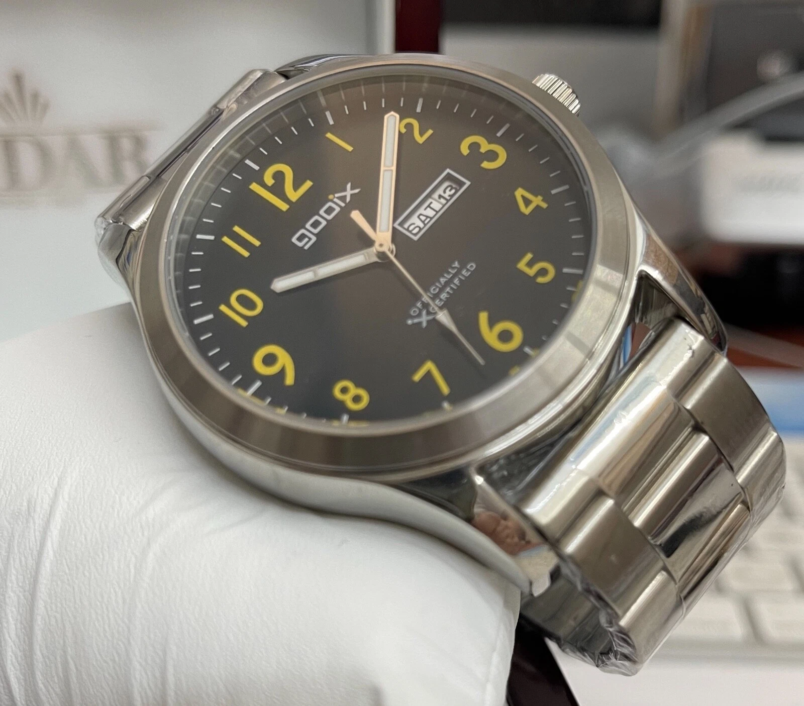 Gooix Pilot Watch Men's XXL 48mm Date Yellow Numbers Solid Stainless Steel 5BAR