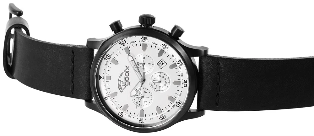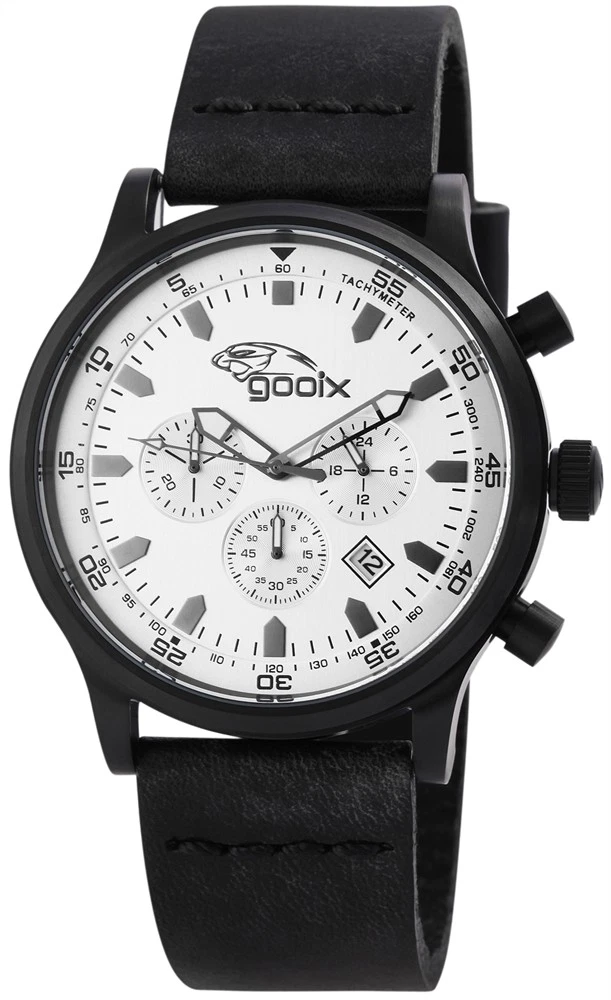 Men's Watch Wristwatch Chronograph Silver Black Leather Strap HUA05893 Gooix