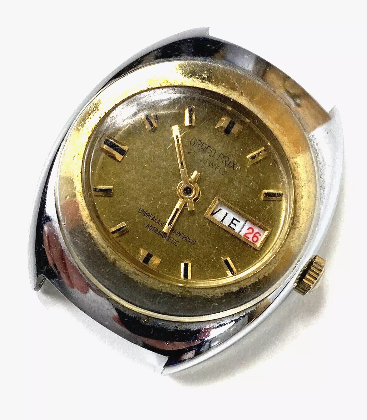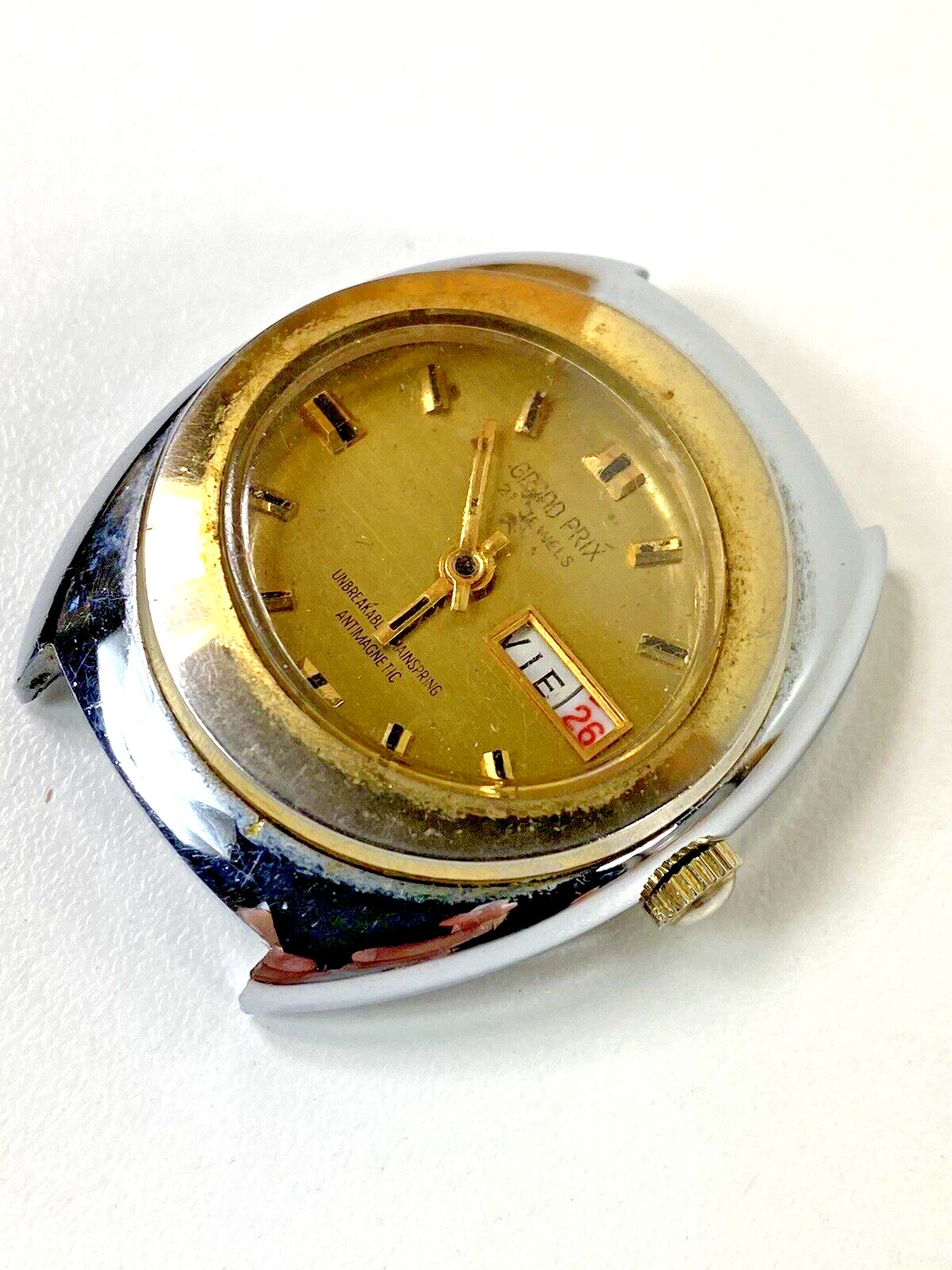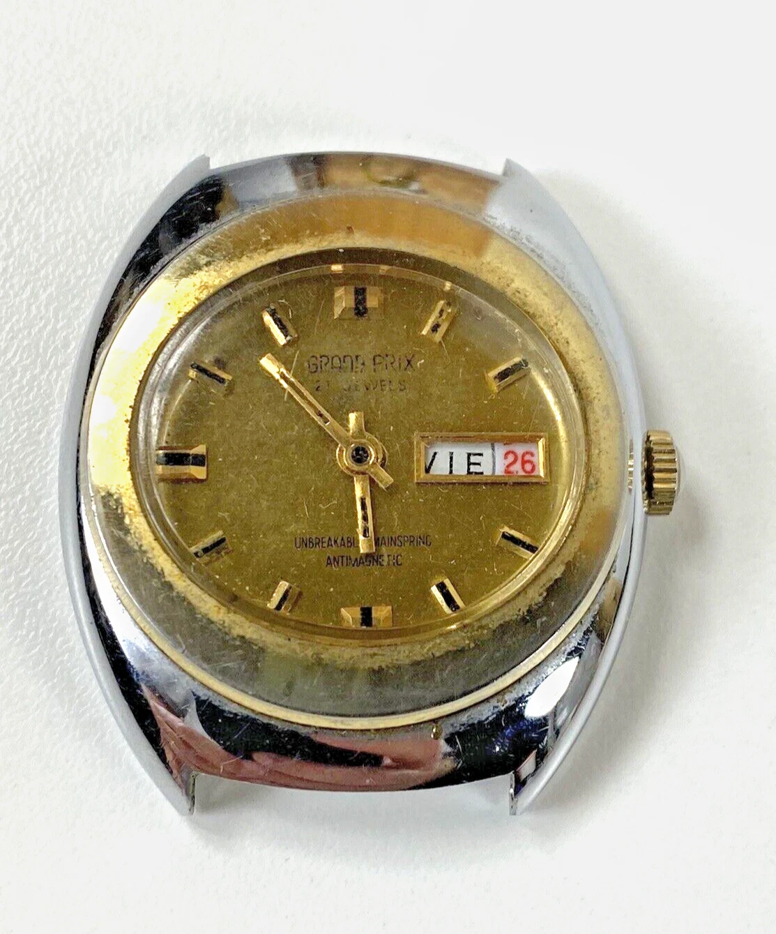 Vintage Grand Prix Mens Watch 21 Jewels 1970s MOD Style Chrome Day Date