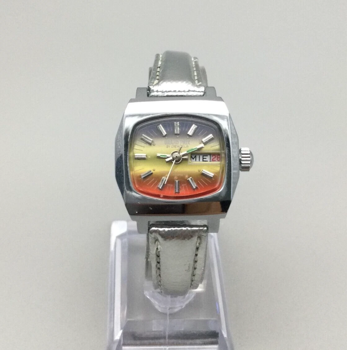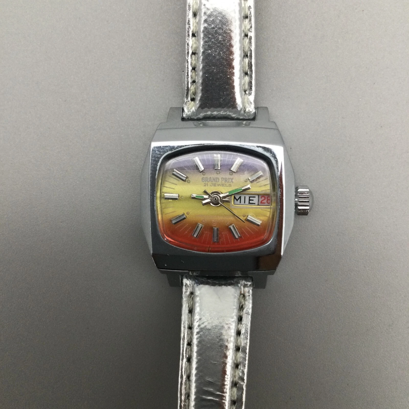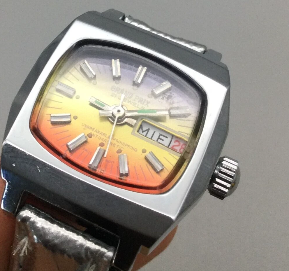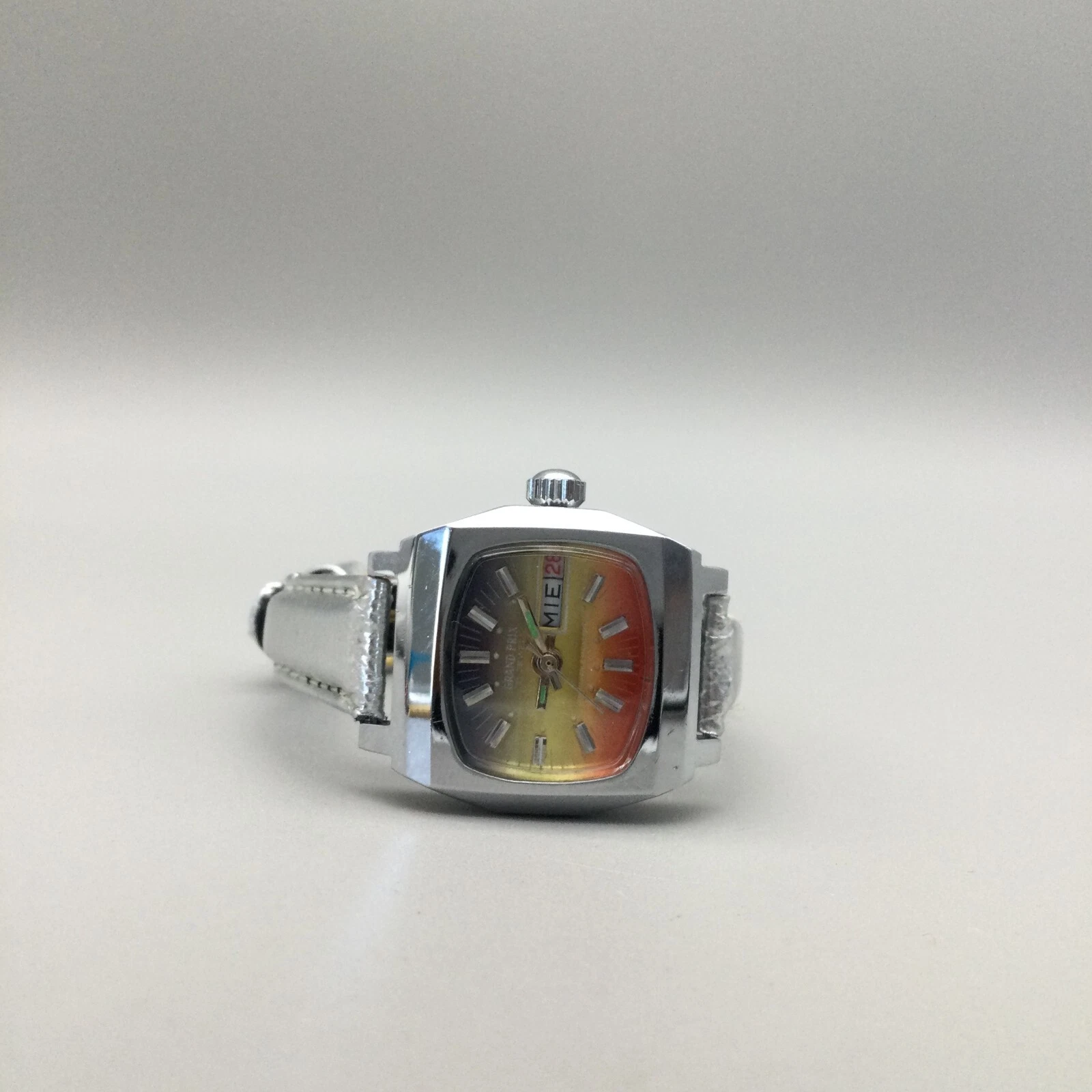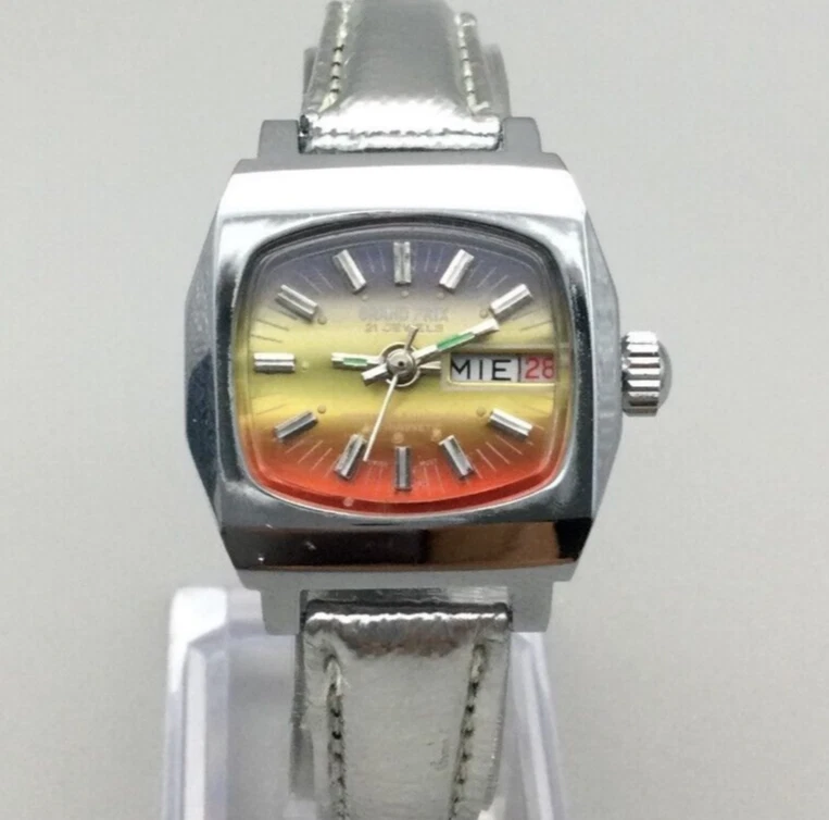 Vtg Grand Prix Watch Women 27mm Ombre Dial Day Date Leather Band New Battery