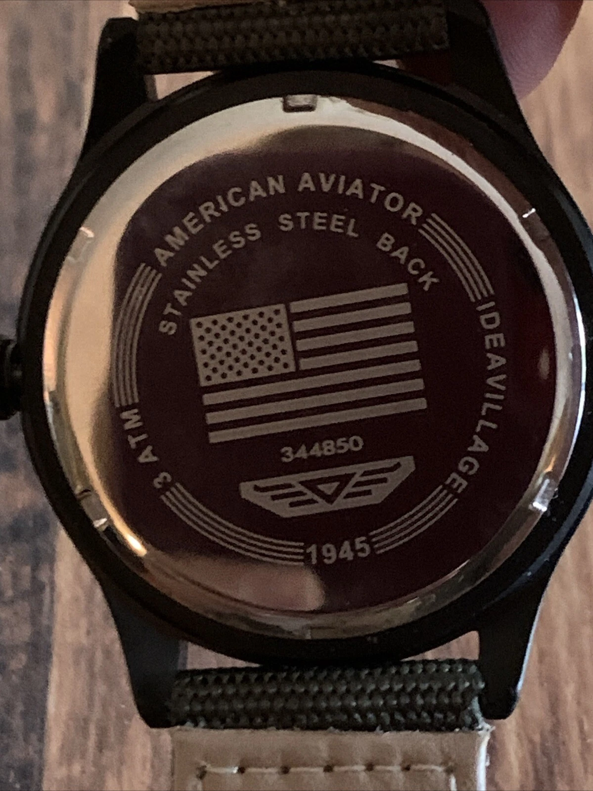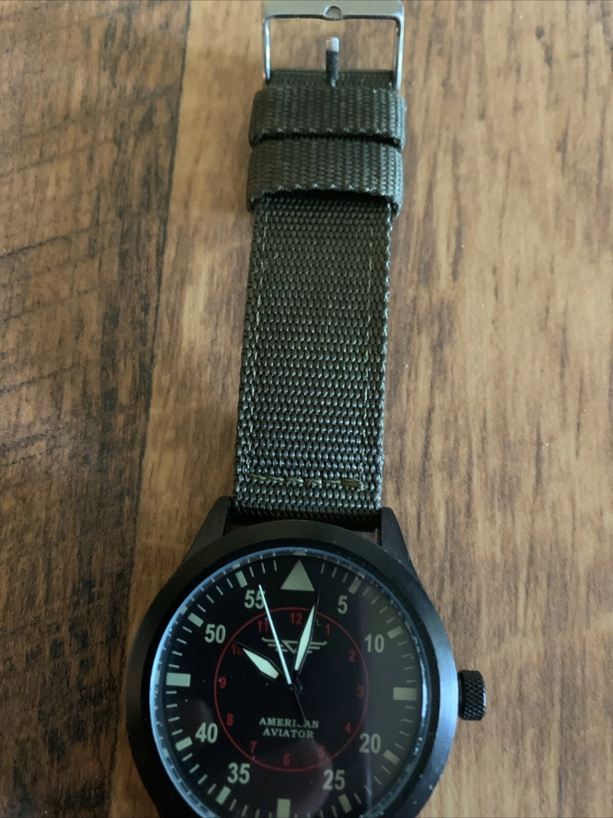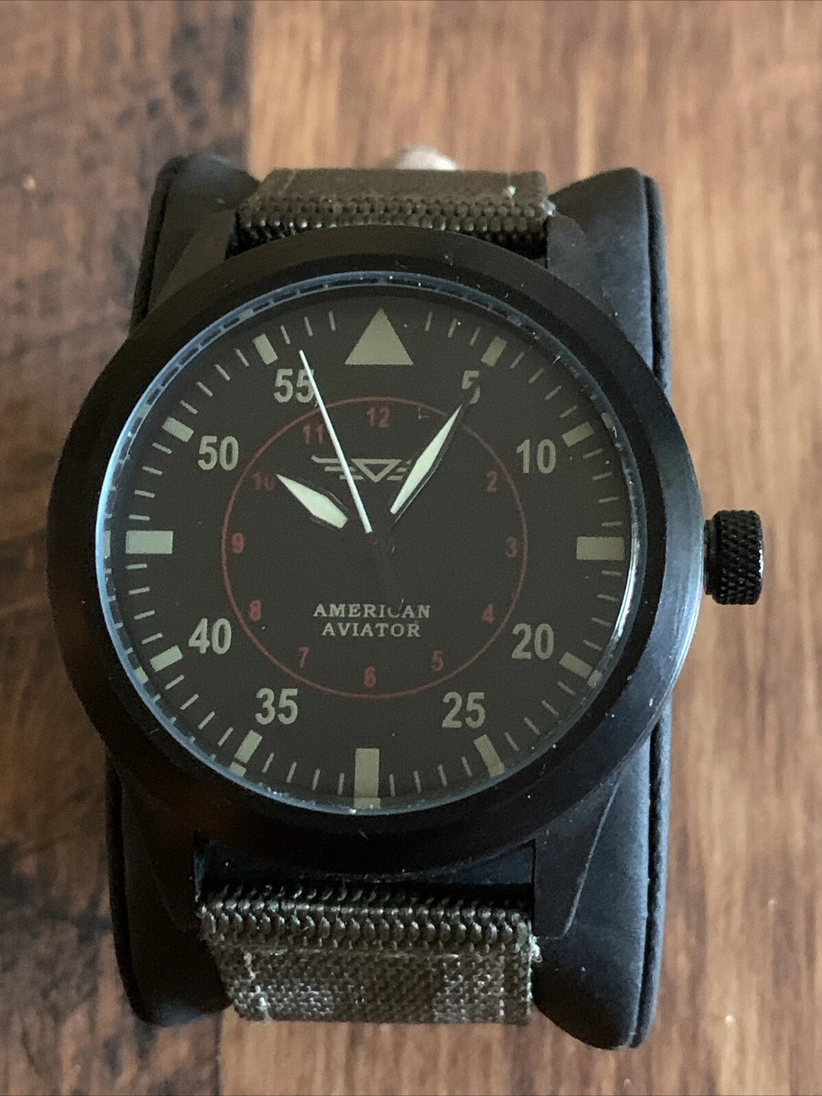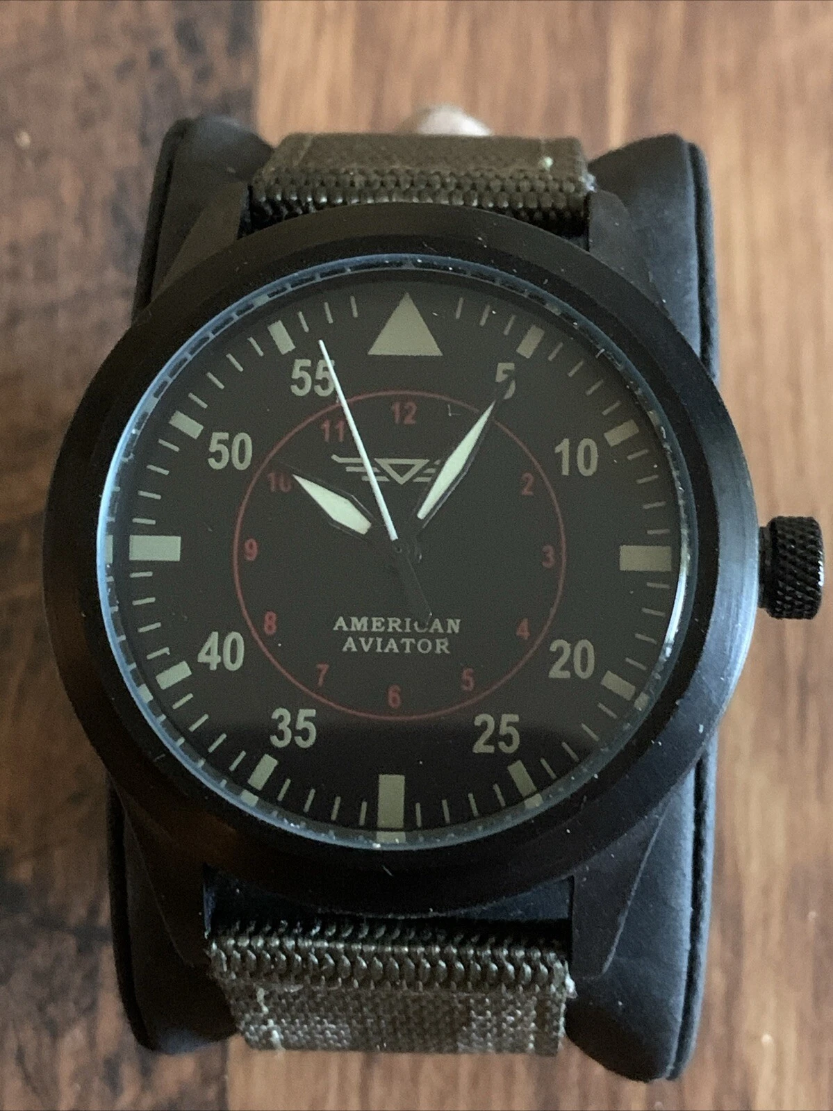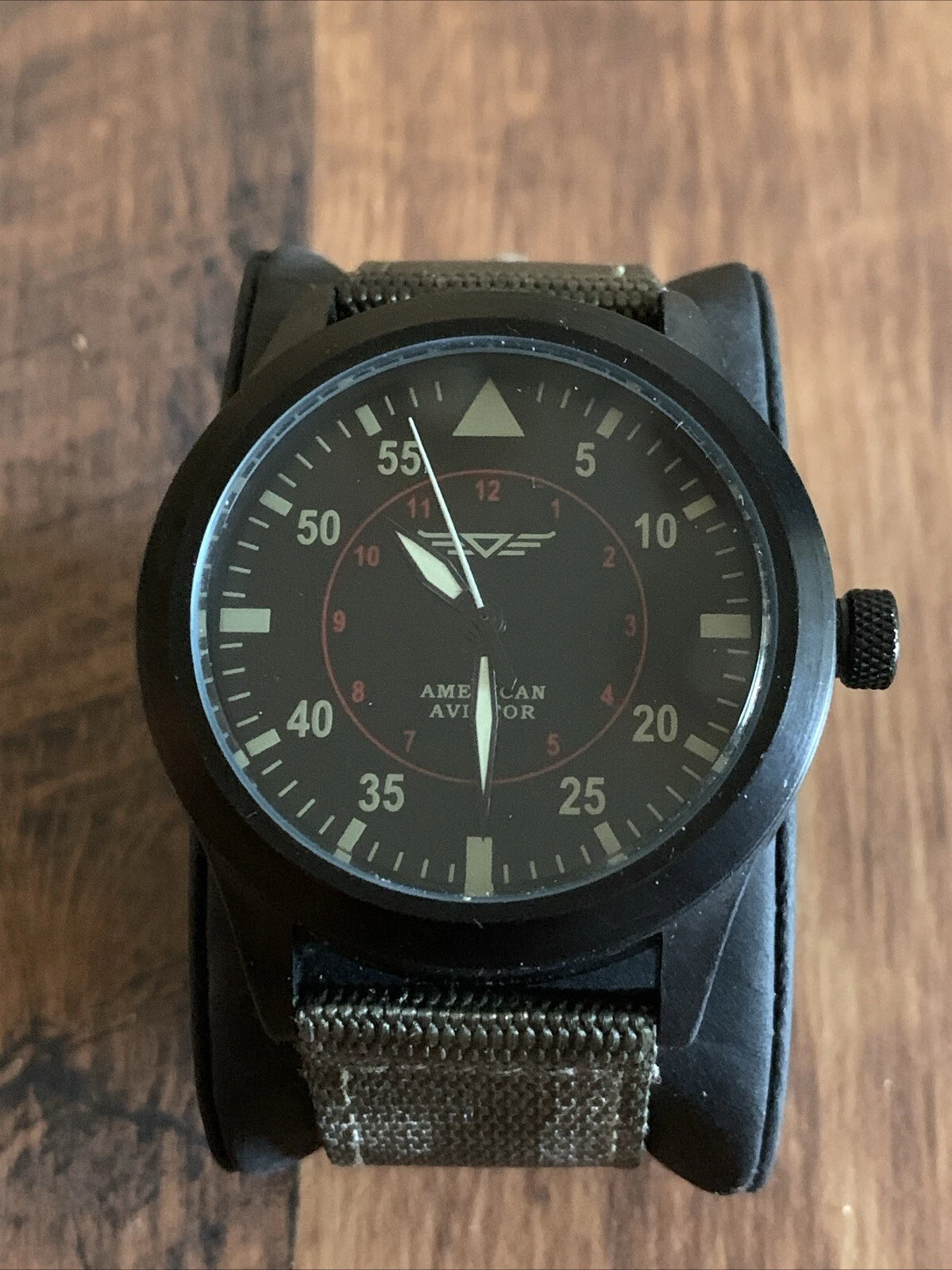 American Aviator Black Dial Round Case 44 mm Green Camp Canvas Band Watch Works