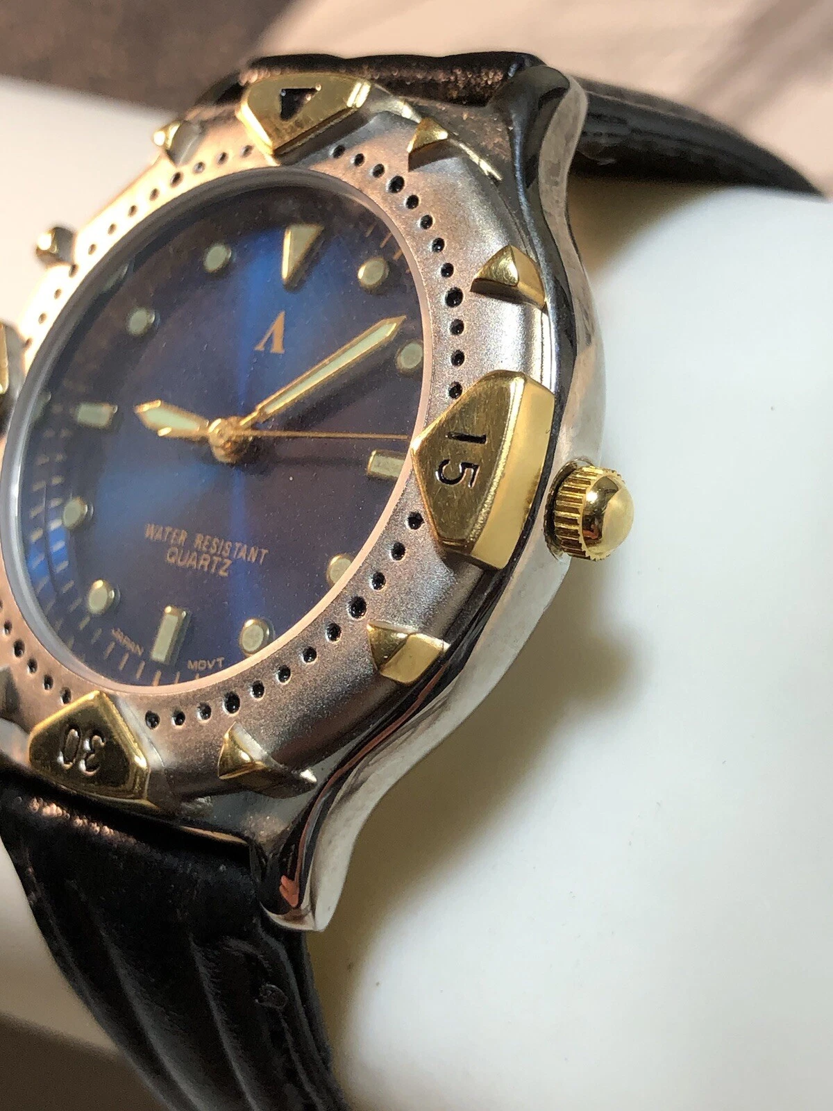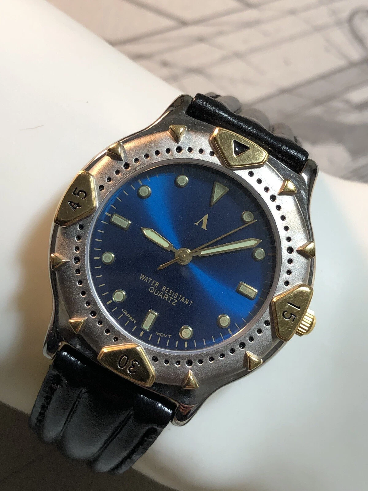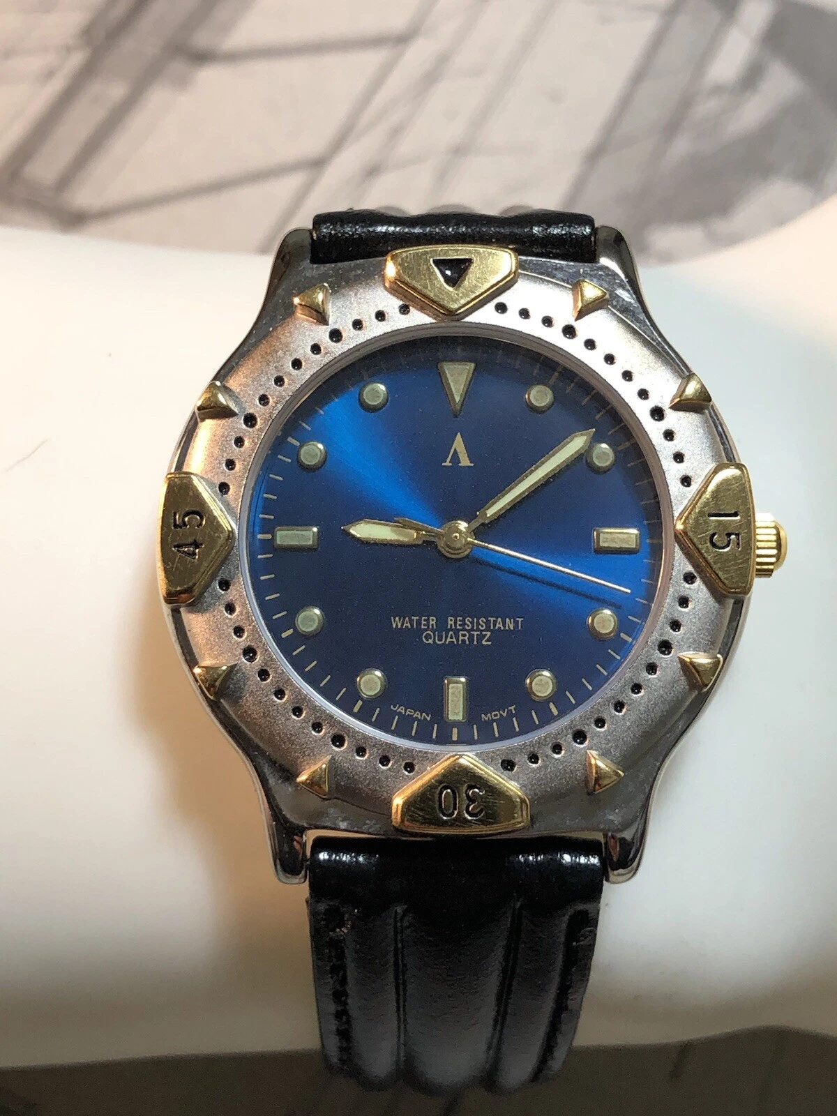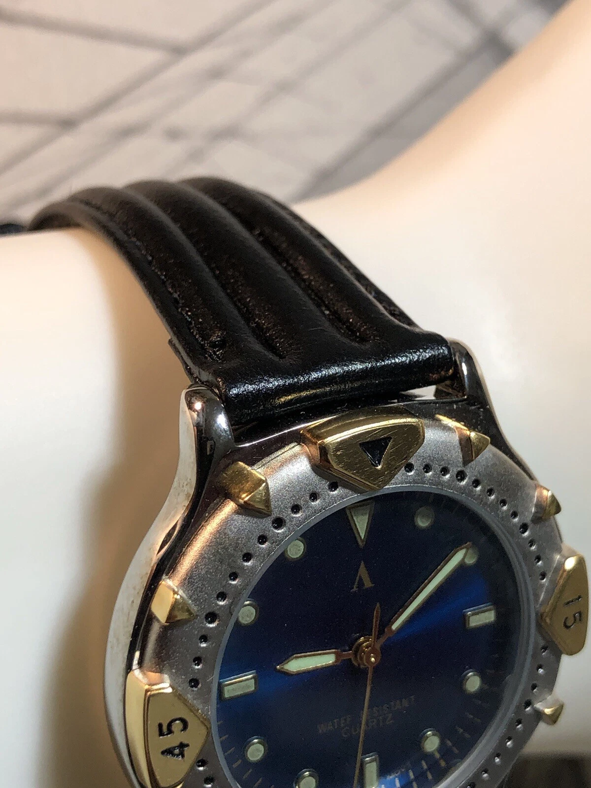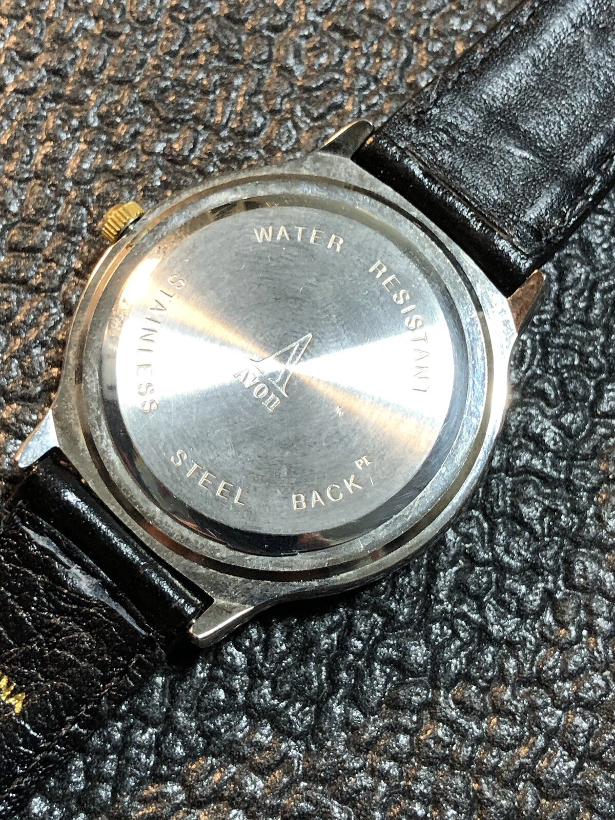 Vintage Avon Watch Blue Dial Silver & Gold Tone Leather Band Luminous Hands 37mm