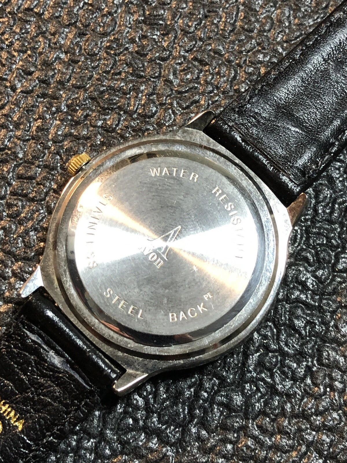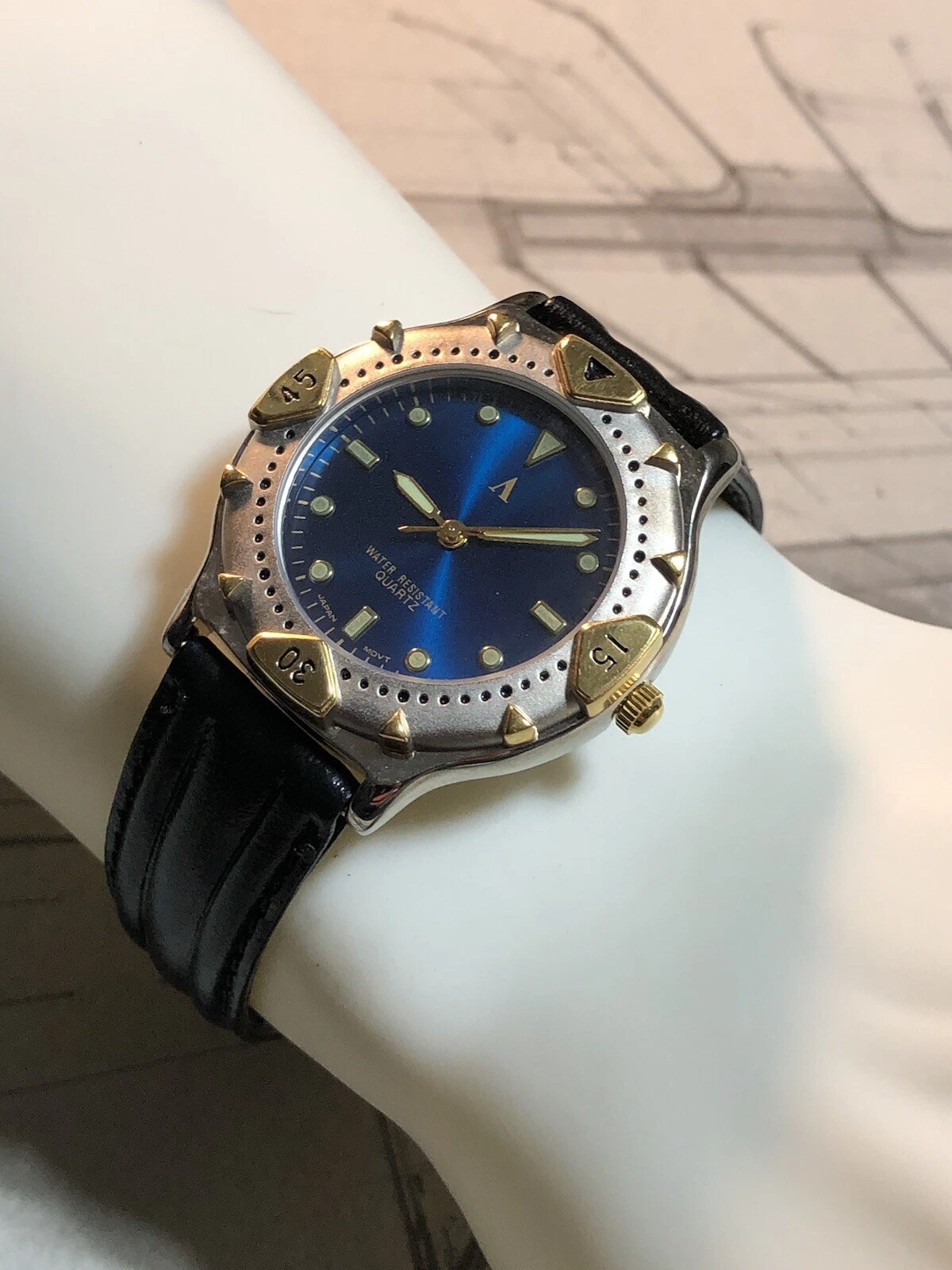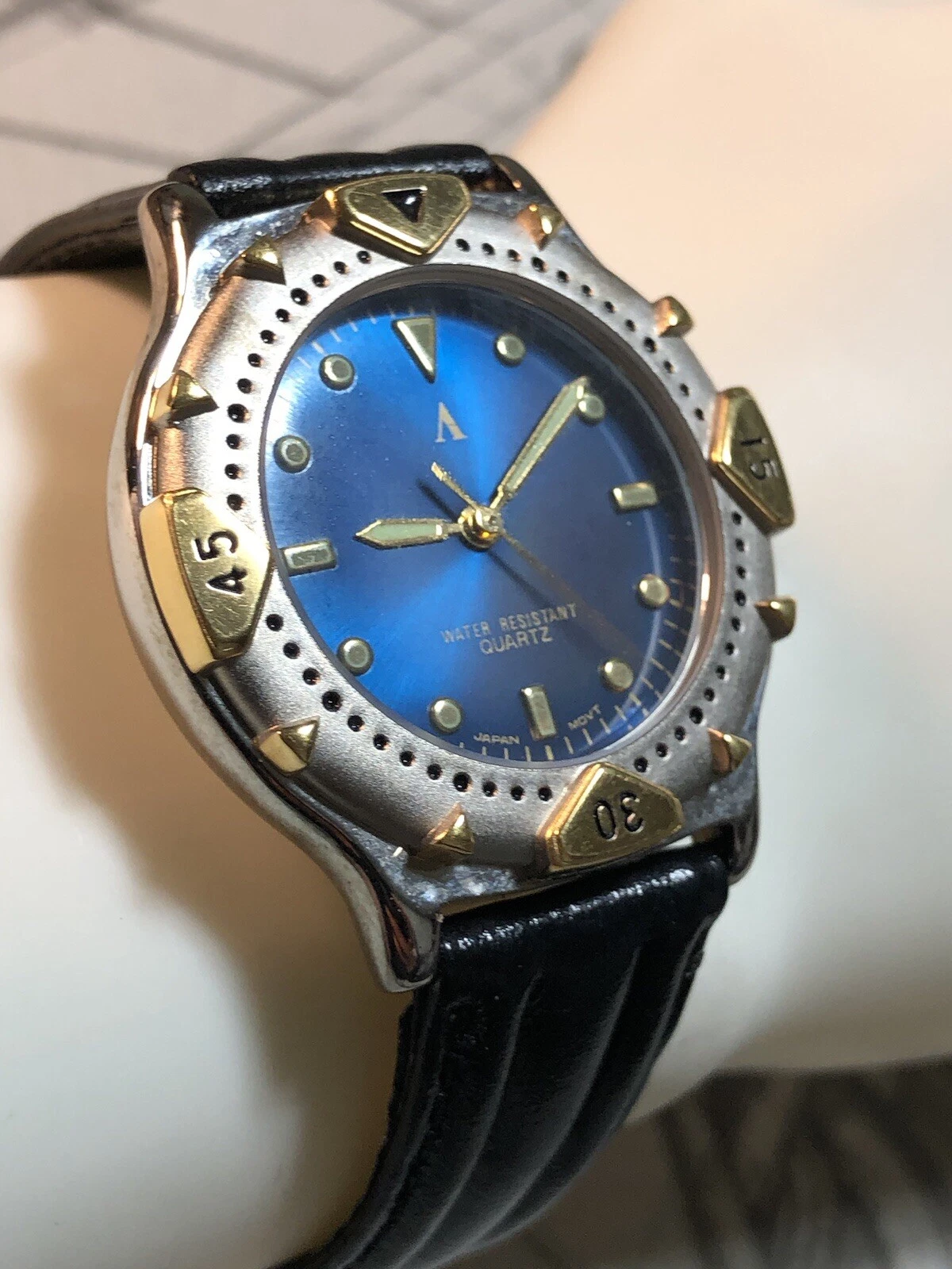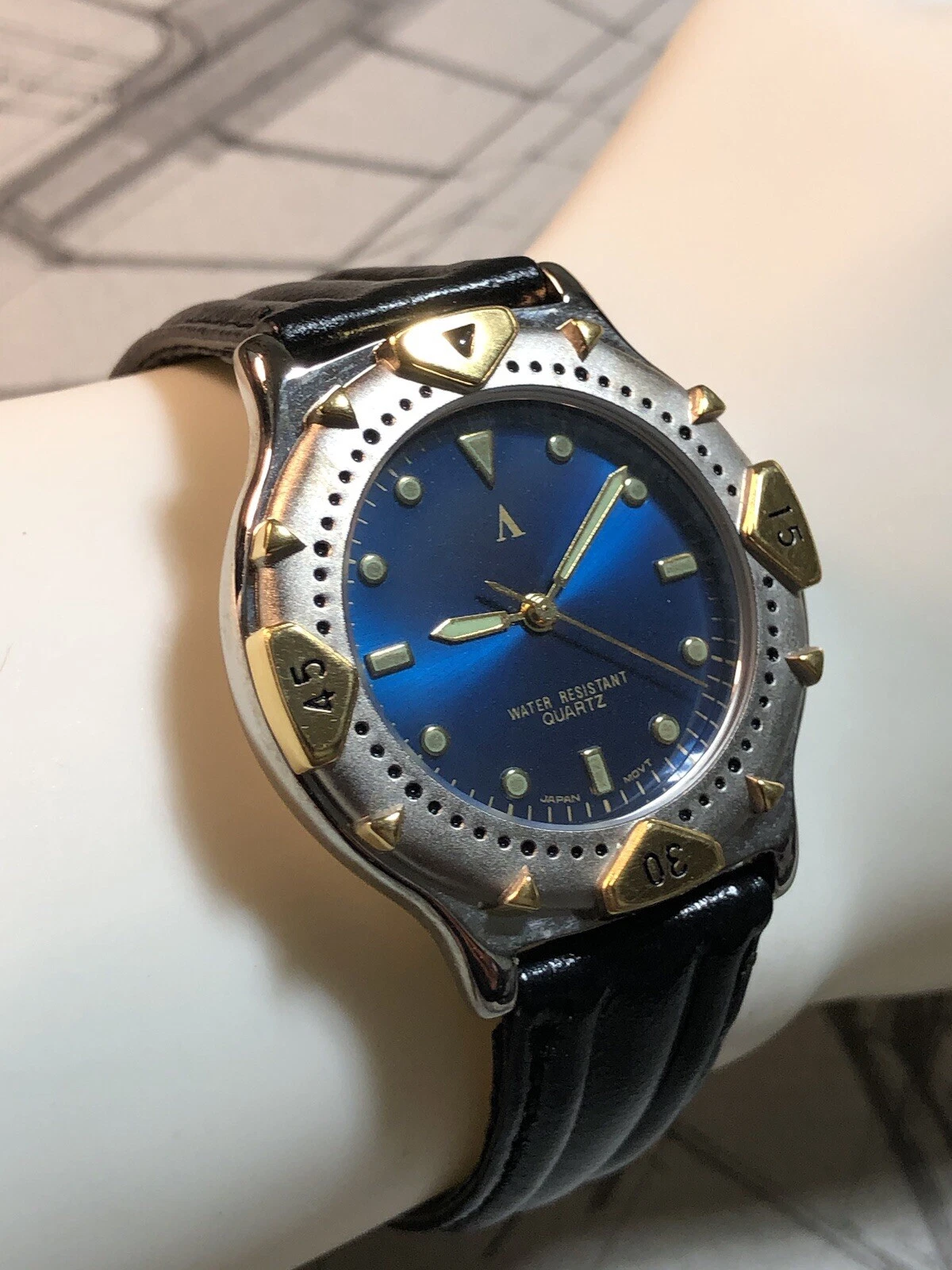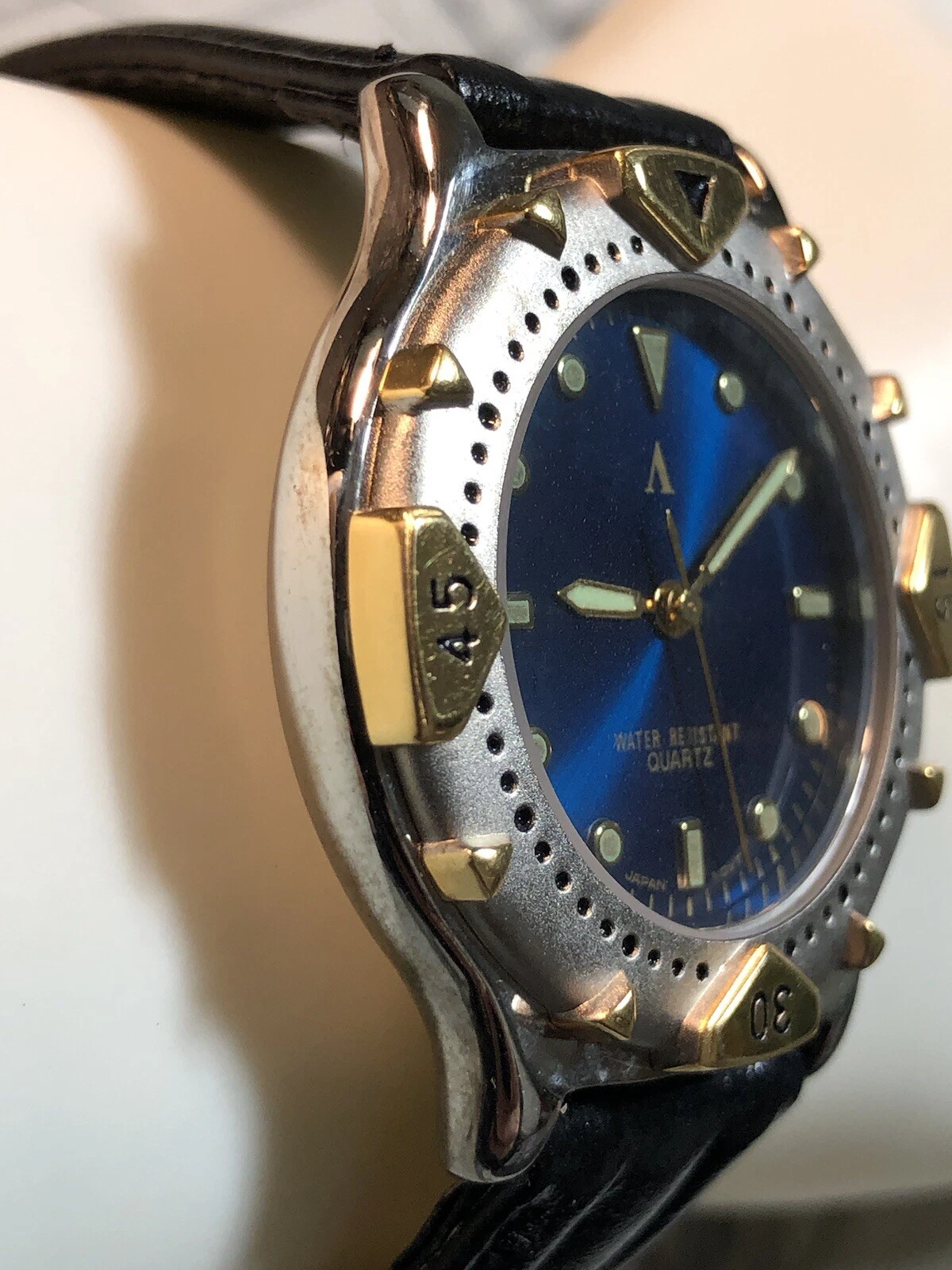 Vintage Avon Watch Blue Dial Silver & Gold Tone Leather Band Luminous Hands 37mm