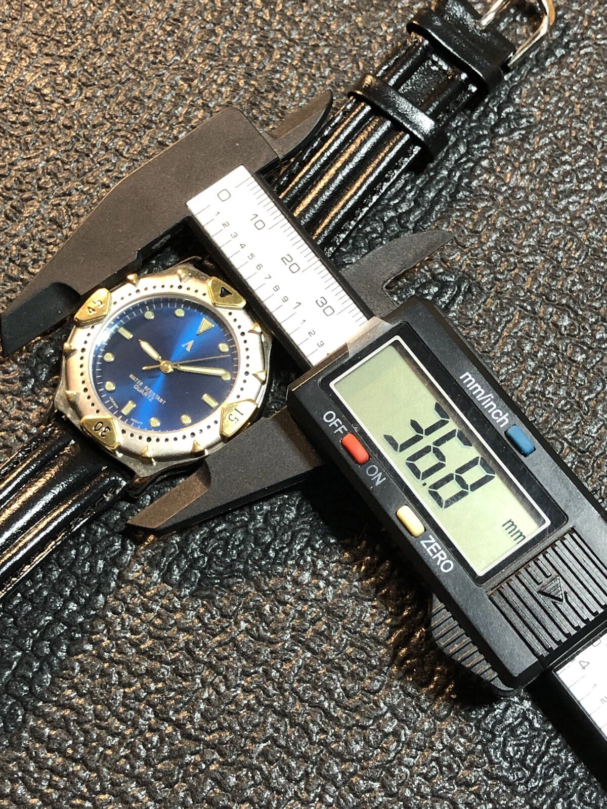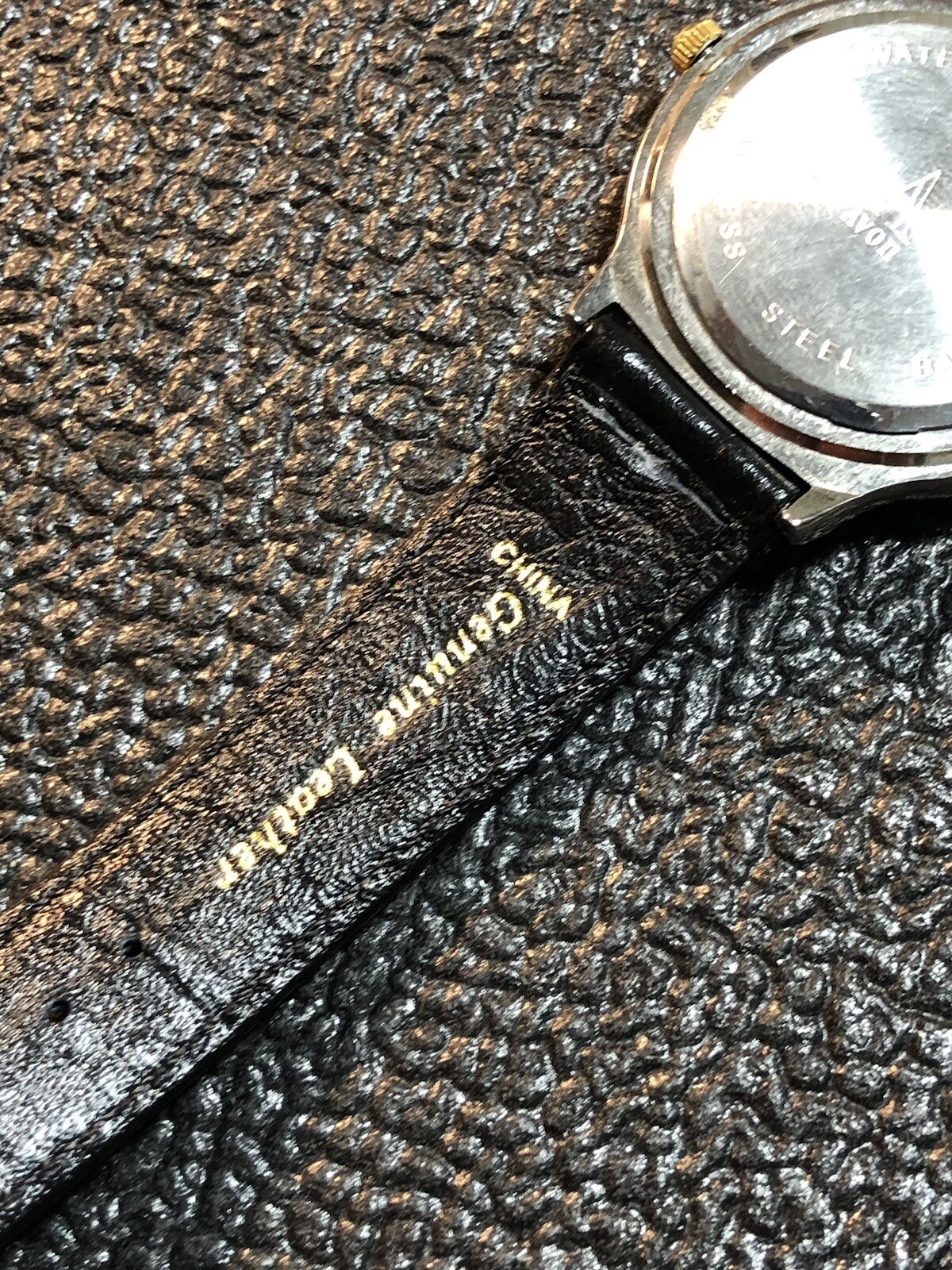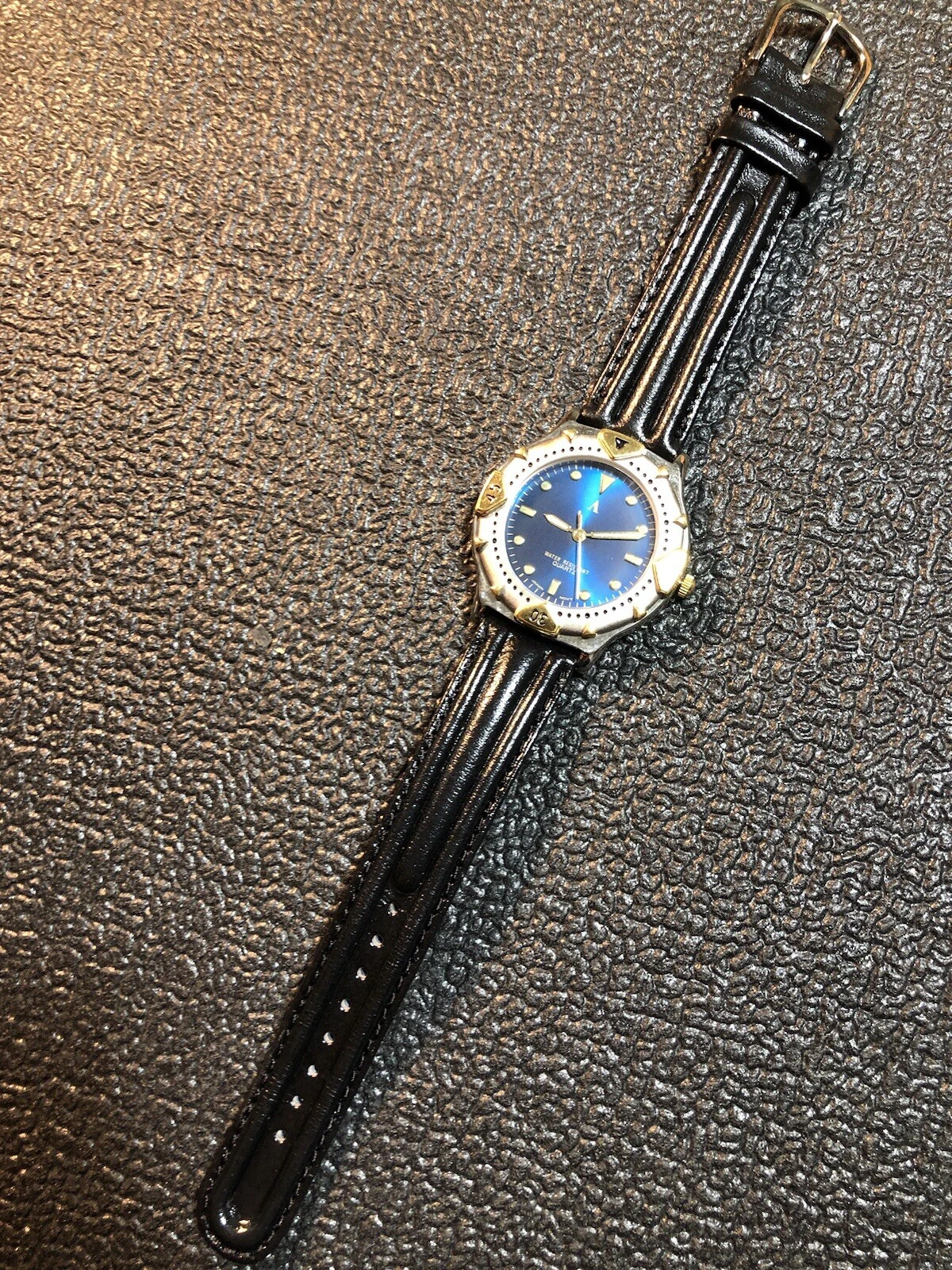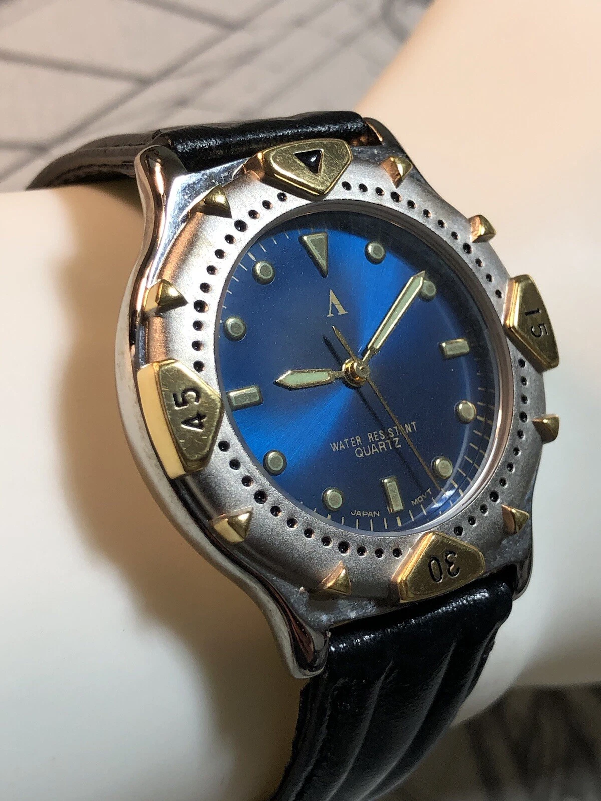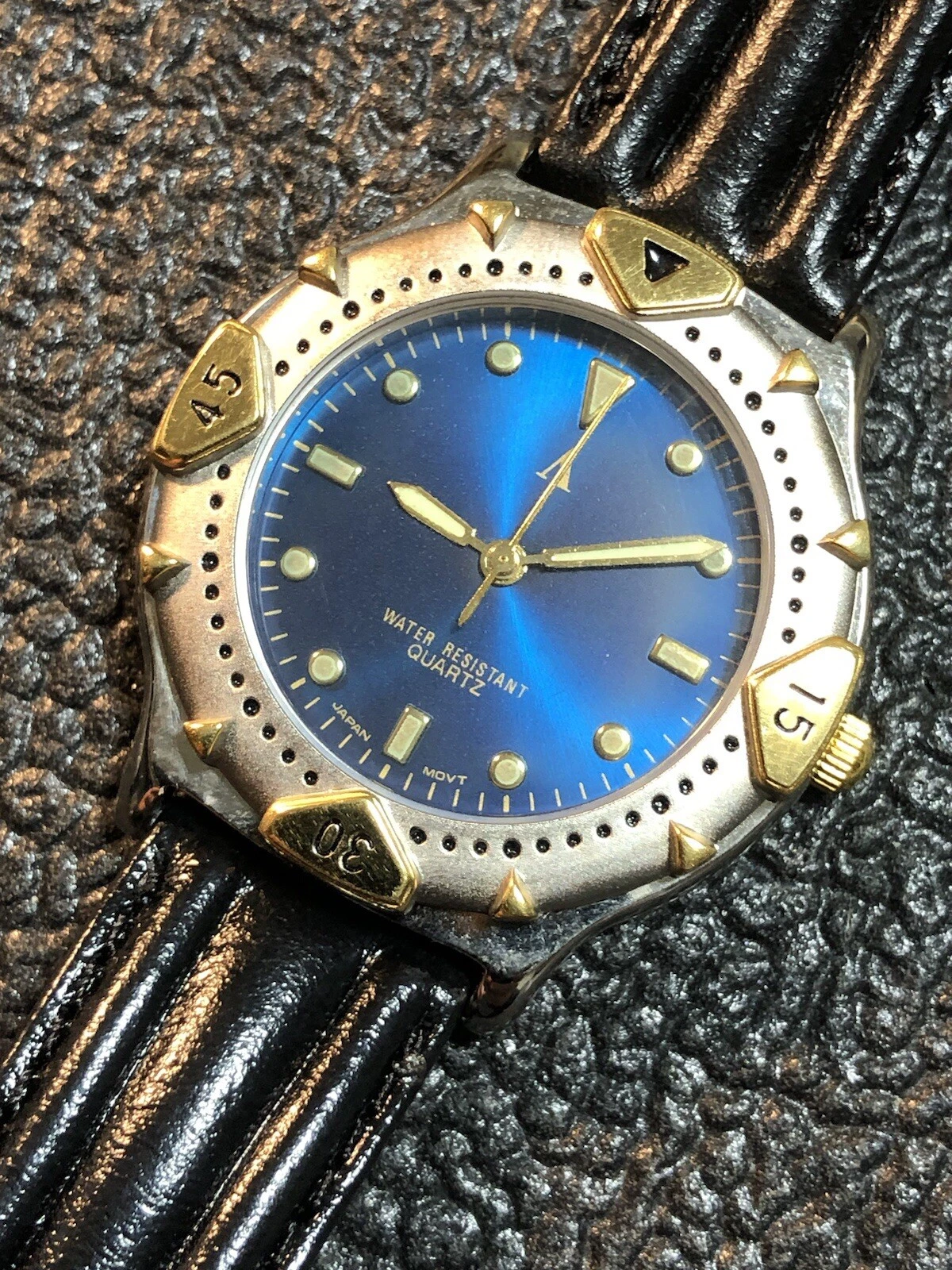 Vintage Avon Watch Blue Dial Silver & Gold Tone Leather Band Luminous Hands 37mm