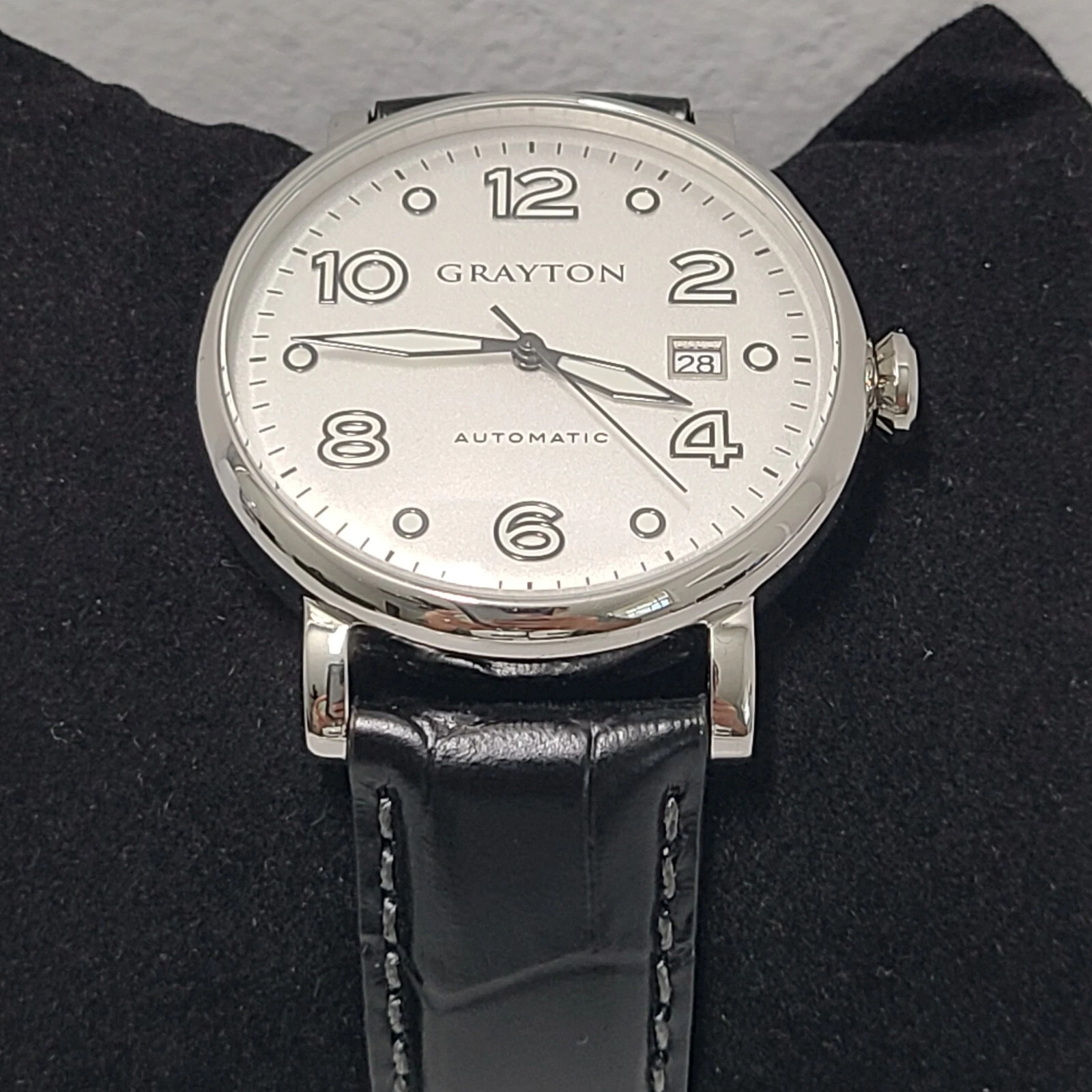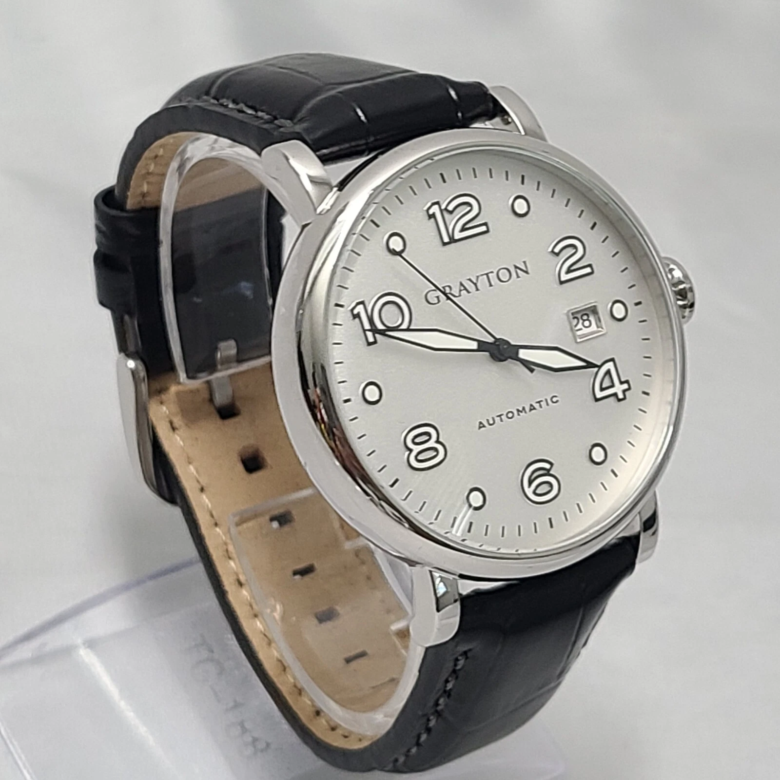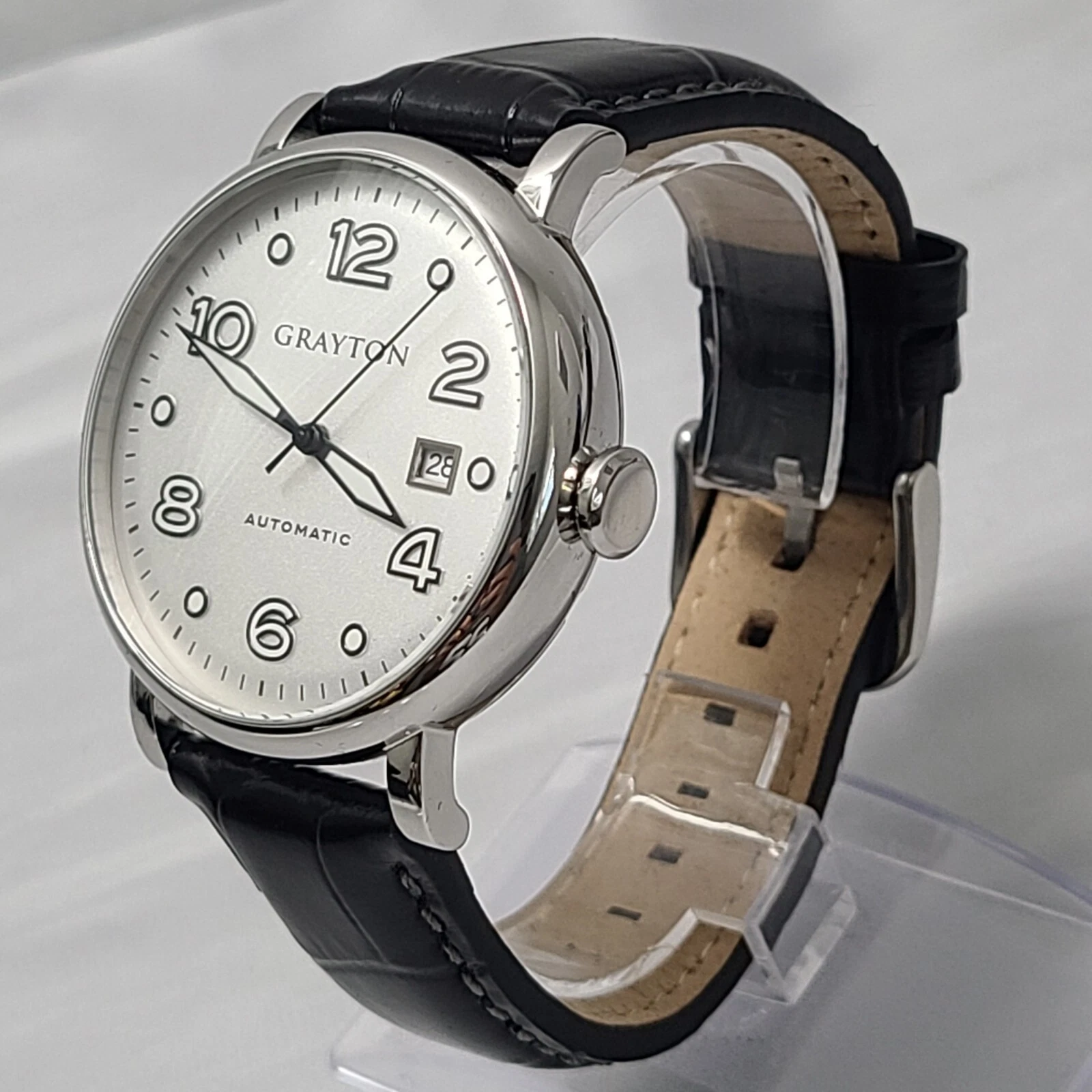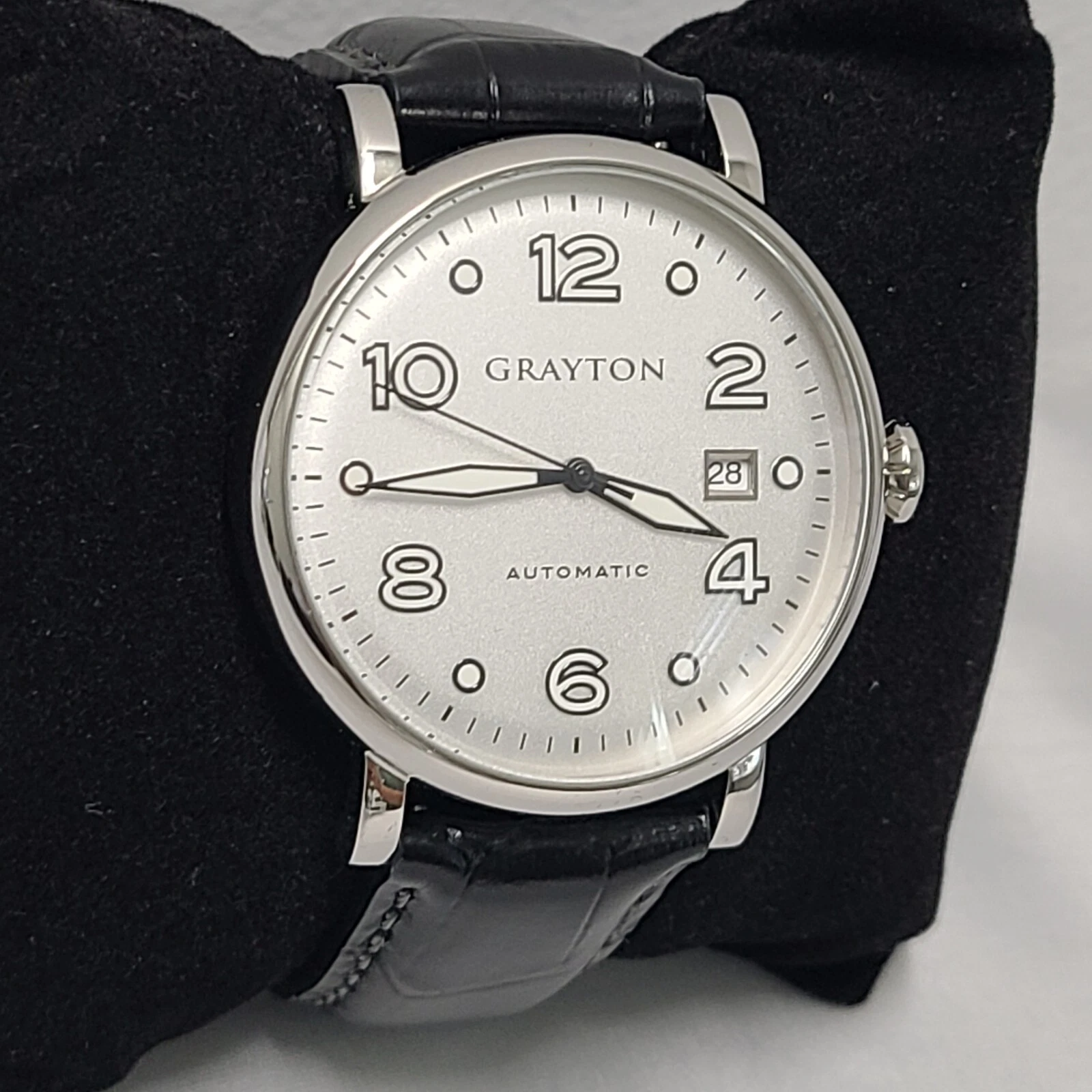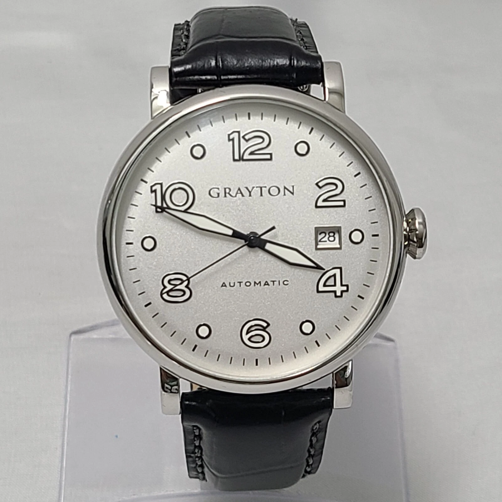 Grayton Silver dial Automatic watch 44mm Black Leather Strap Card NH35A 24 JEWEL