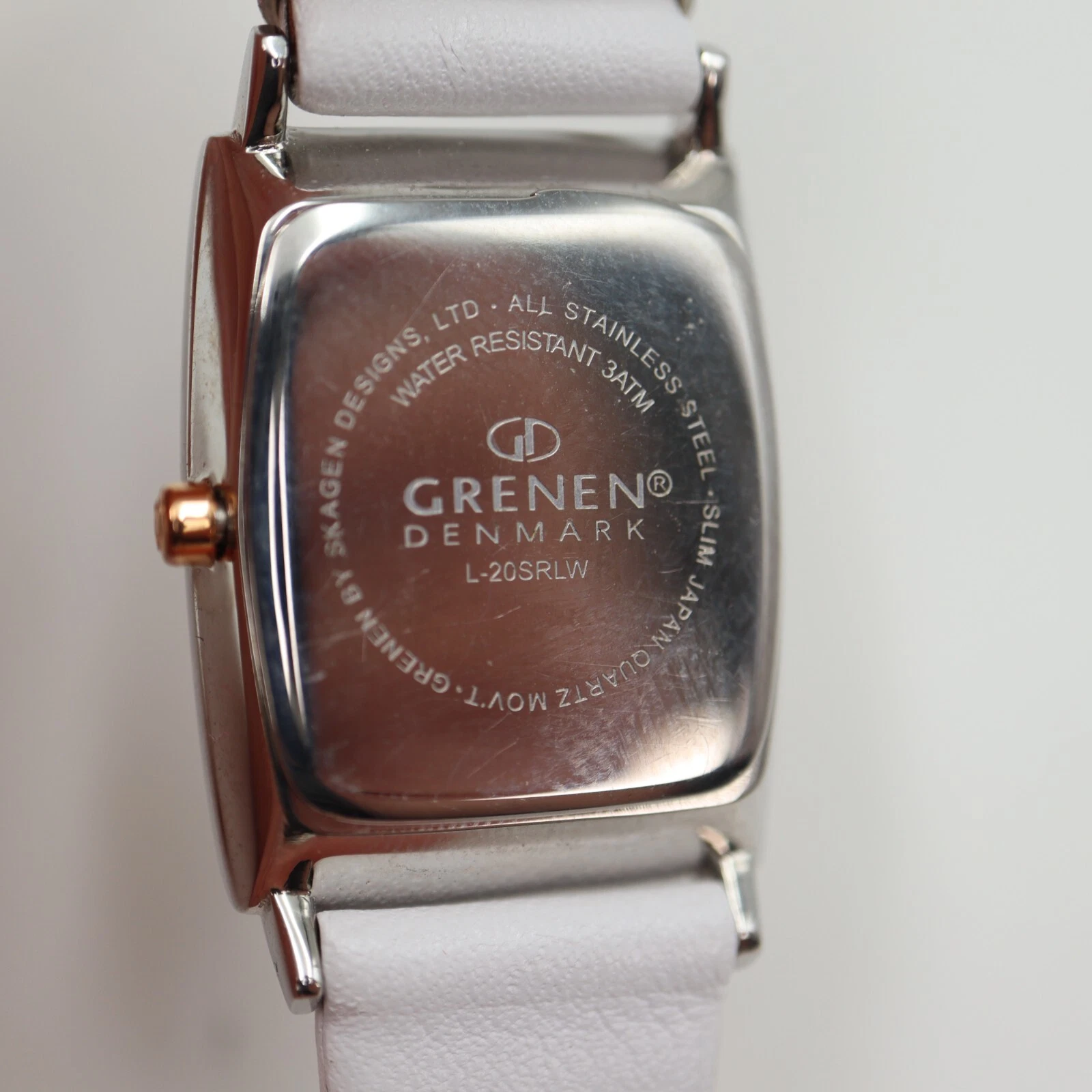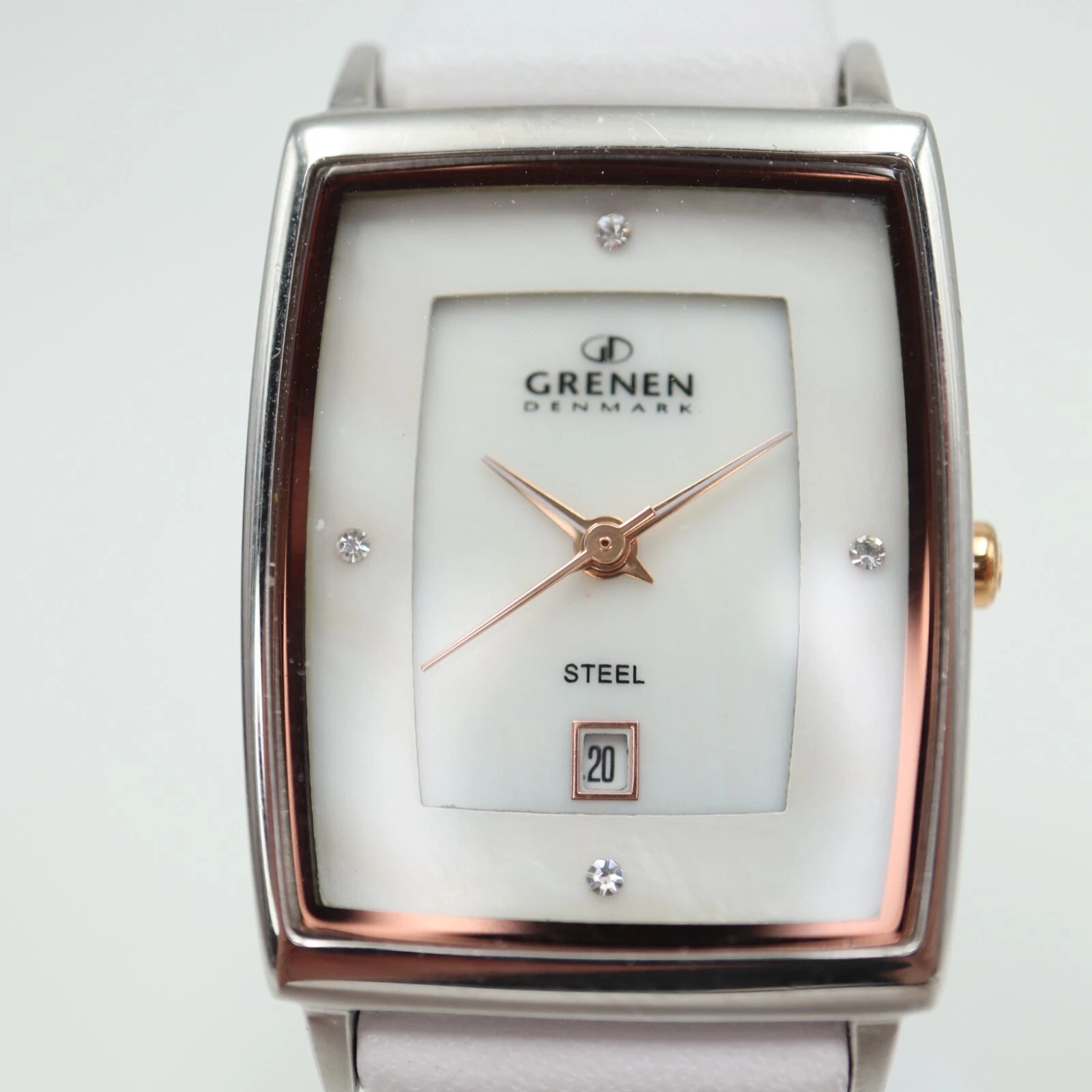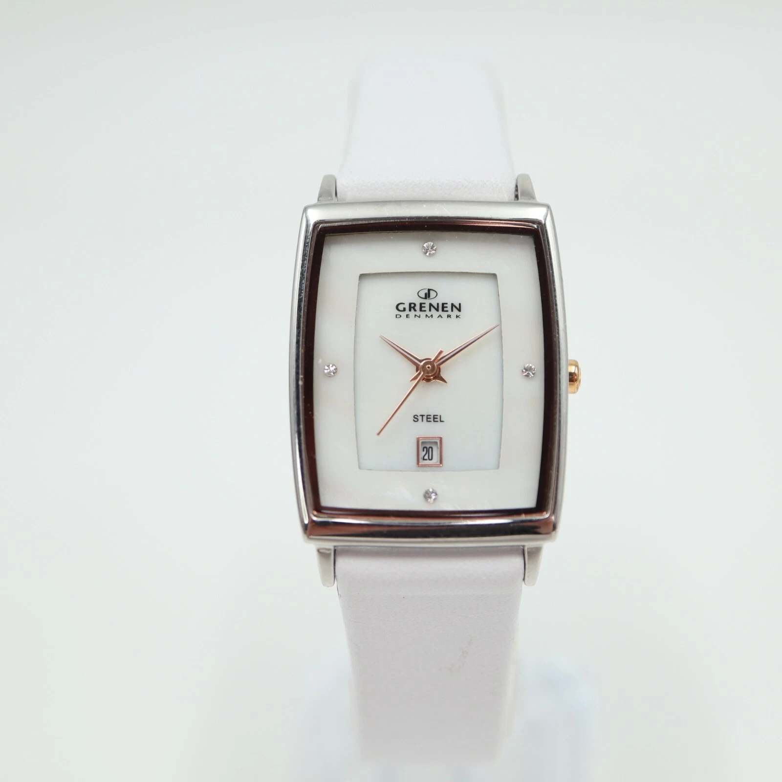 Grenen Denmark Womens 23mm MOP Barrel Date Dial White Leather w New Battery
