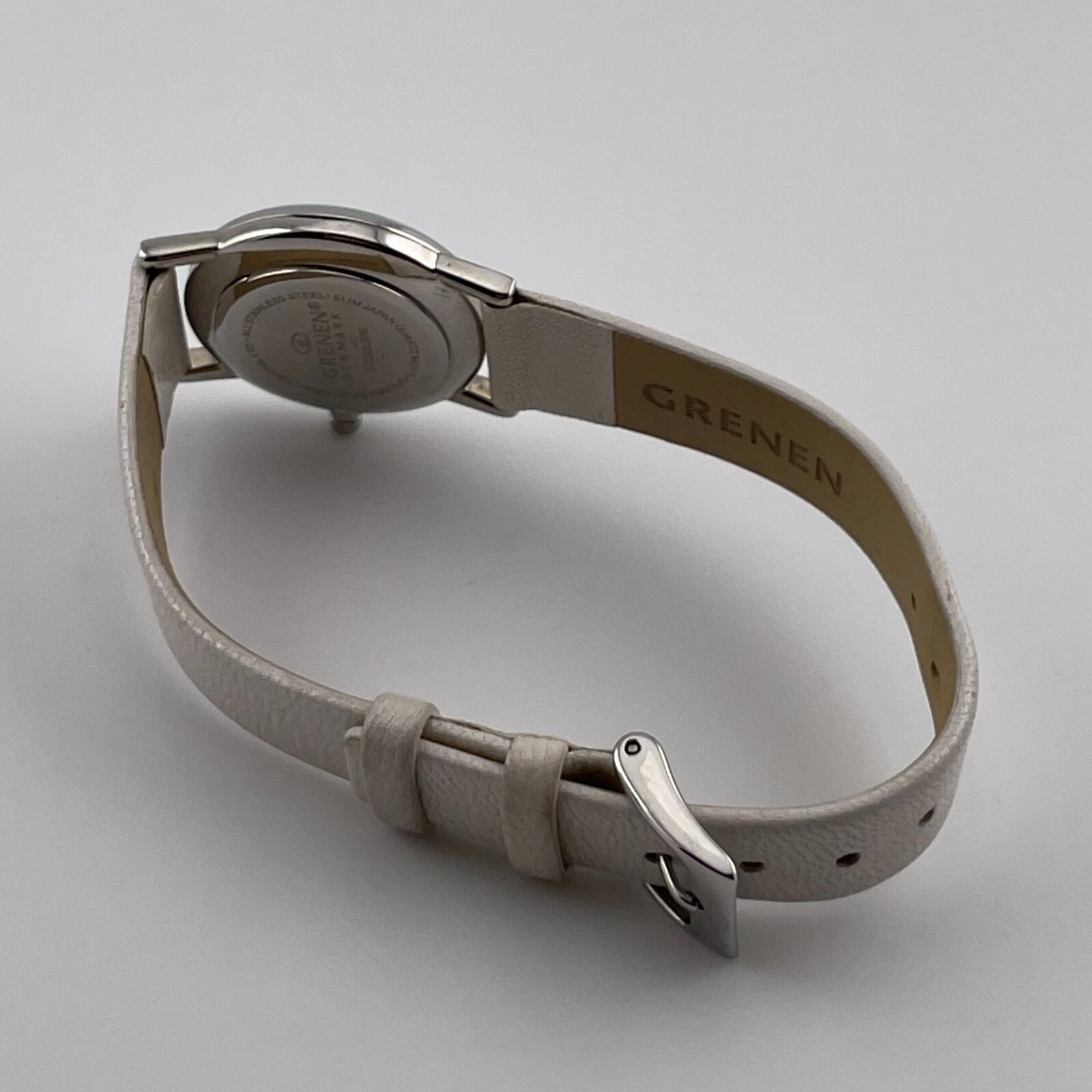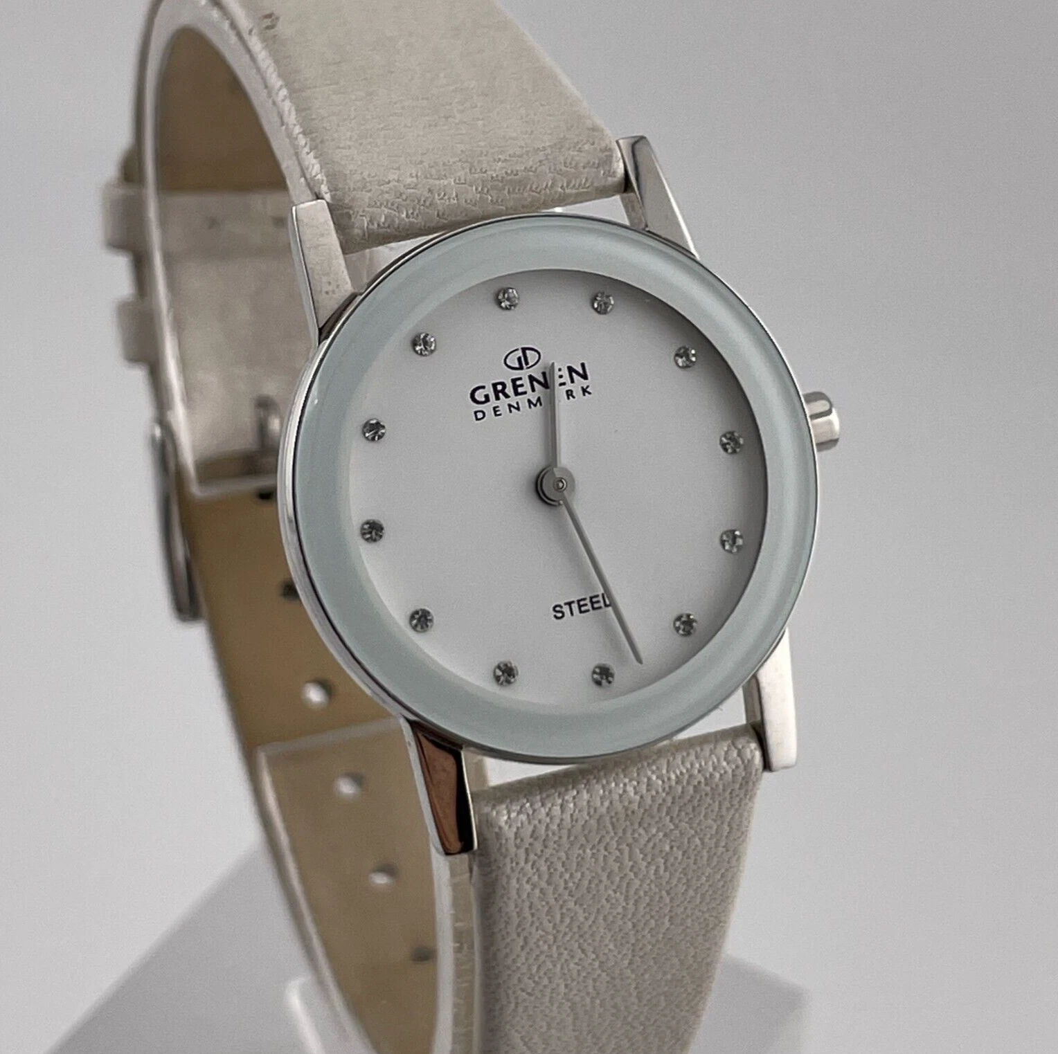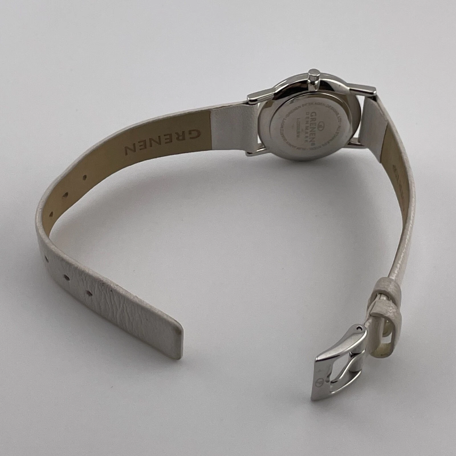 Grenen Denmark Watch Womens 27mm Case White Leather Band Quartz Two Hands Analog