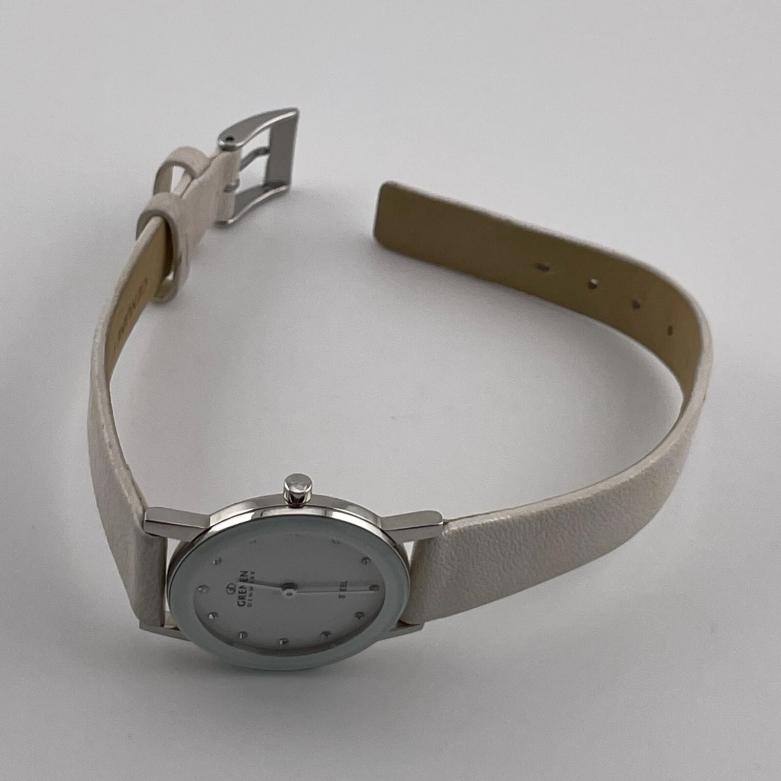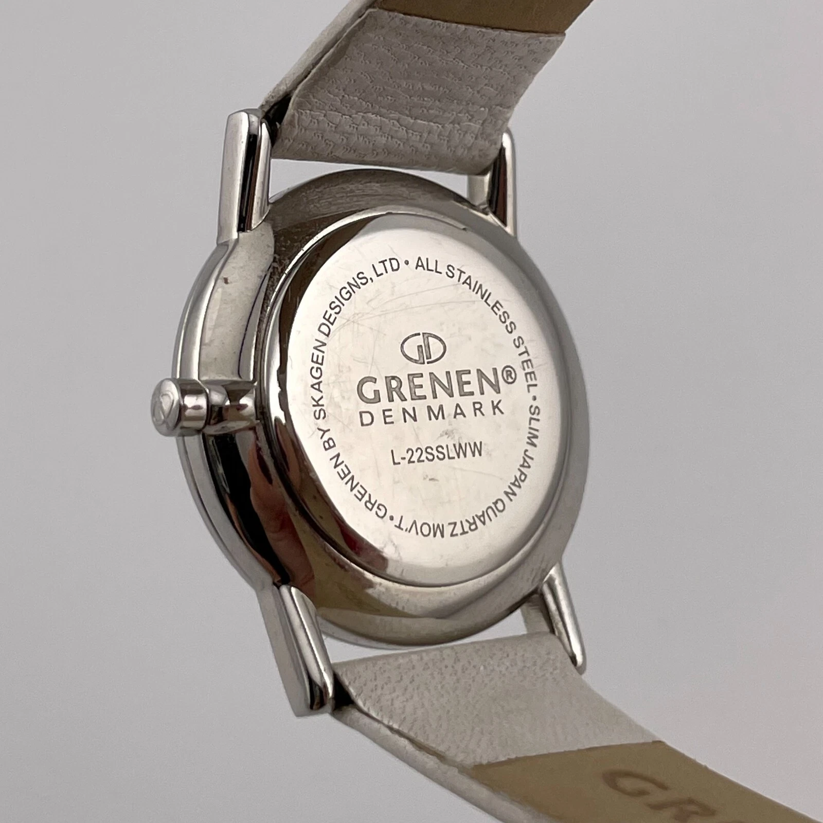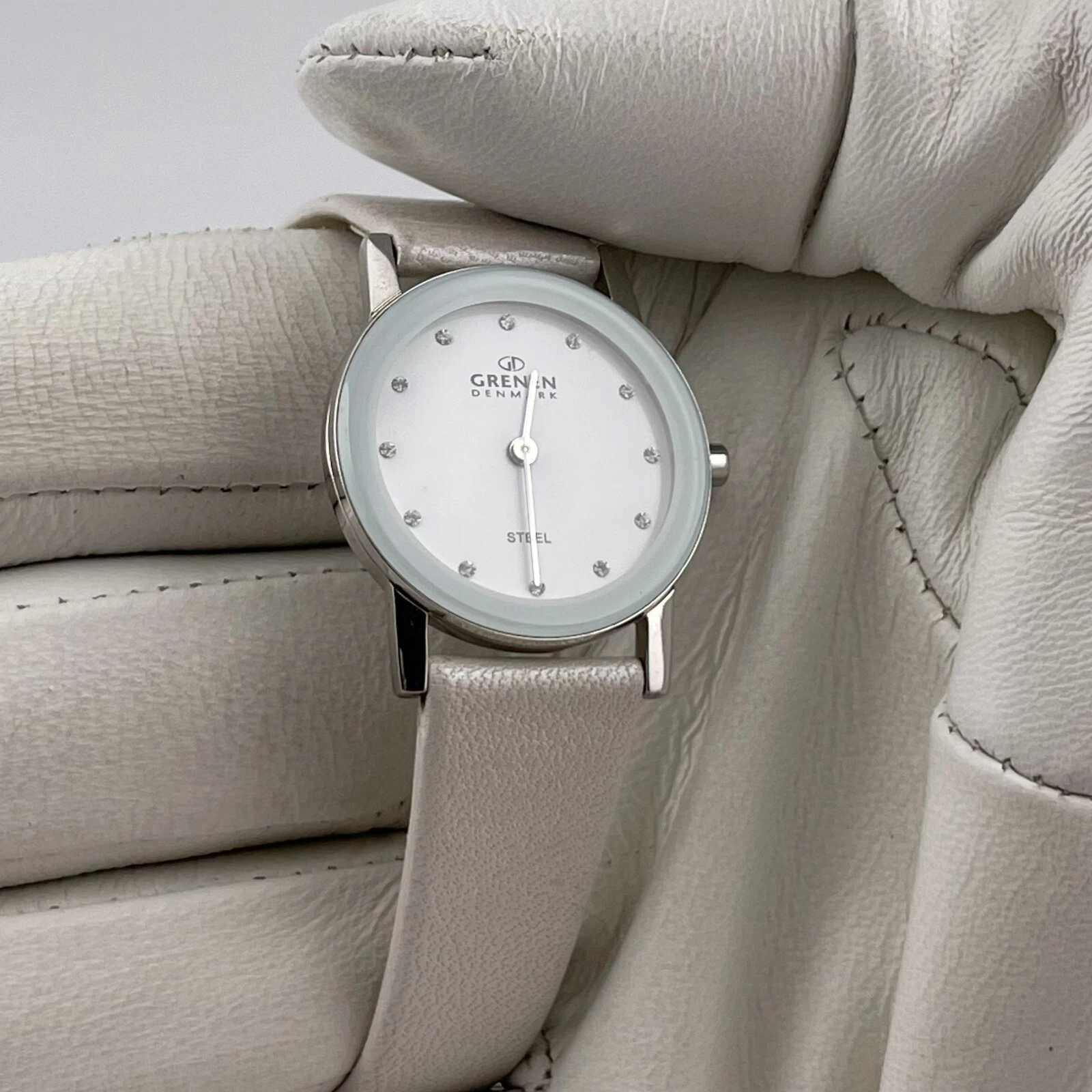 Grenen Denmark Watch Womens 27mm Case White Leather Band Quartz Two Hands Analog