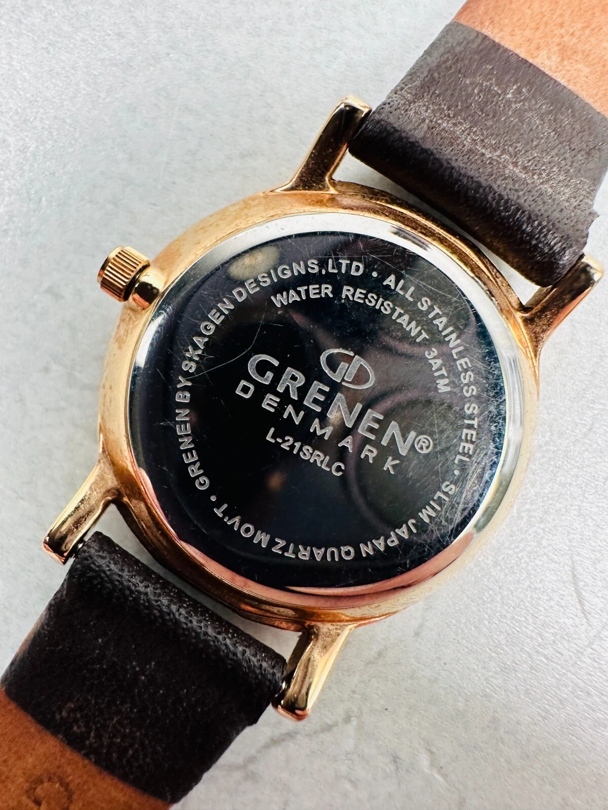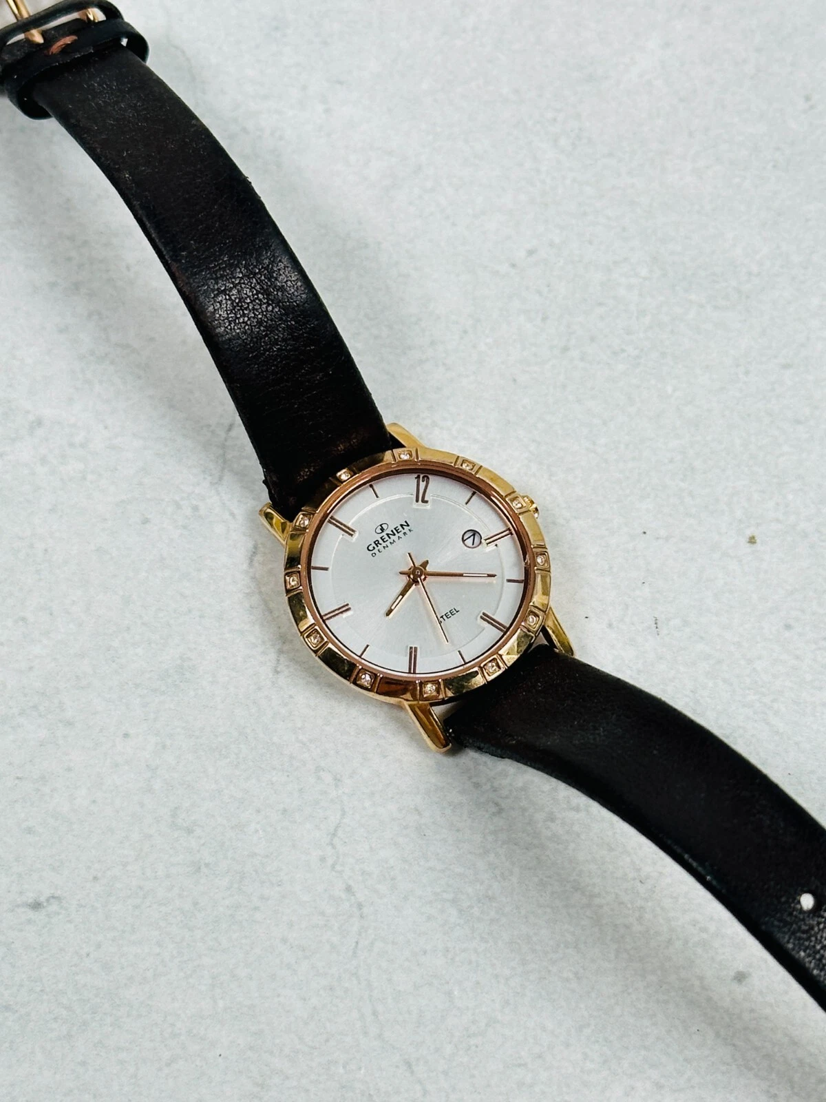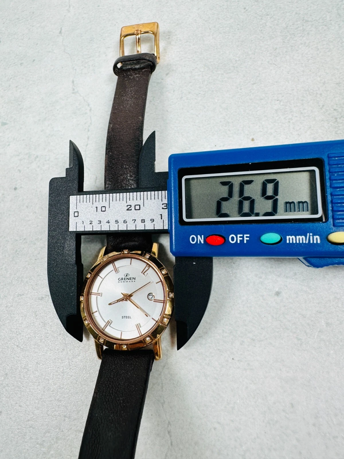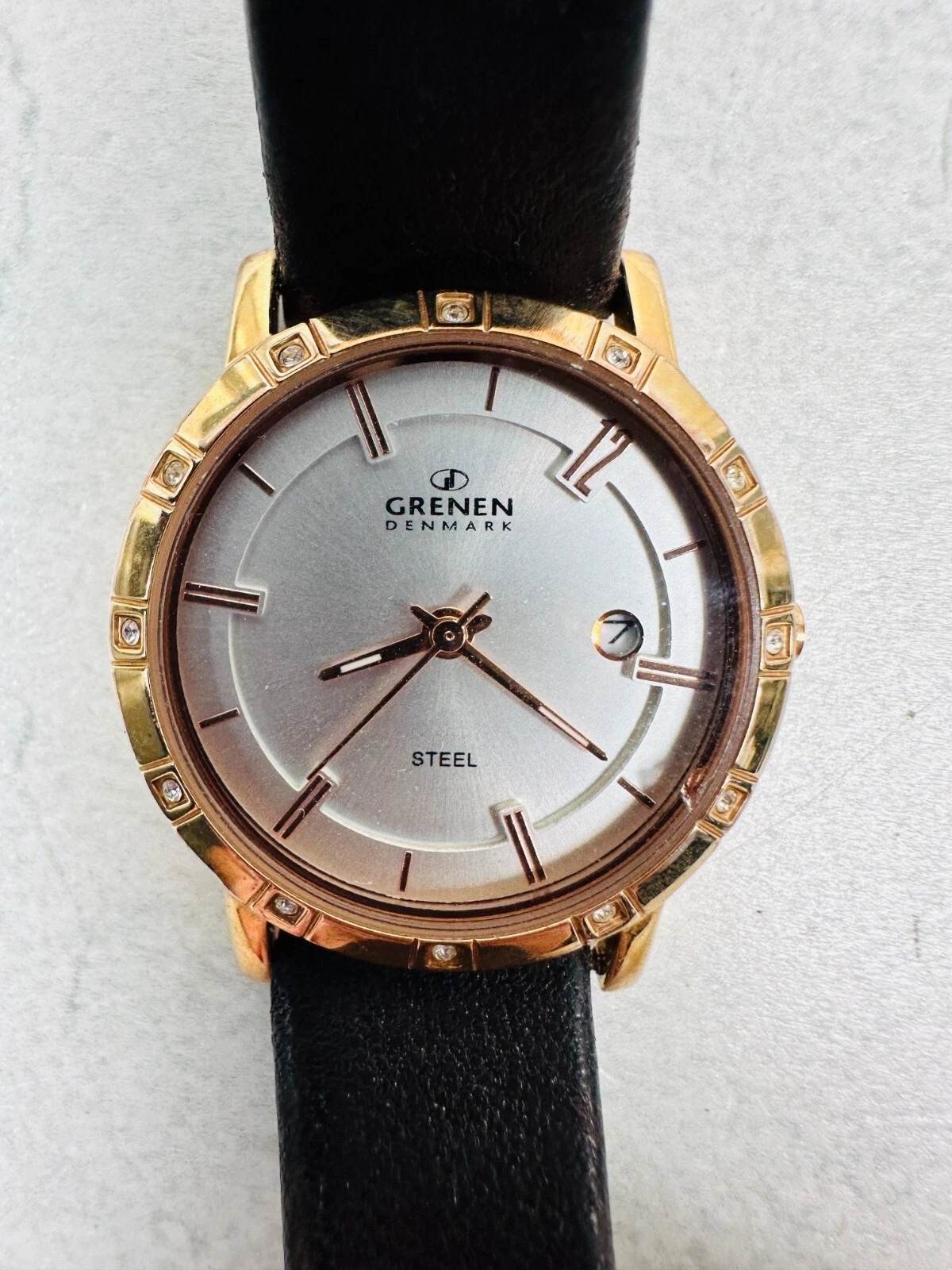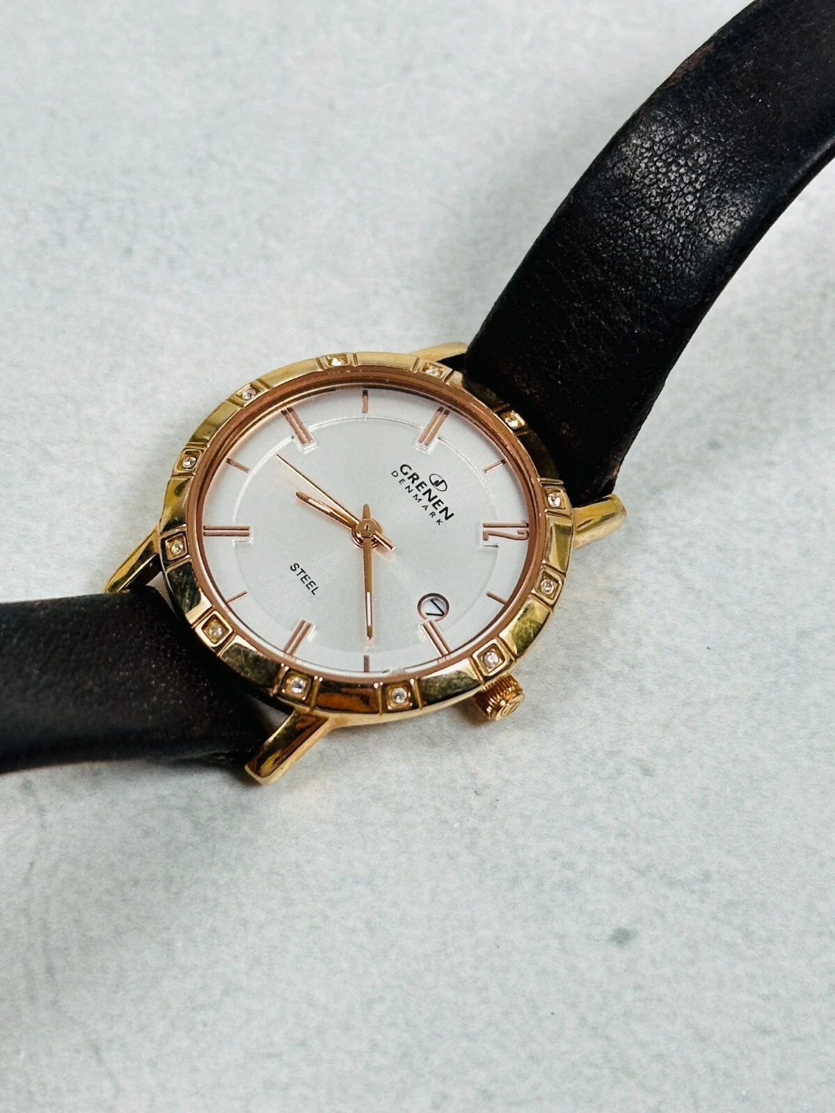 Grenen Denmark Watch Womens 27mm Date Gold Tone Crystal Bezel Steel New Battery