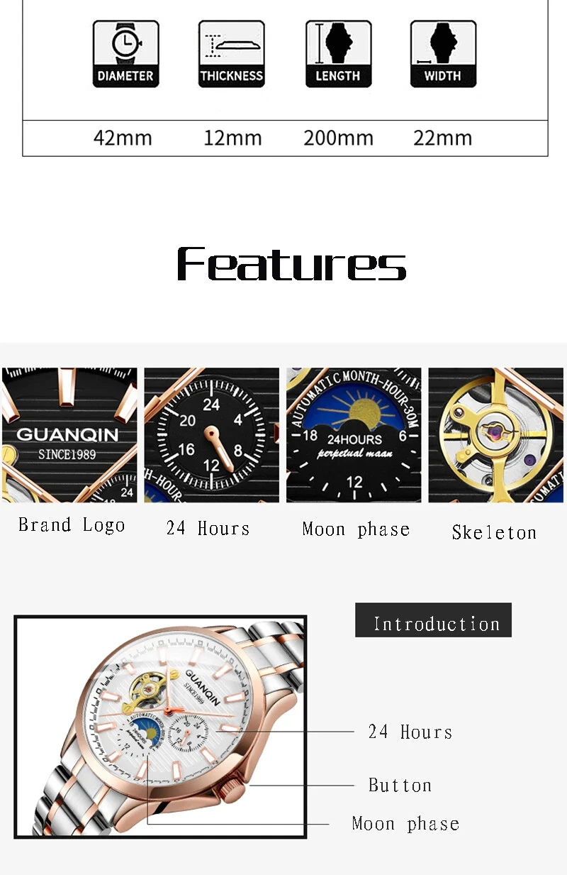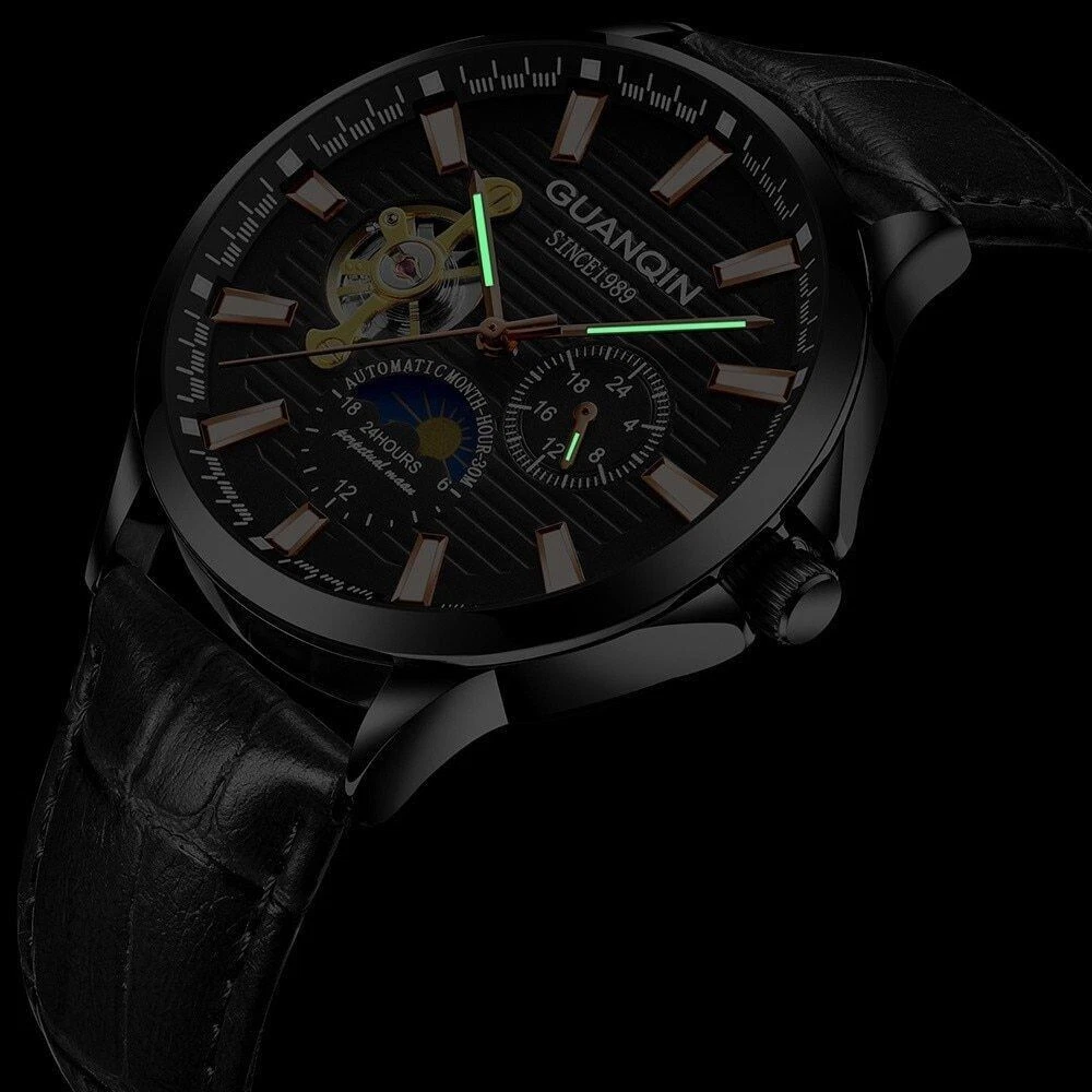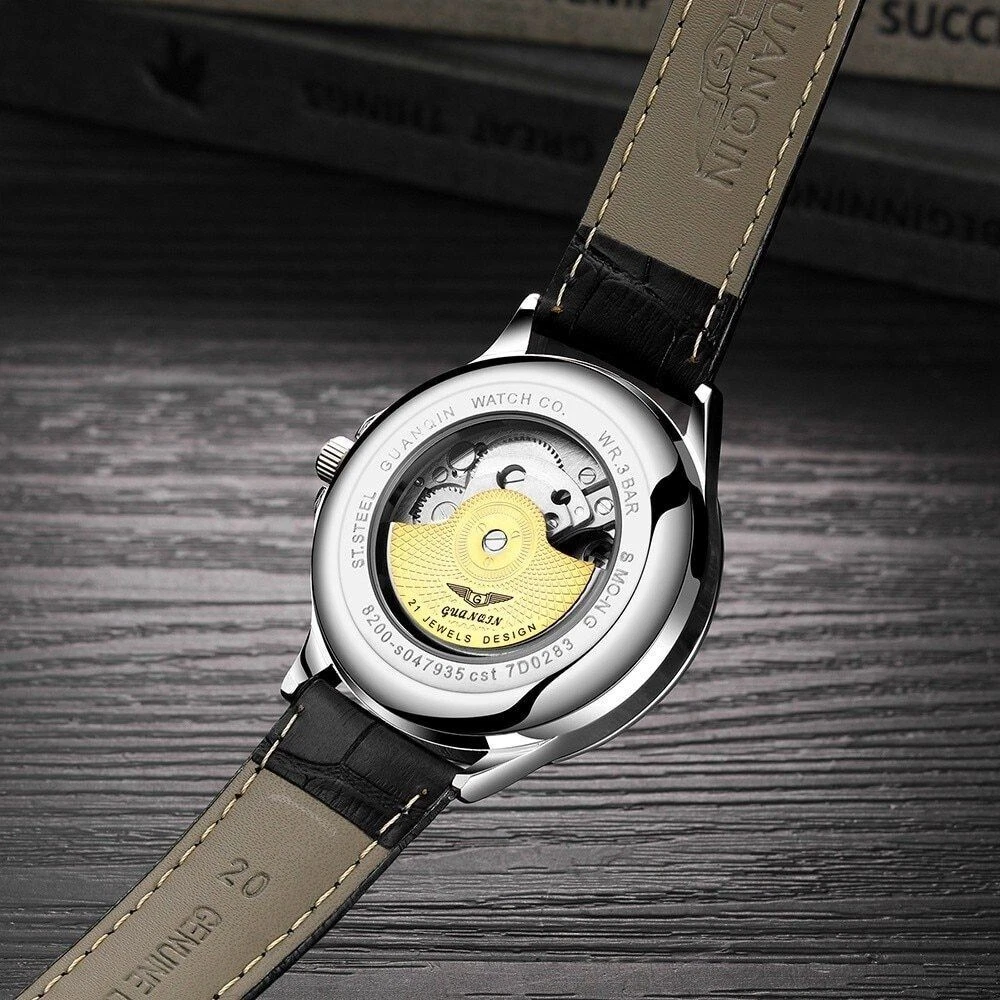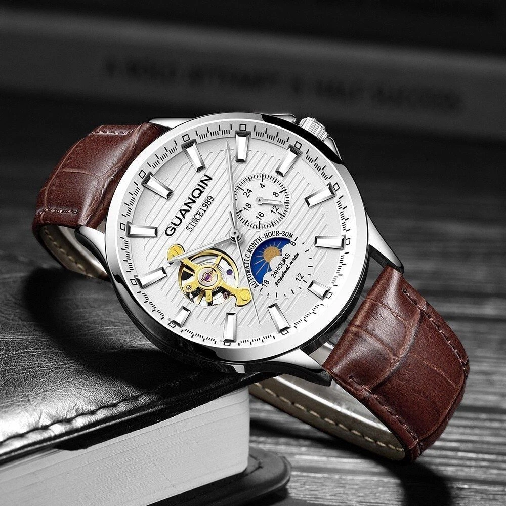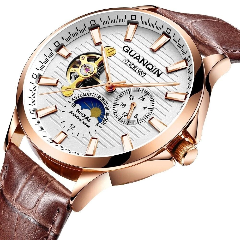 Automatic Mechanical GUANQIN Moon Phase Month Hour Sapphire Crystal White & Gold