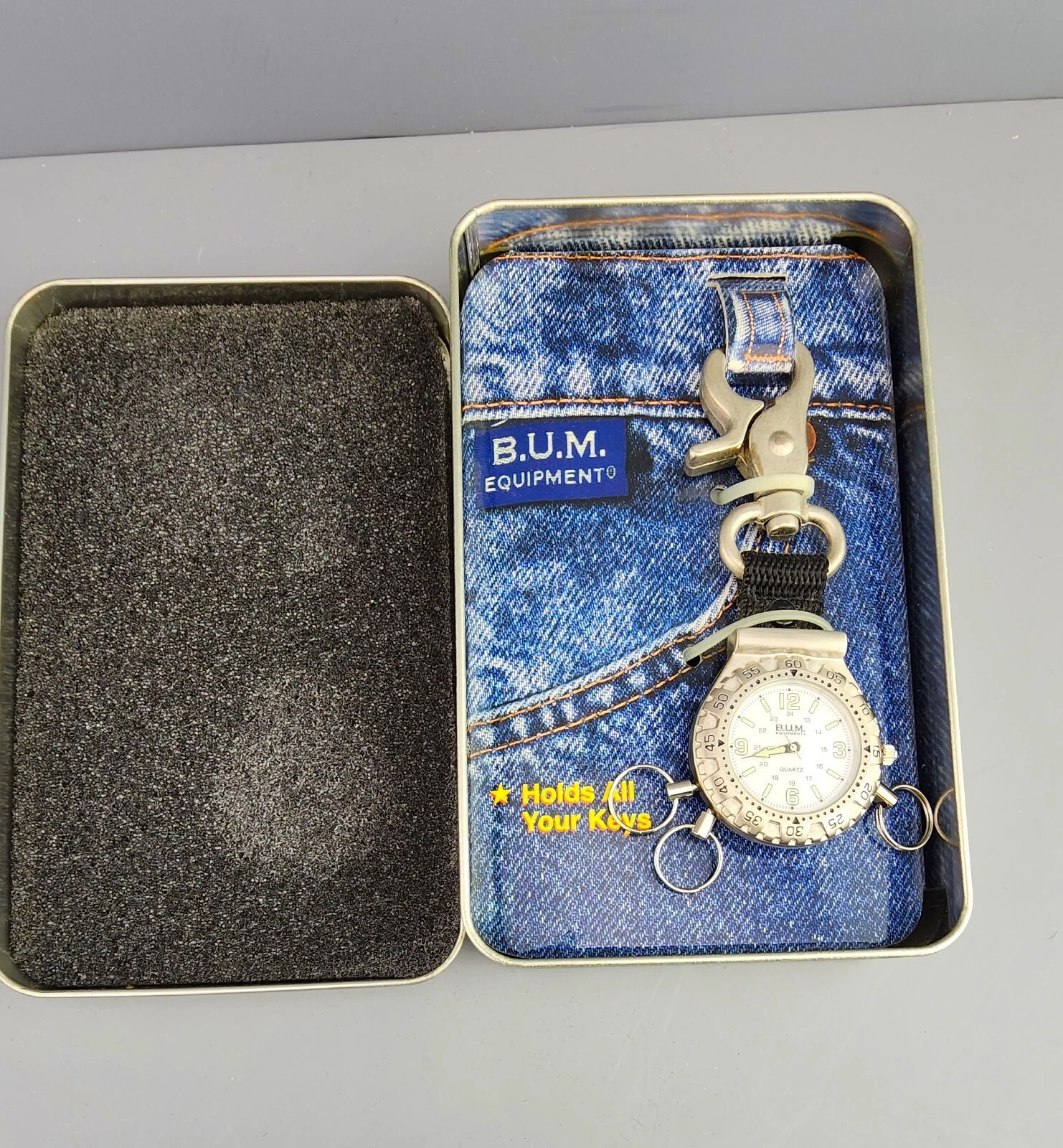 VTG Bum Equipment Dial silver Tone Round Case Clip Pocket Watch w/ Tin NEW