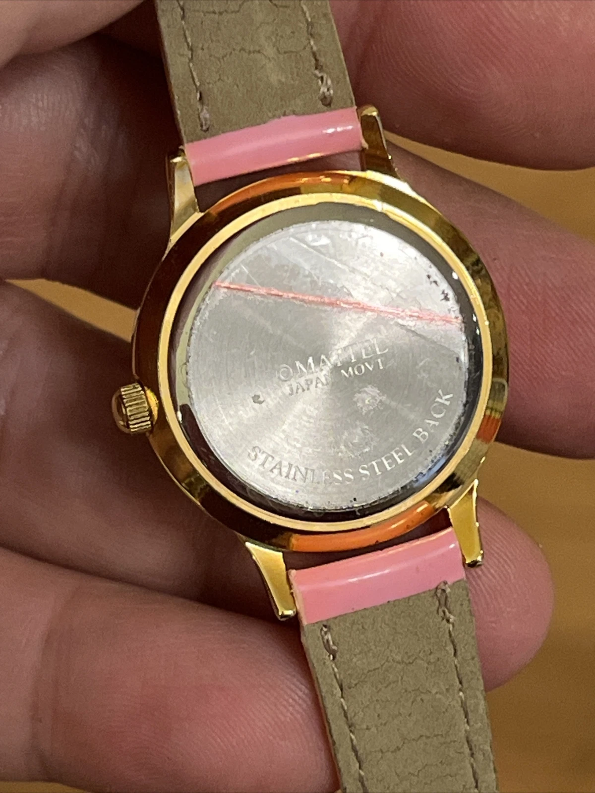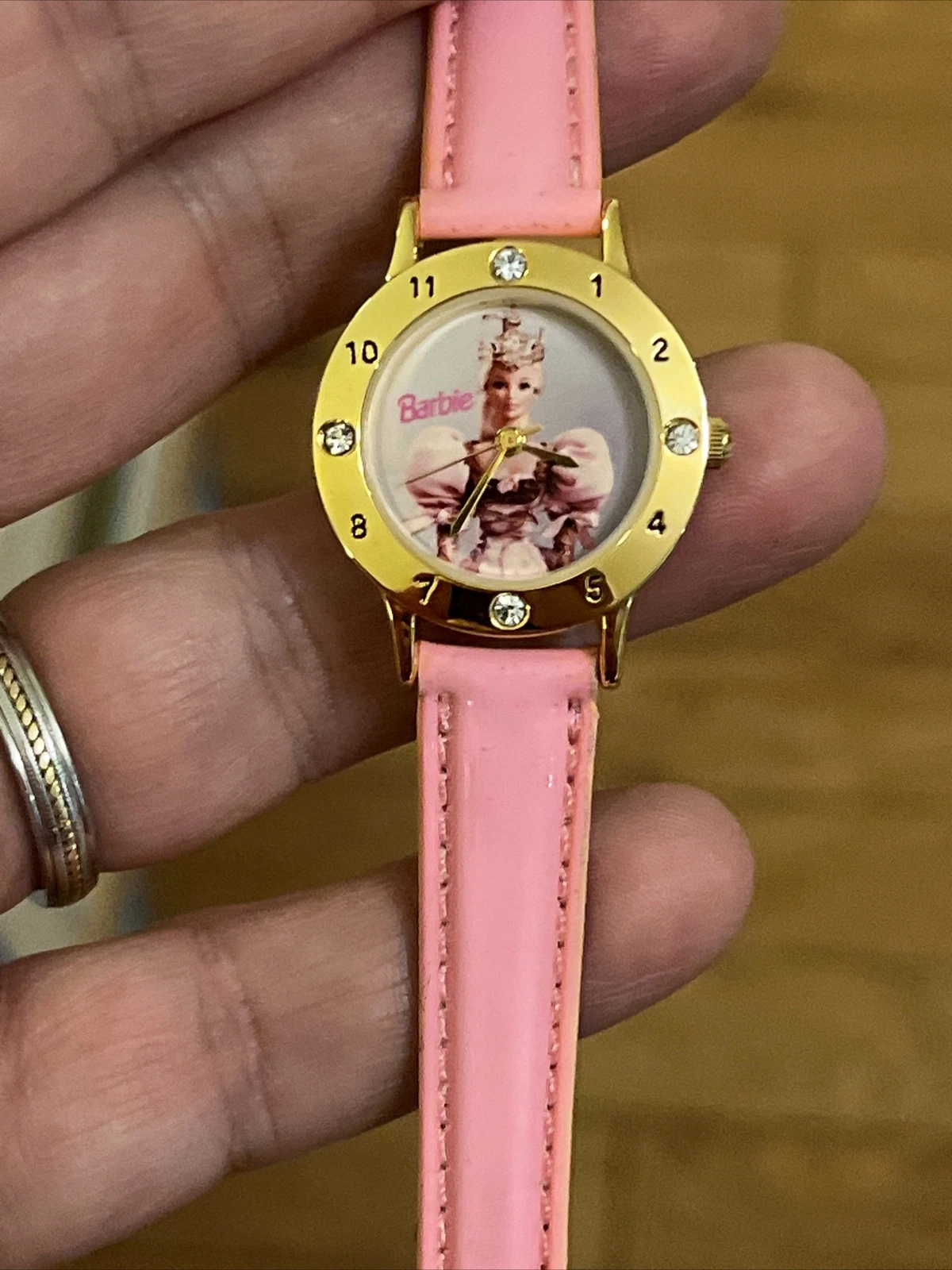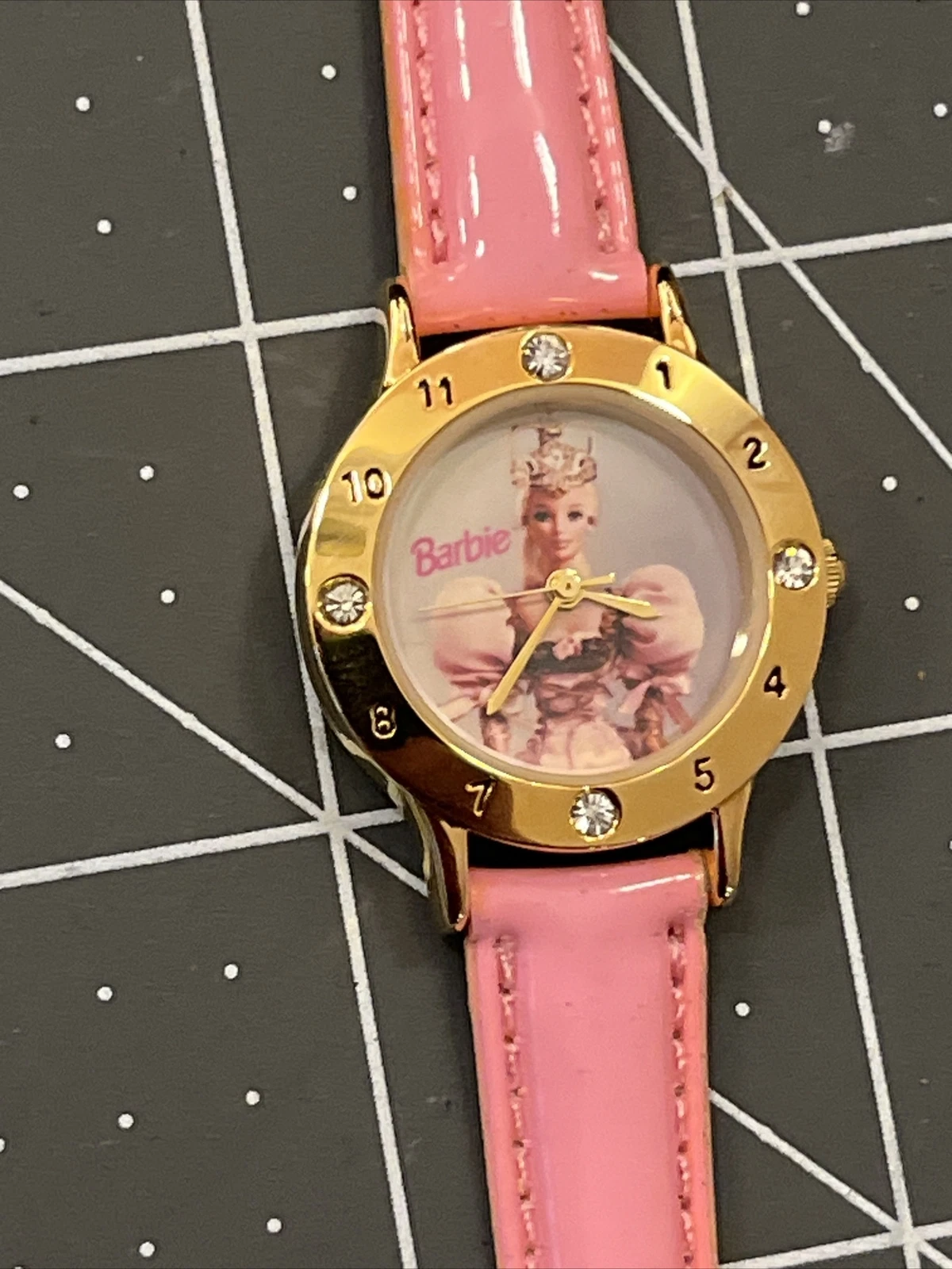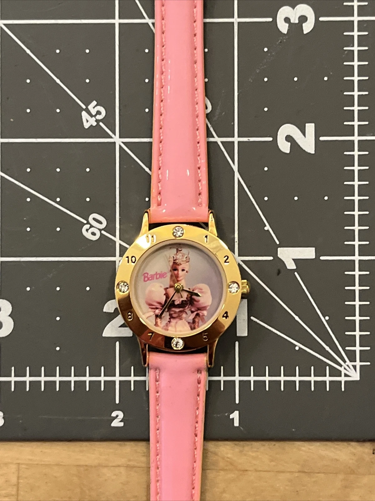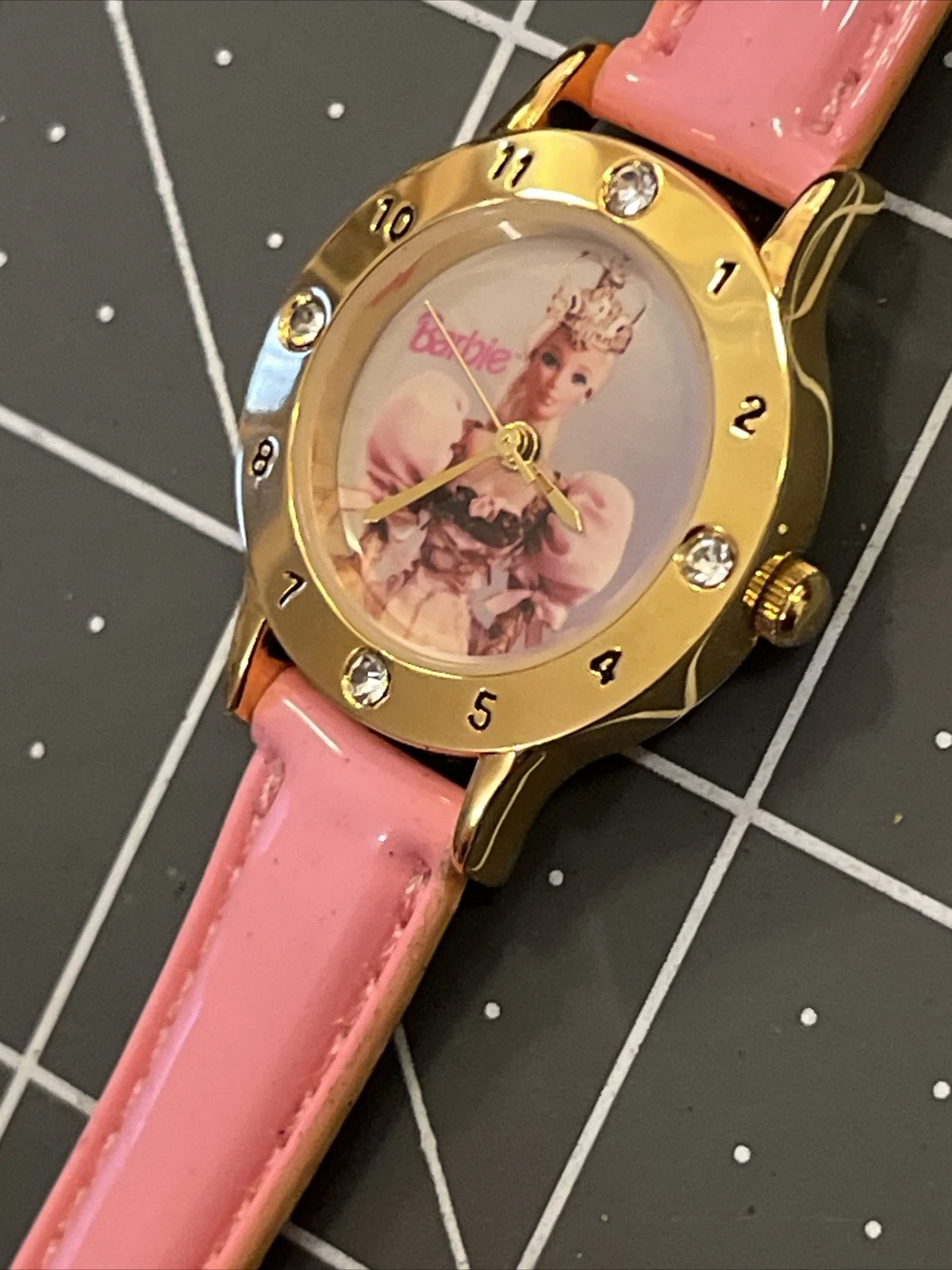 VTG Mattel Barbie Wristwatch Watch Gold Tone Case Bezel With Jewels Pink Band
