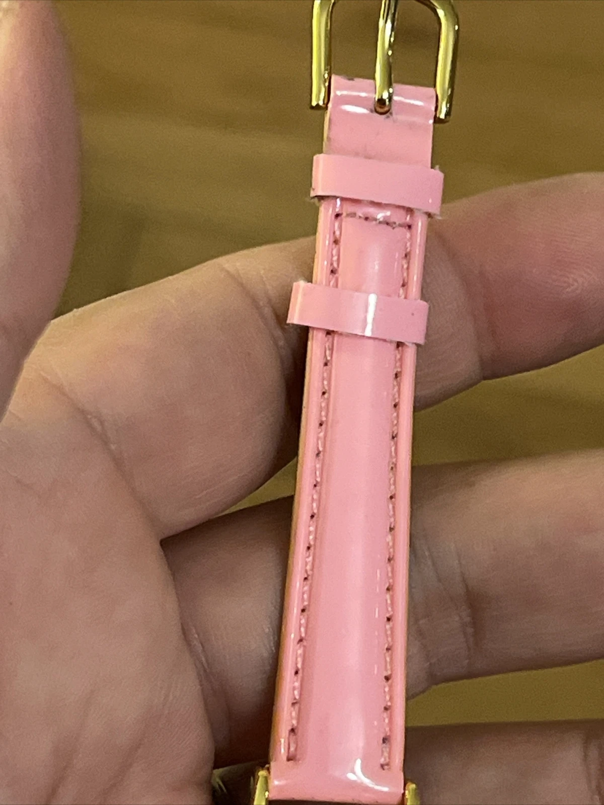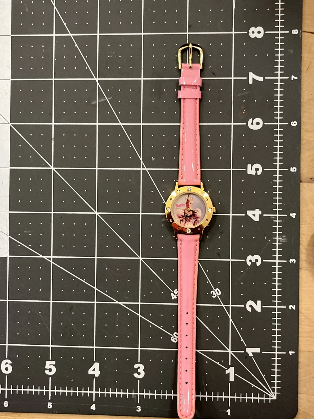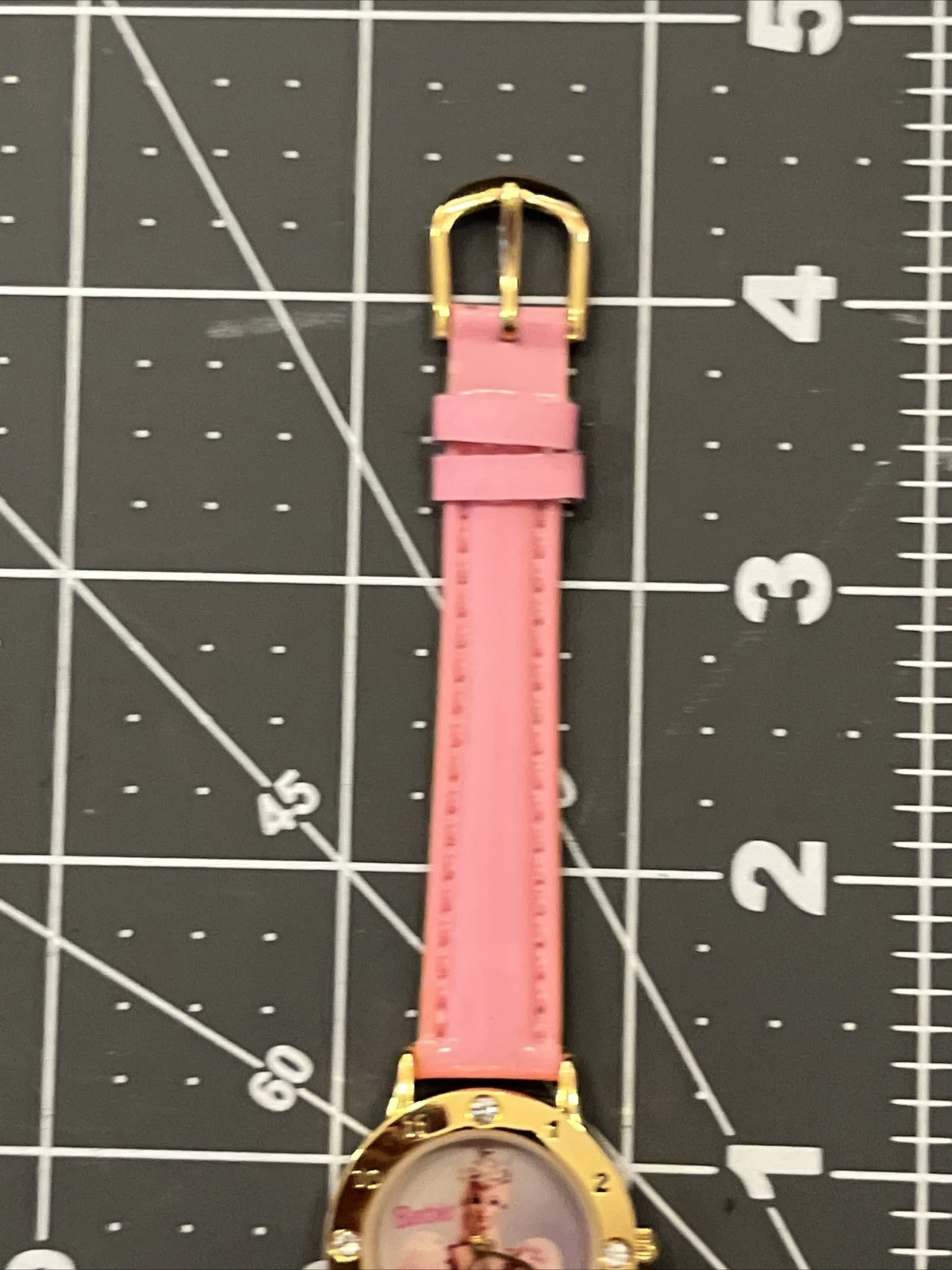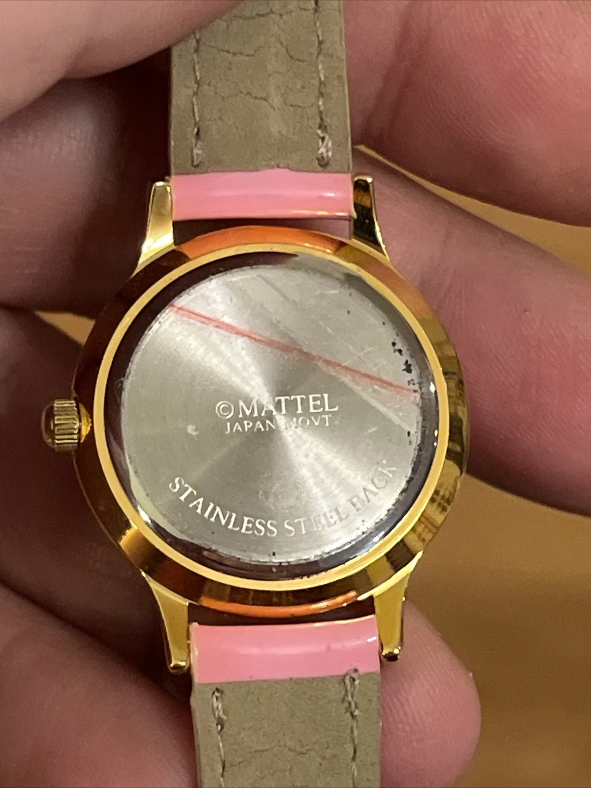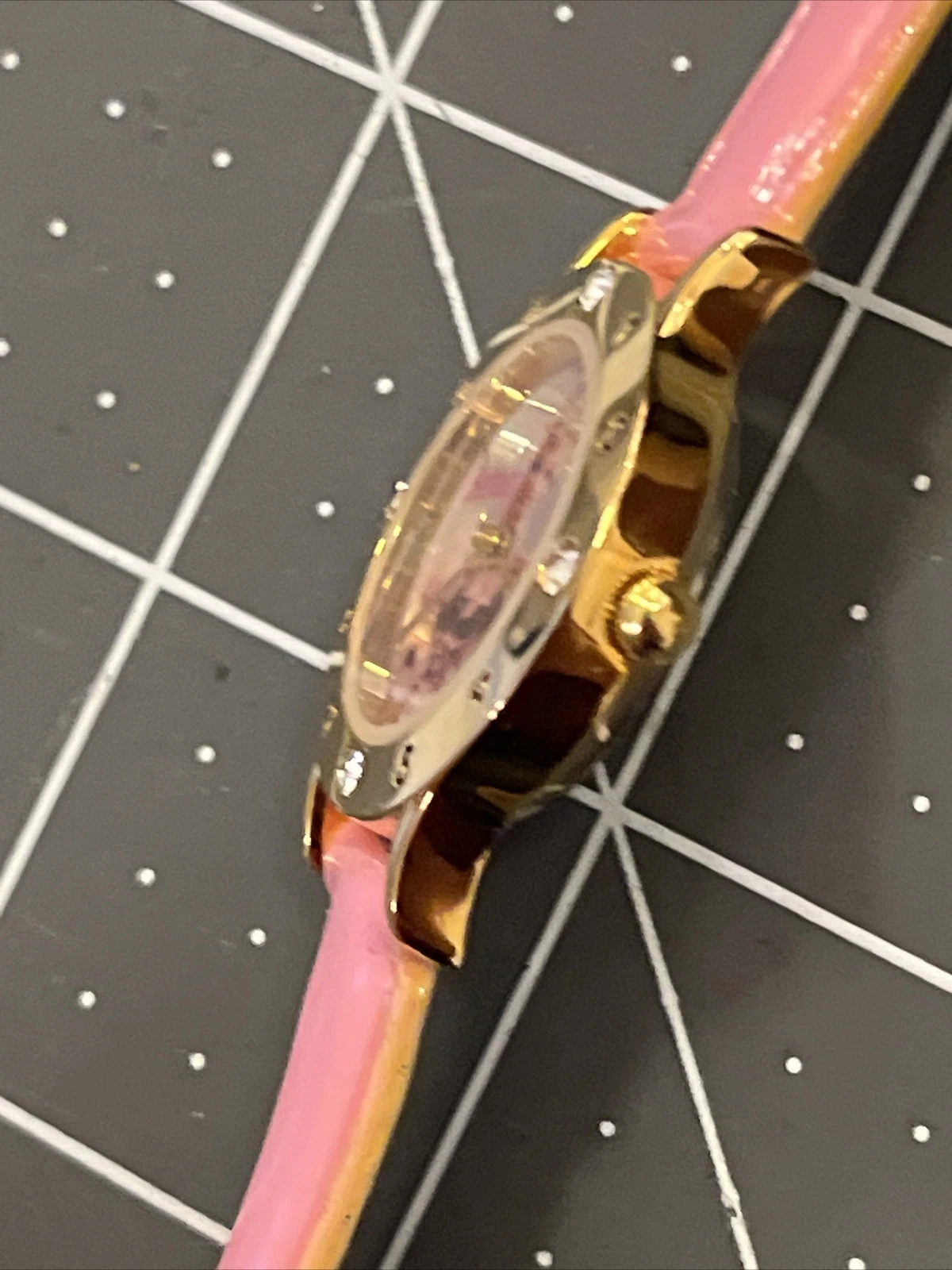 VTG Mattel Barbie Wristwatch Watch Gold Tone Case Bezel With Jewels Pink Band