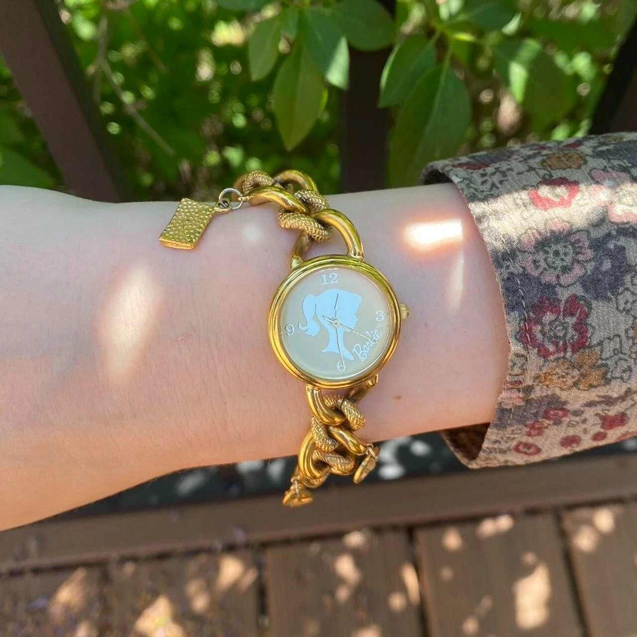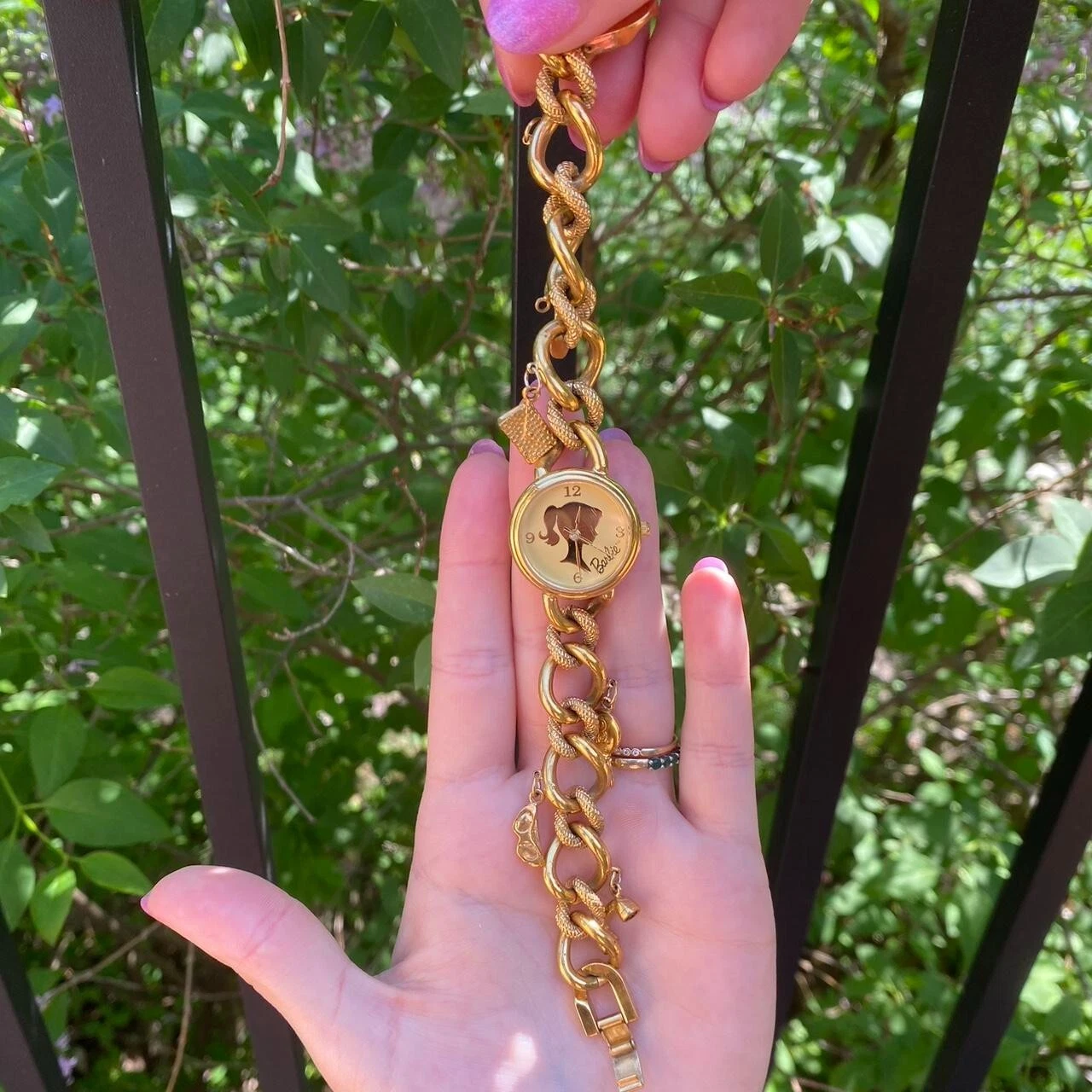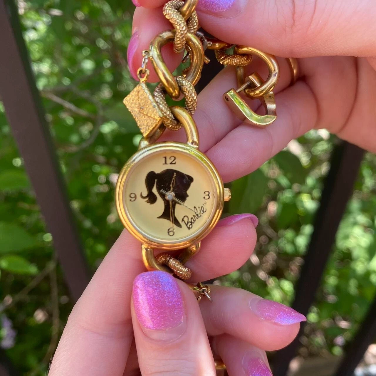 vintage gold charm barbie anniversary watch, fossil, mattel, 1994, coquette