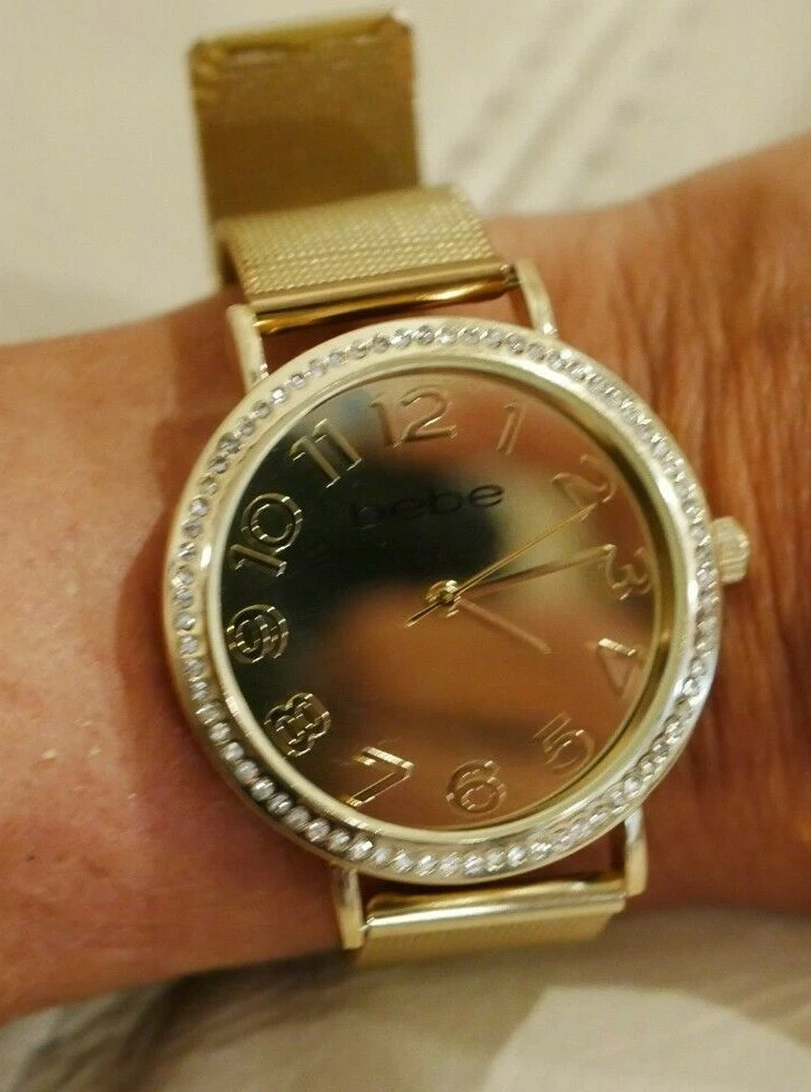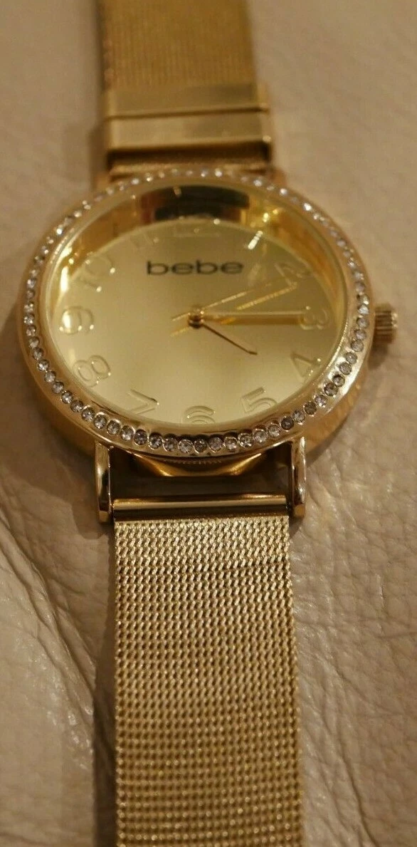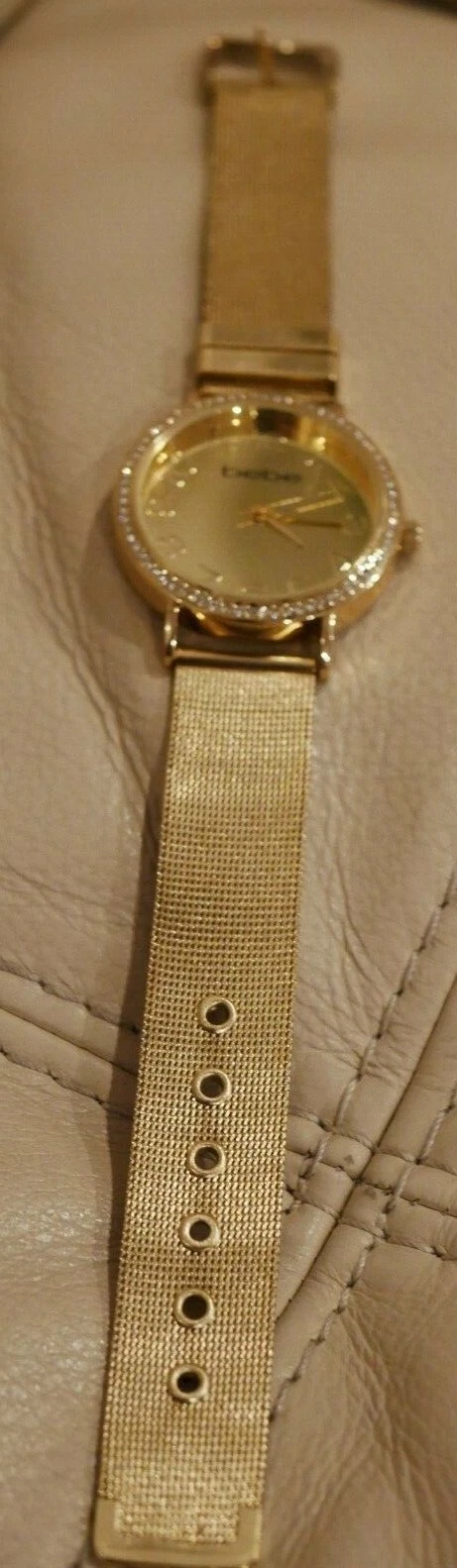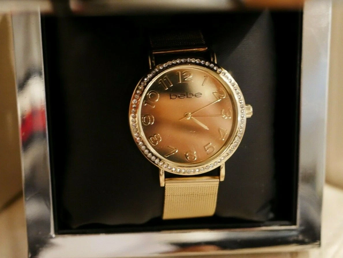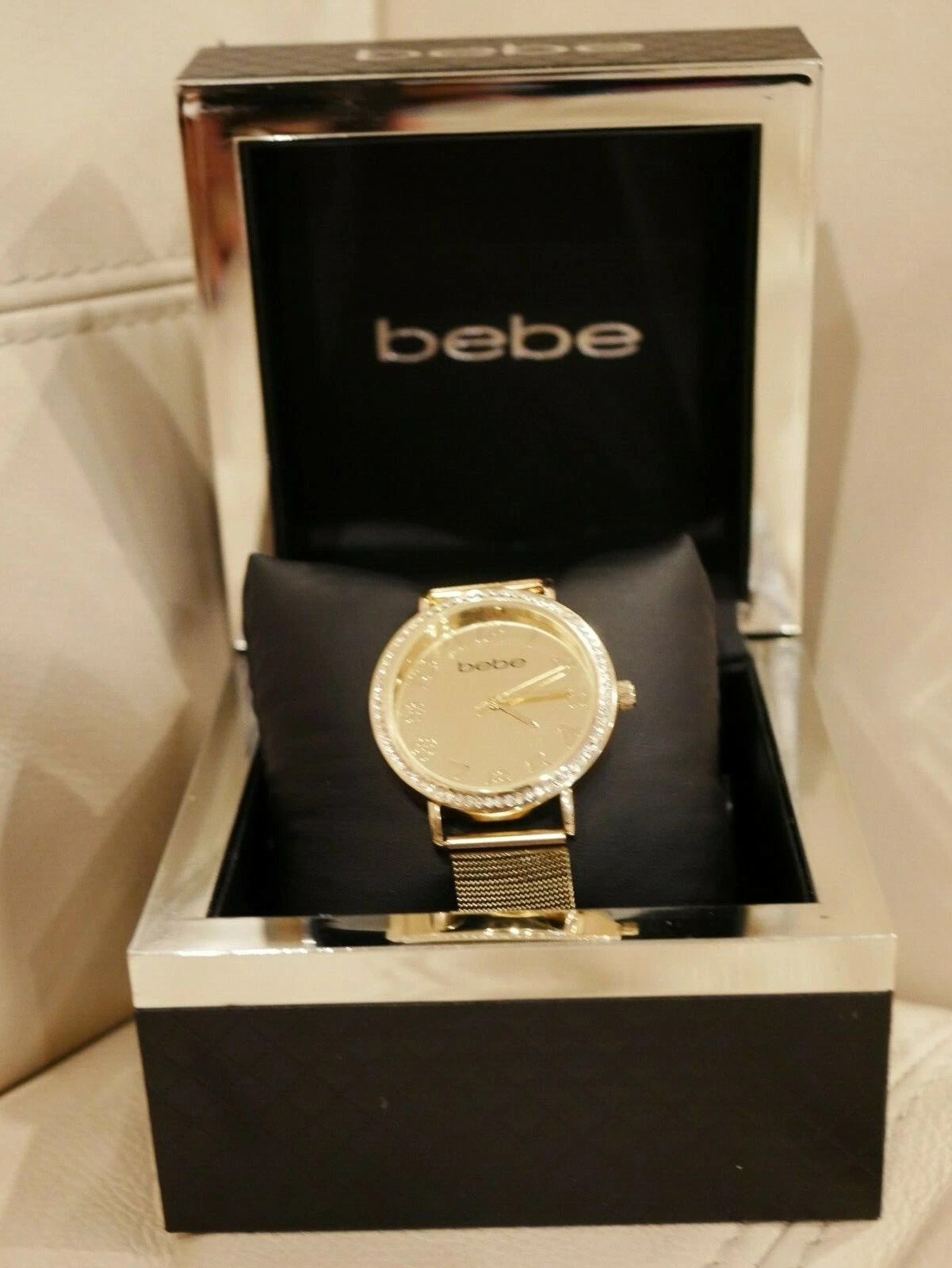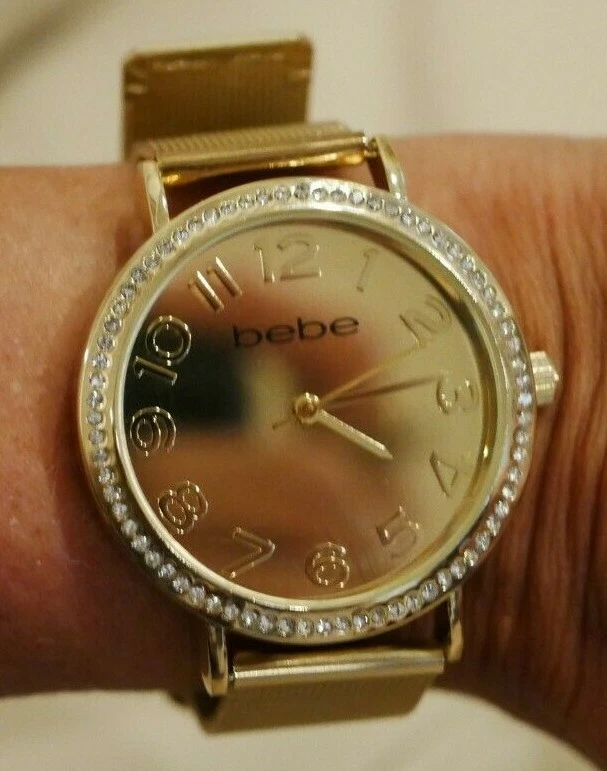 NEW WITH BOX WOMEN'S BEBE YELLOW GOLD WATCH RHINESTONES BUCKLE LARGE NUMBERS