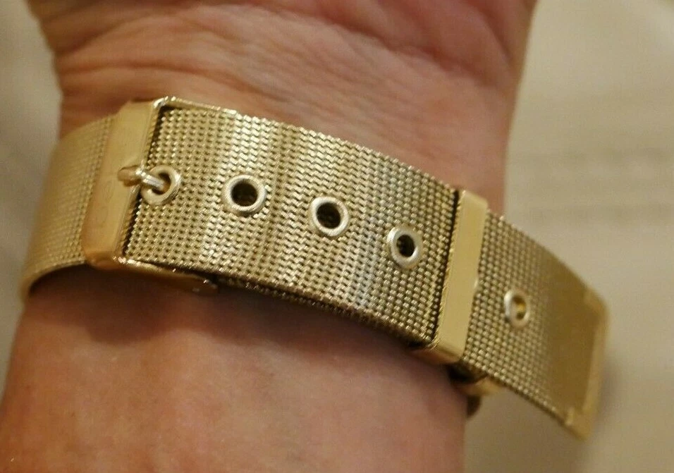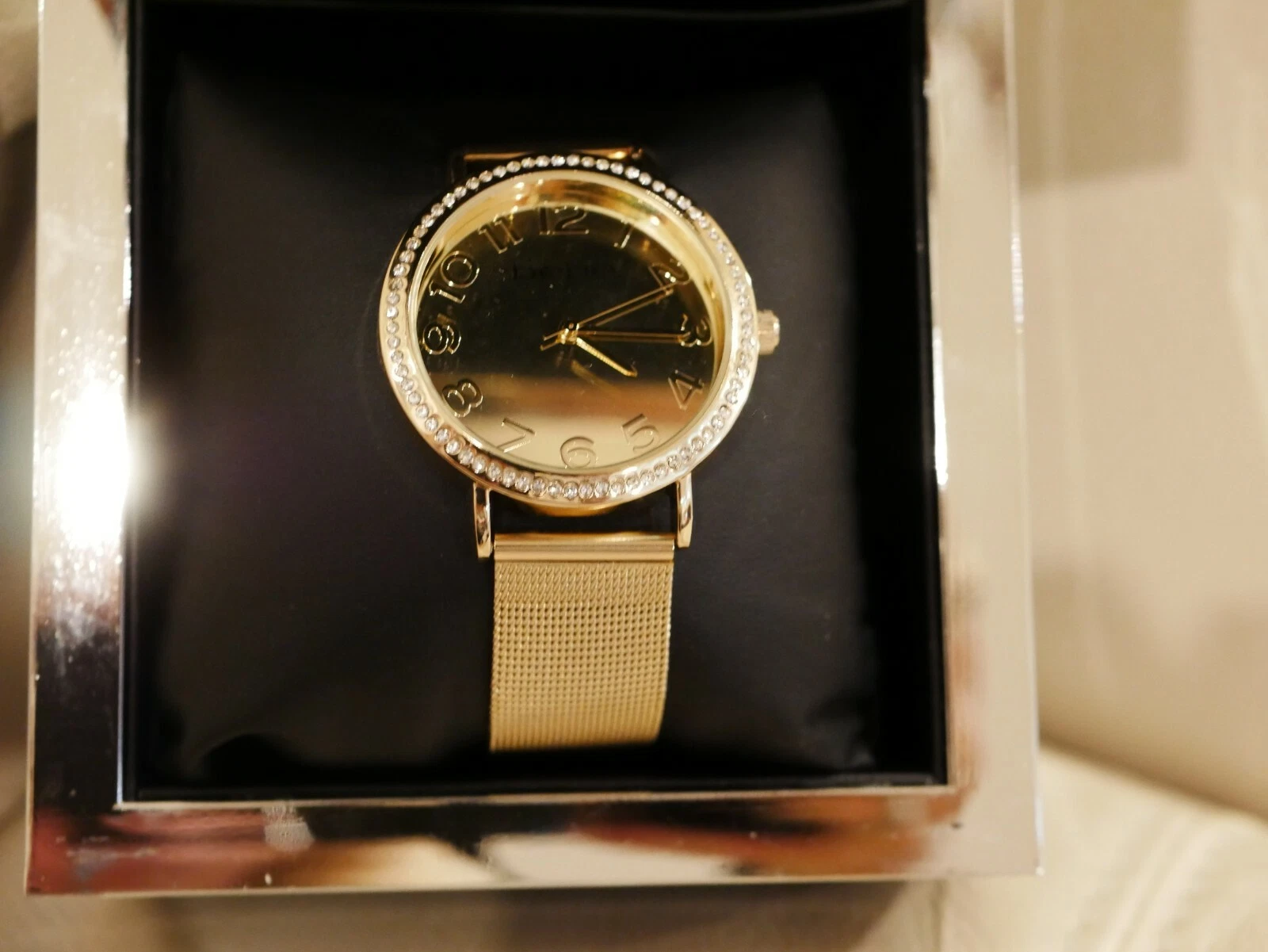 NEW WITH BOX WOMEN'S BEBE YELLOW GOLD  WATCH RHINESTONES  BUCKLE LARGE NUMBERS