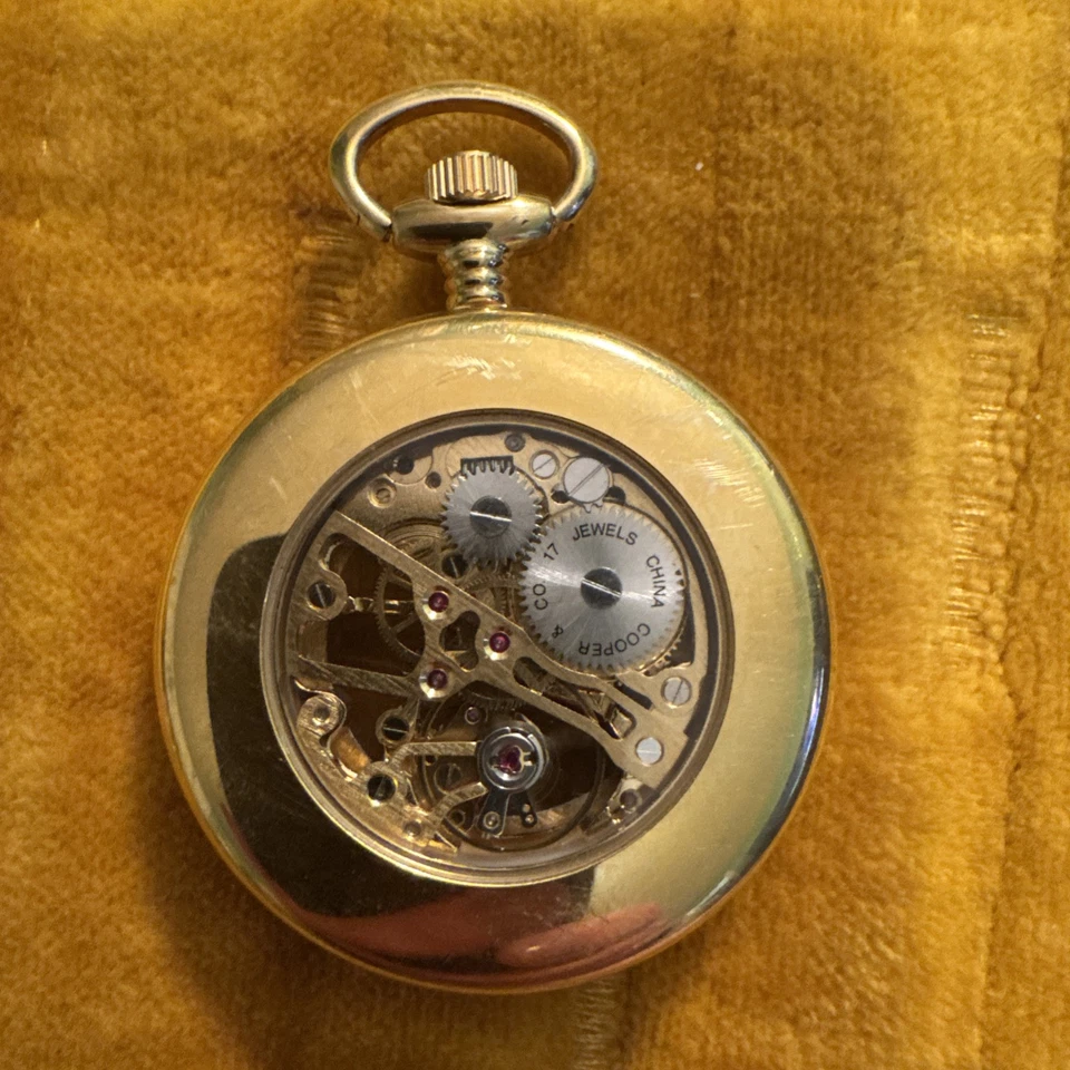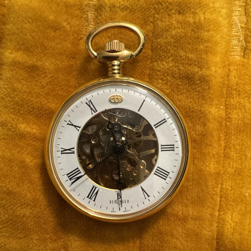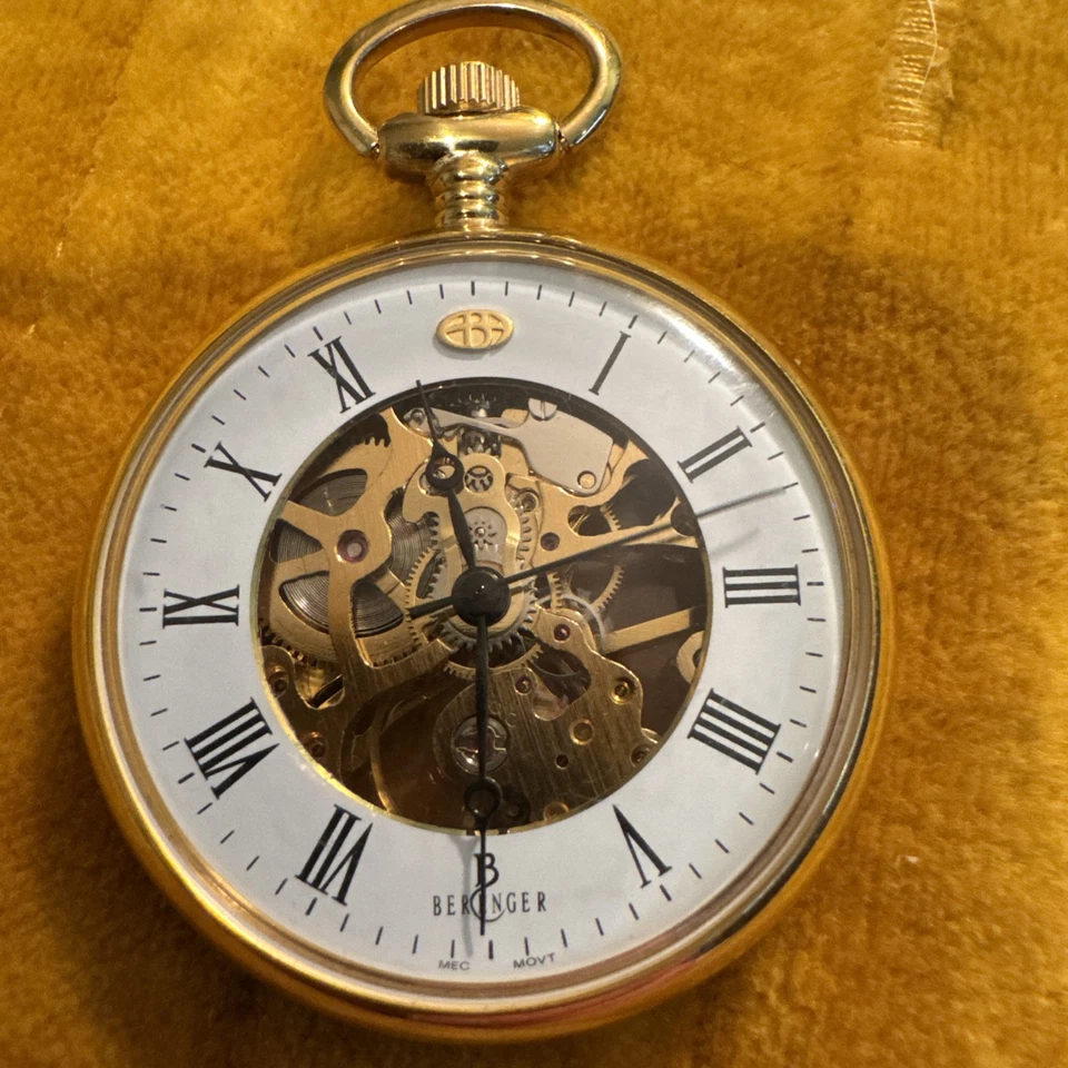 Vintage Berenger Skeleton Wind Up Pocket Watch GOLD  Tone  Jewels 51mm Runs