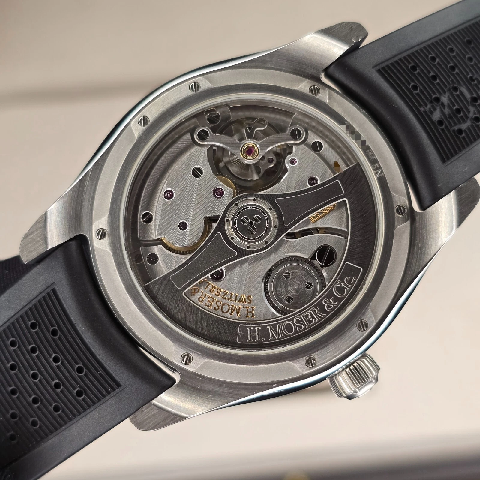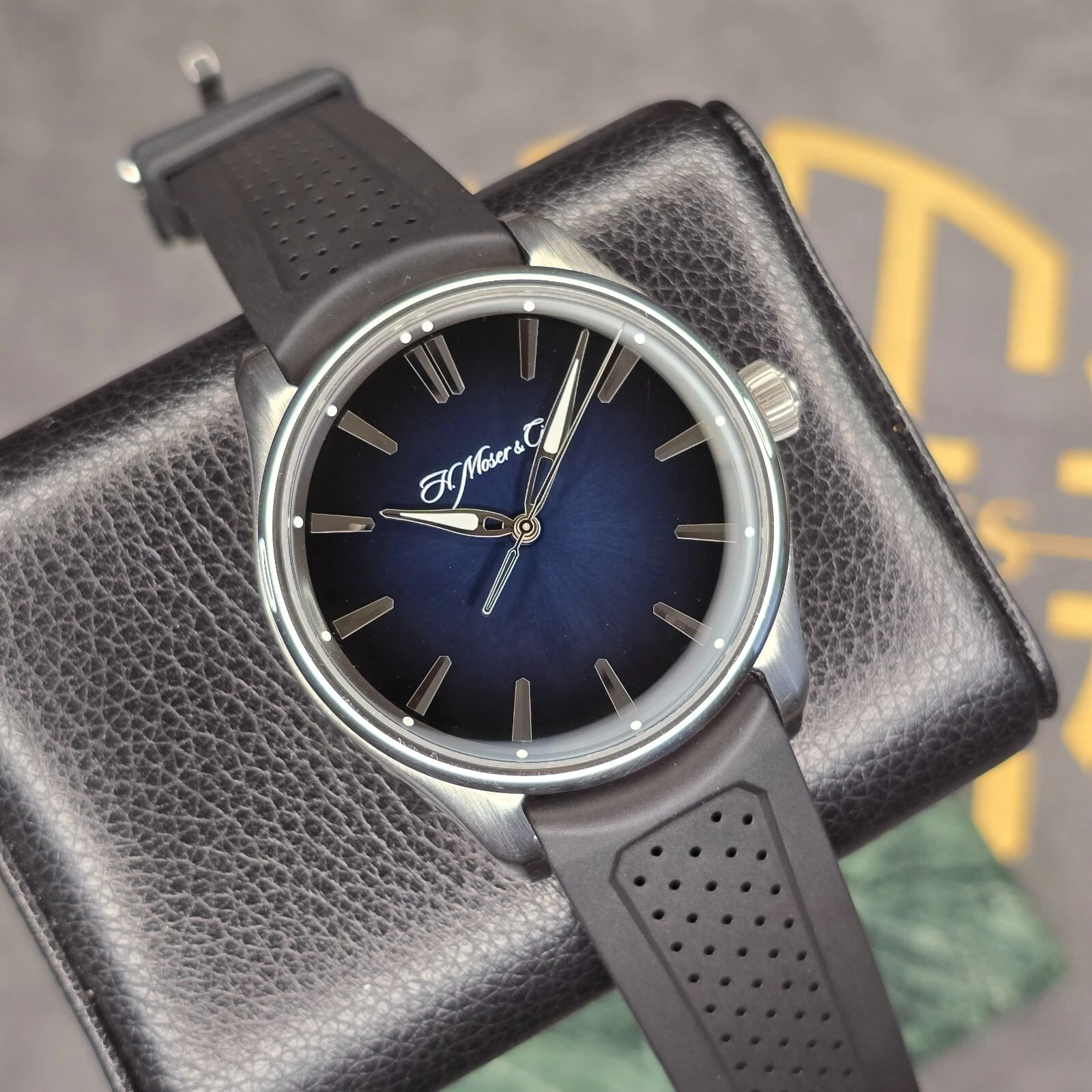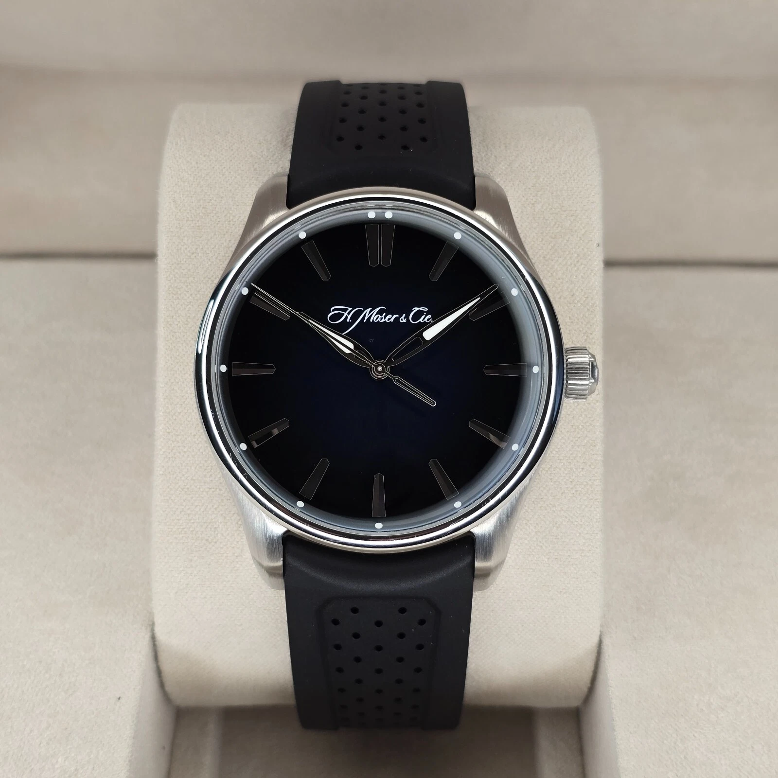 H. MOSER & CIE PIONEER 3200 43MM BLUE FUME SMOKE DIAL STAINLESS STEEL B&P