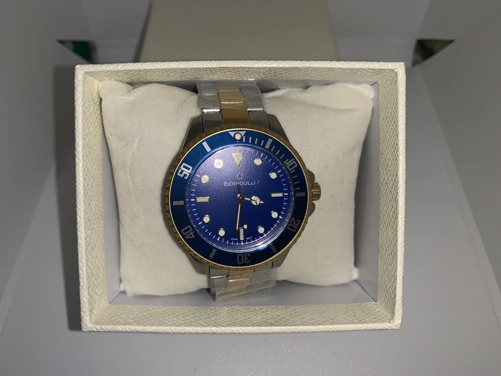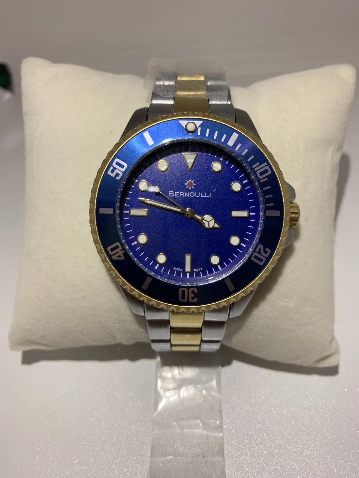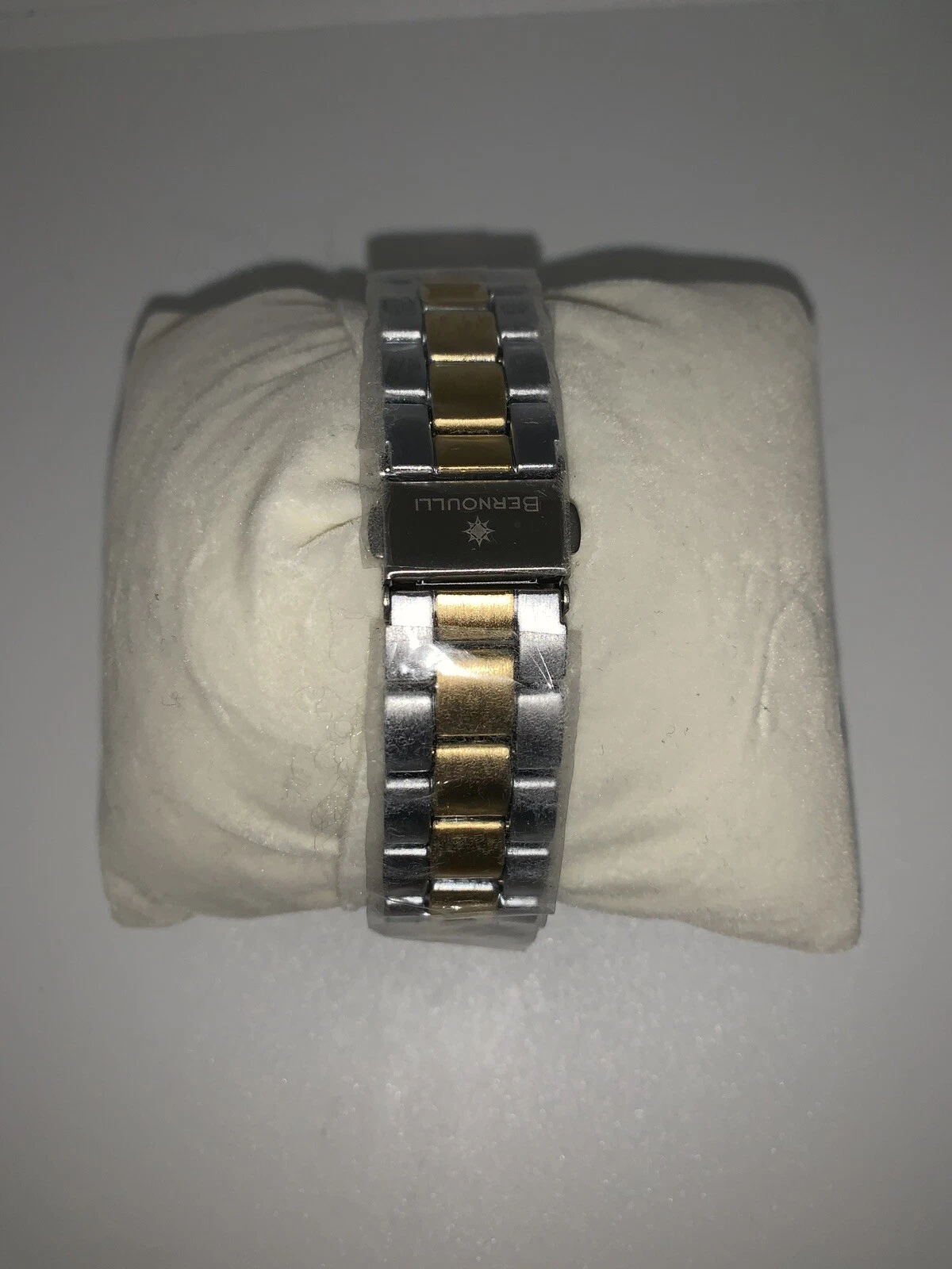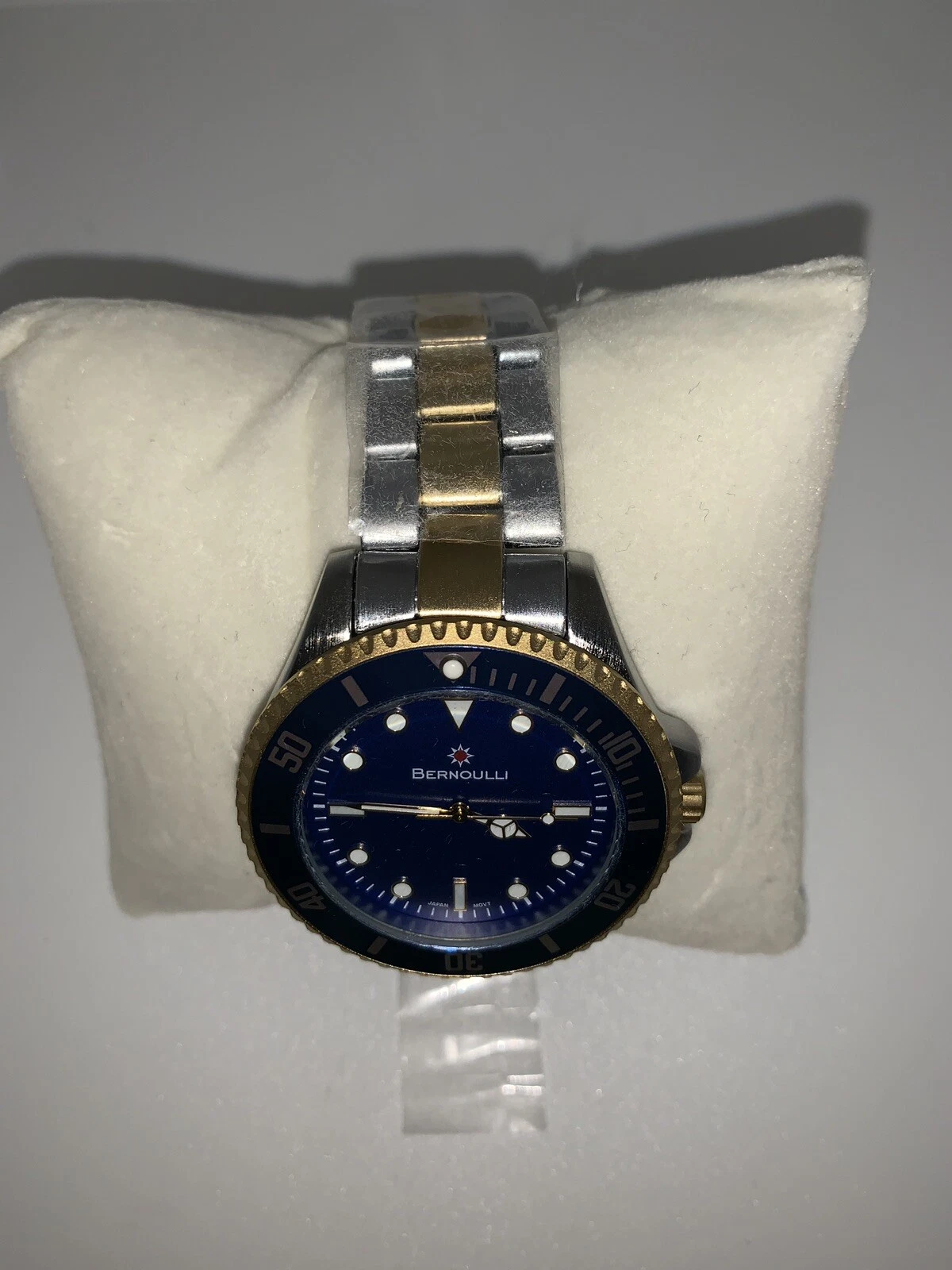 Bernoulli 9444 Men's Solarium Blue Dial Bezel Yellow Gold Bracelet Watch 30m