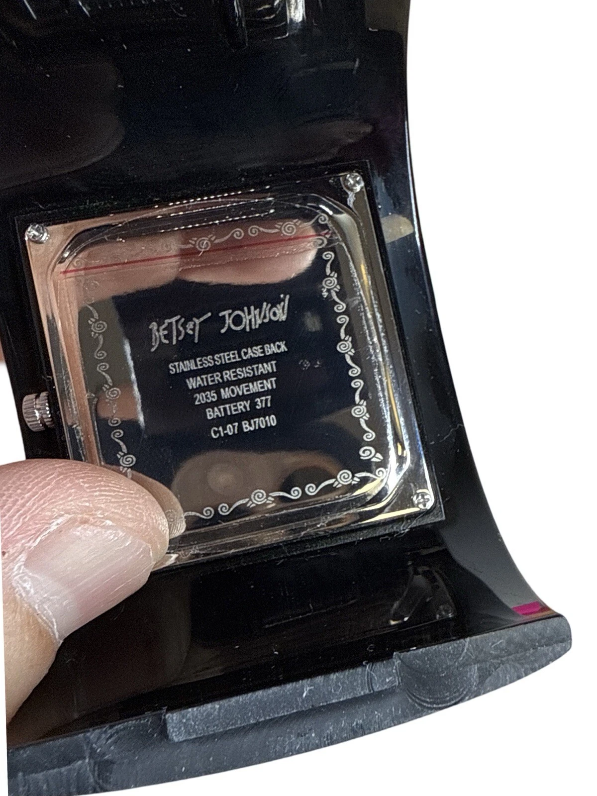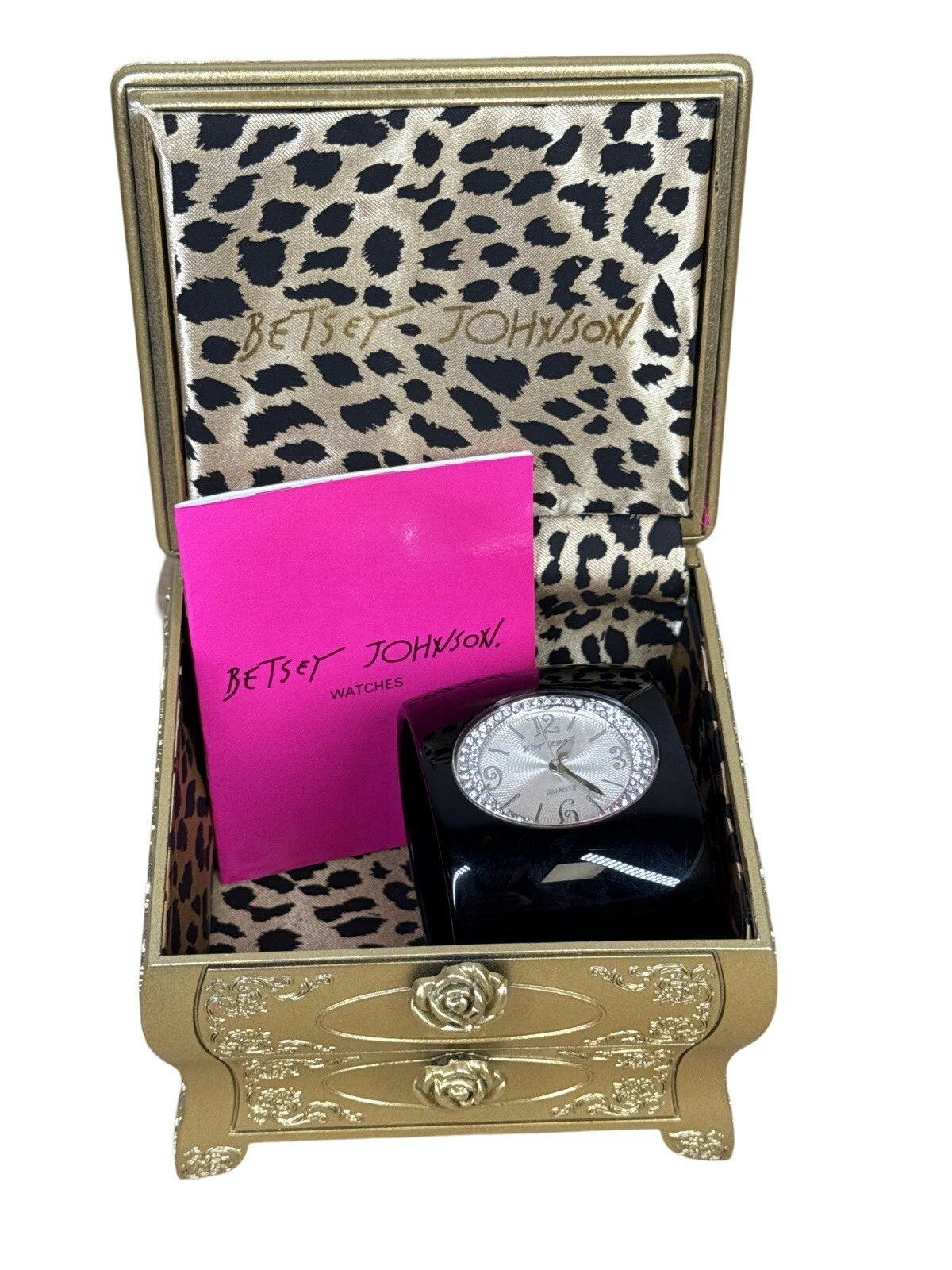 Vintage Betsey Johnson Cuff Watch Shiny Wide Black Rhinestone Bangle w/ Box
