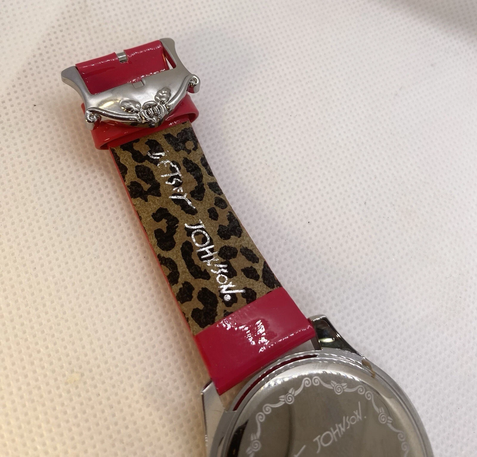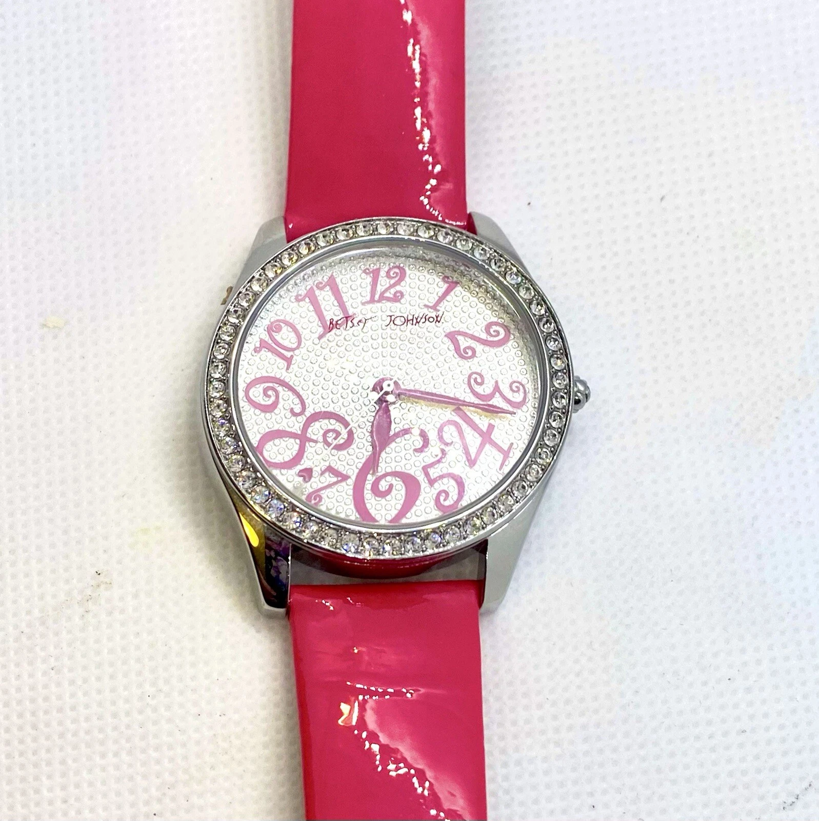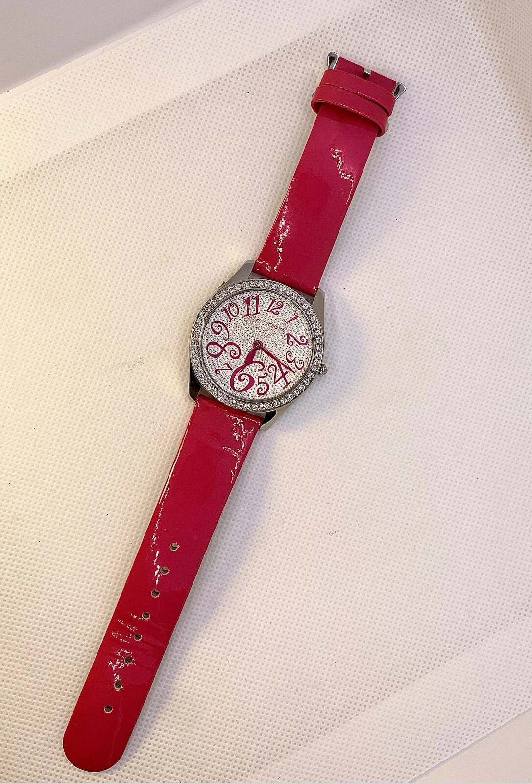 Betsey Johnson Watch Hot Pink Leather Band Rhinestone & Heart Accented Face