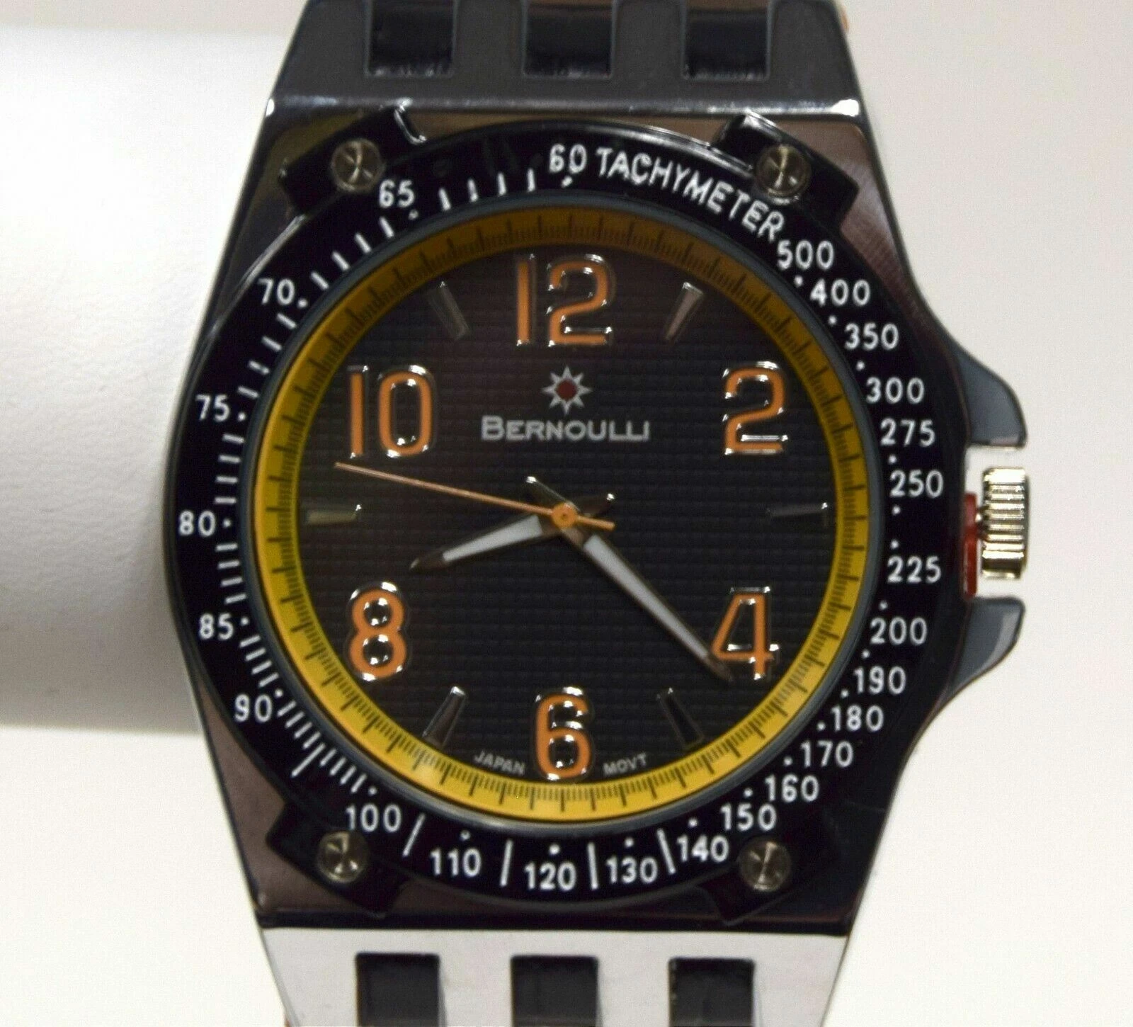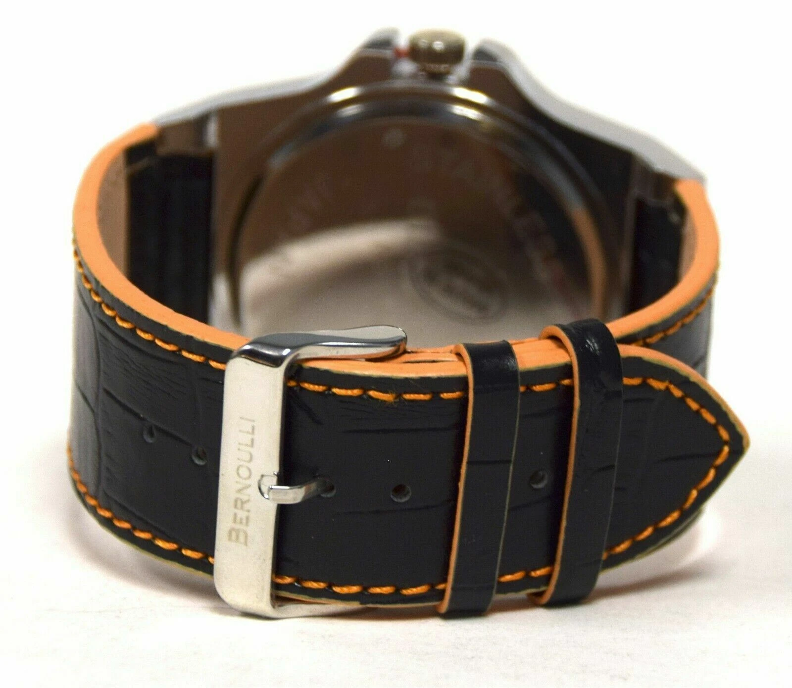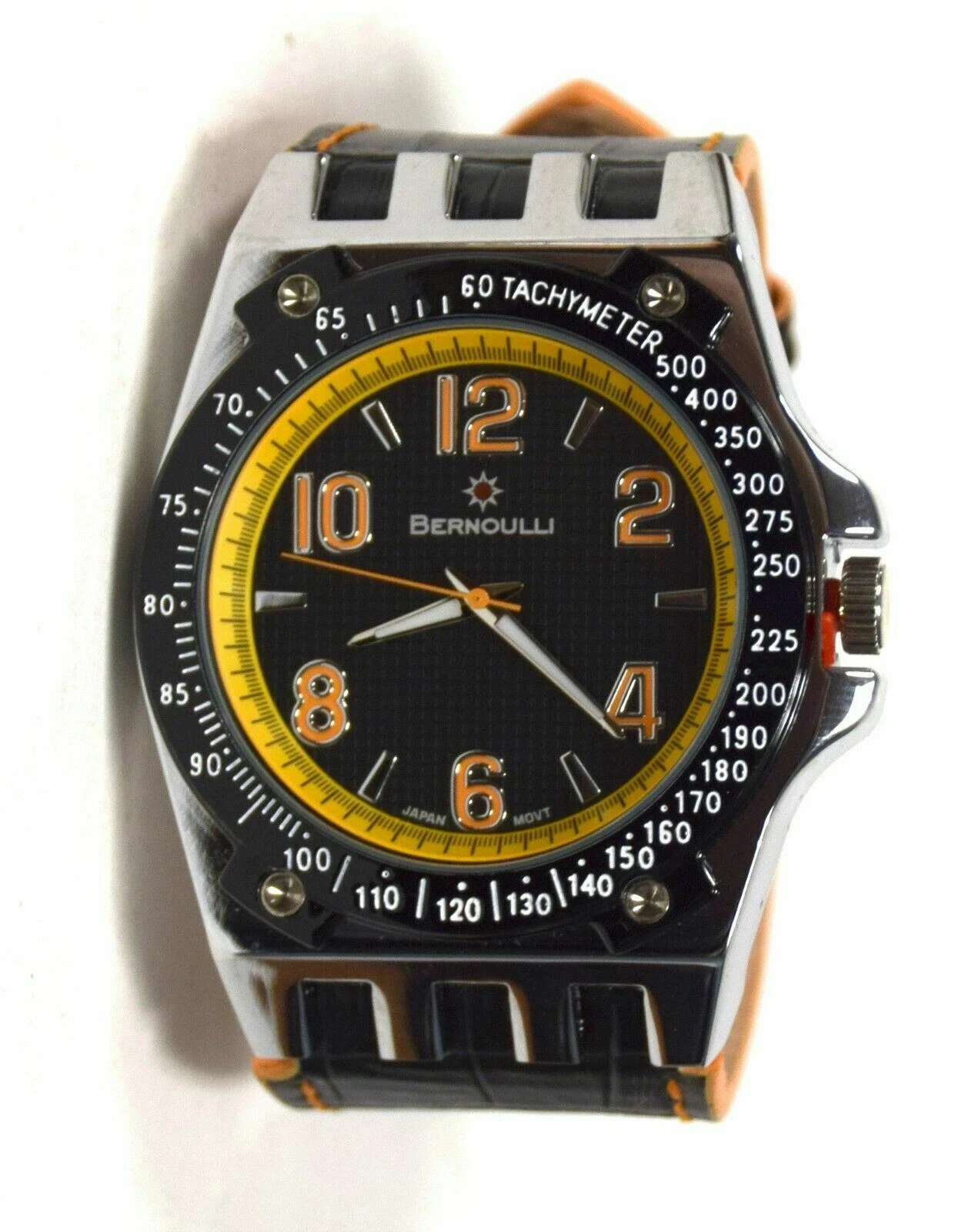 NEW Bernoulli 9724 Mens Polaris Texture Dial Wide Black Band Orange Accent Watch
