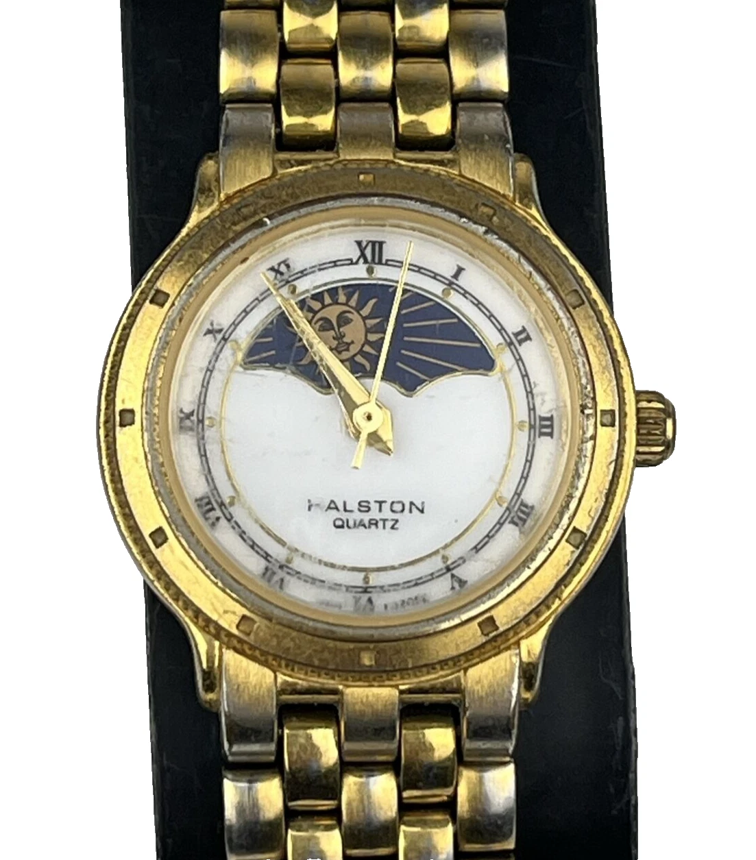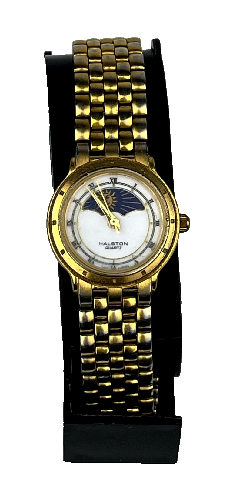 Halston Women's Vintage Watch Moon Phase Gold Tone All Stainless - New Battery