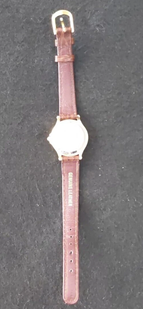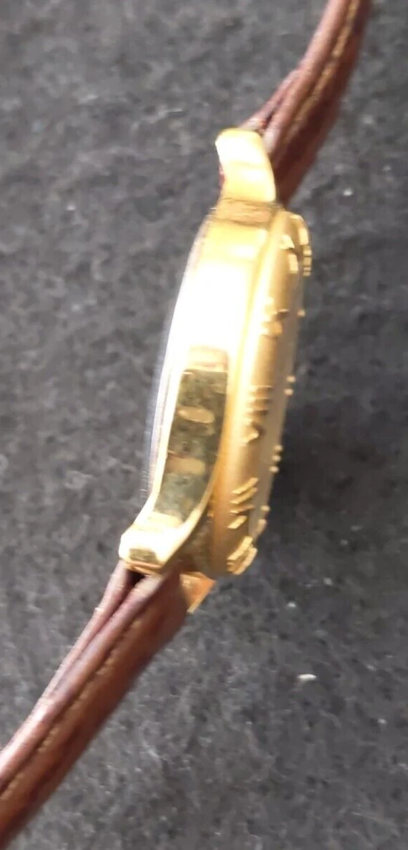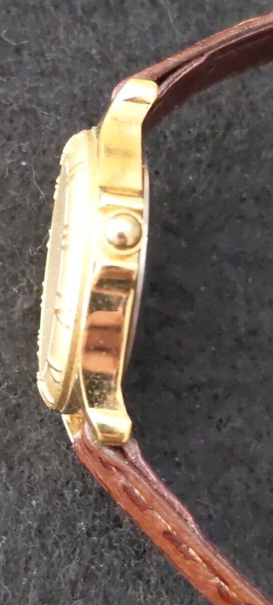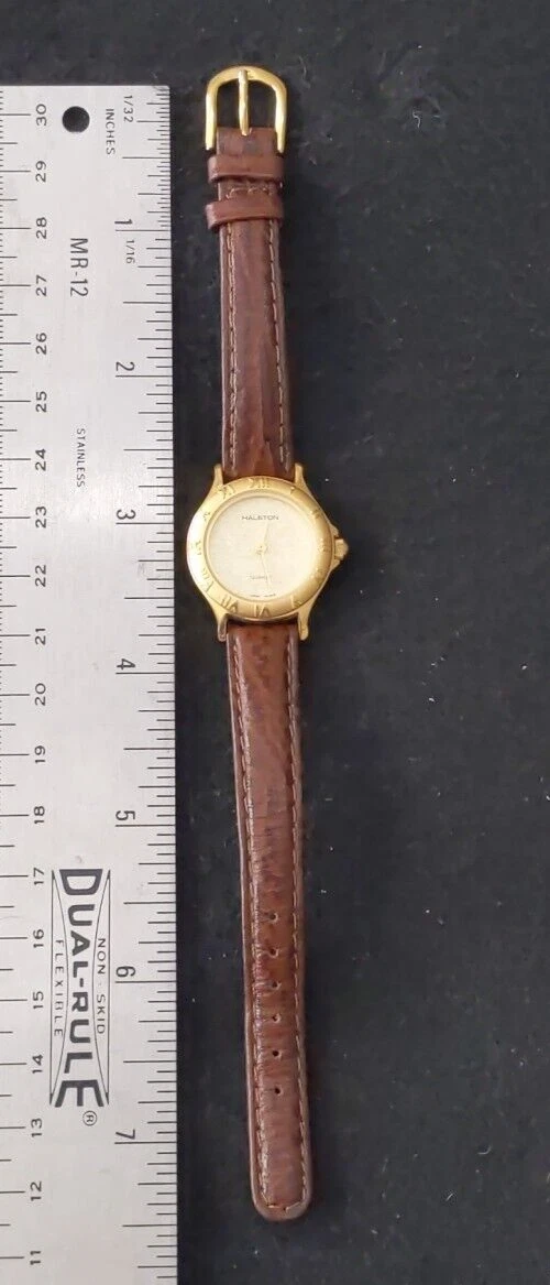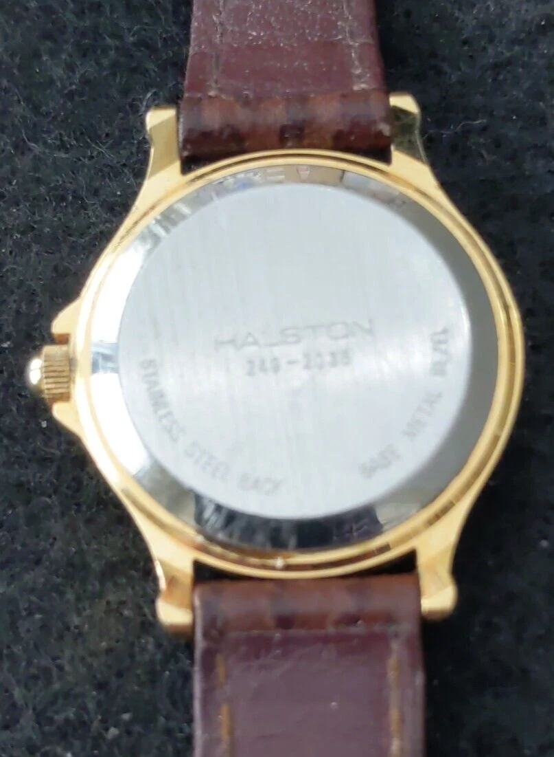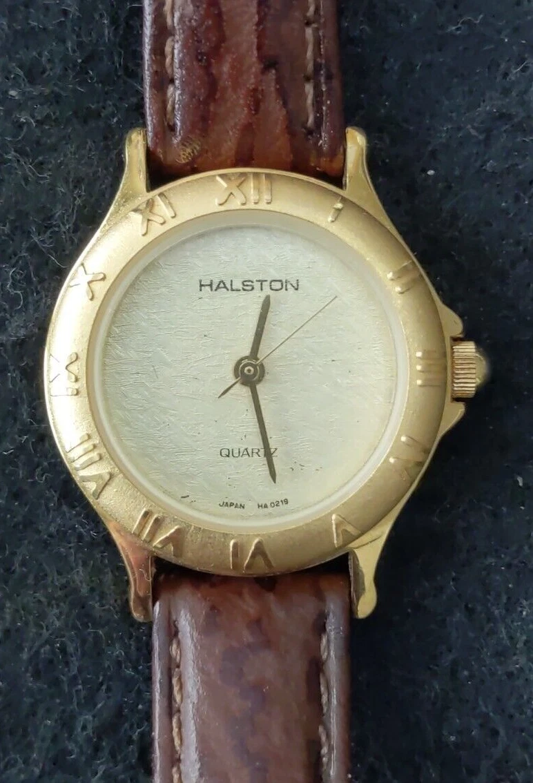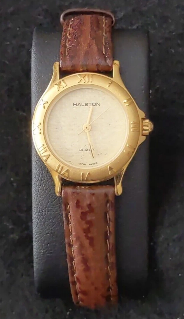 Halston Vintage Women's Quartz Watch Gold Dial Case Bezel Brown Leather Strap