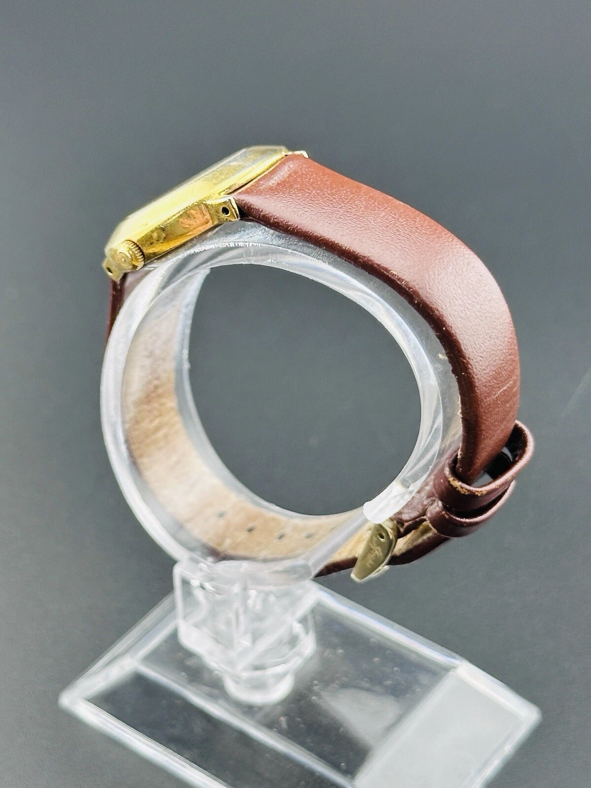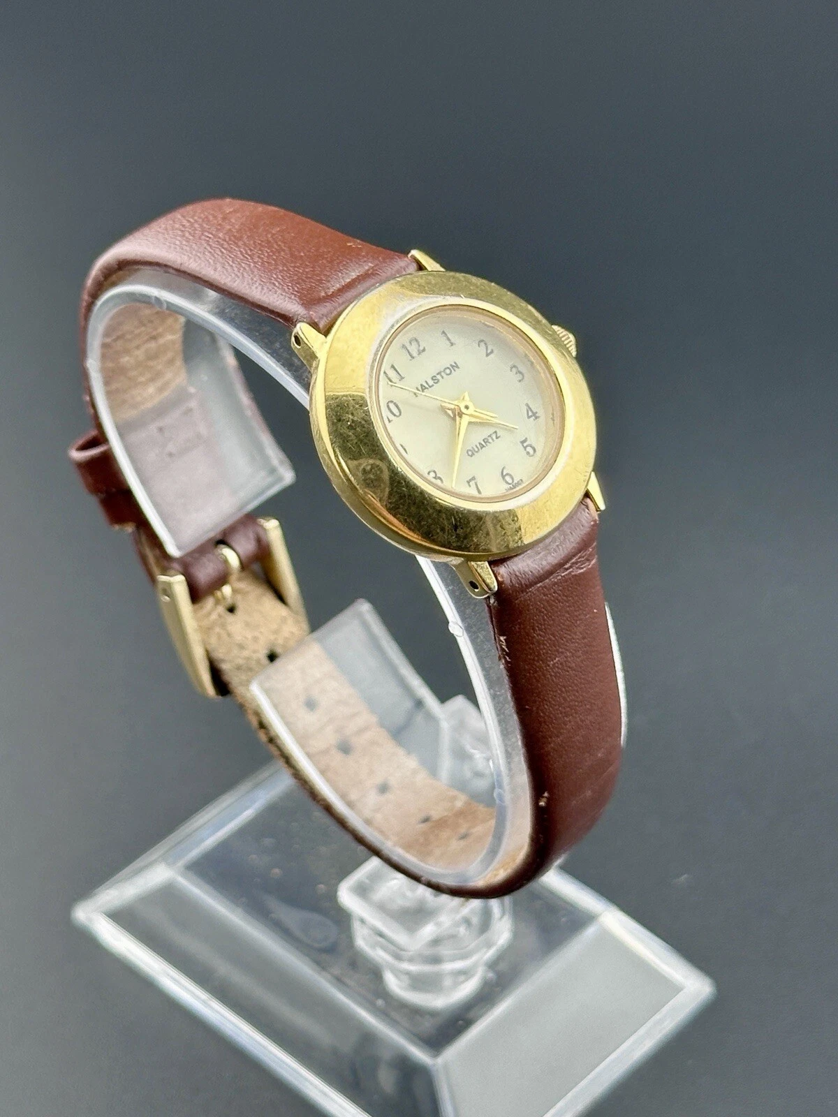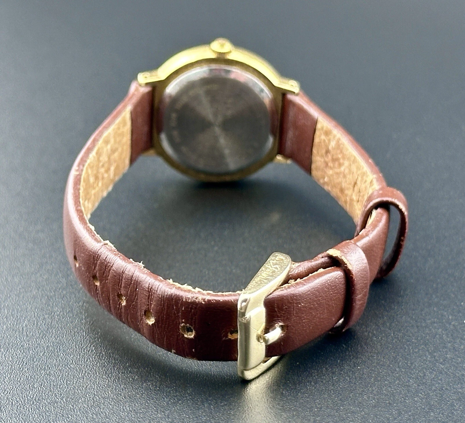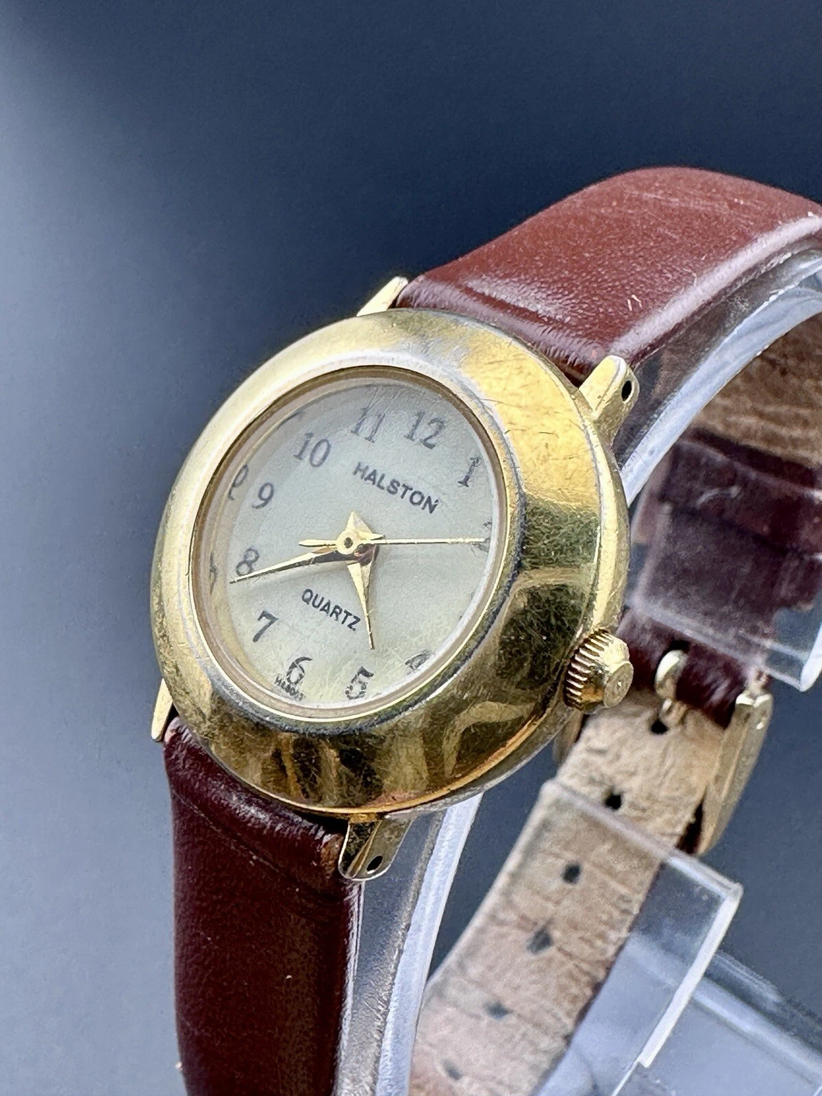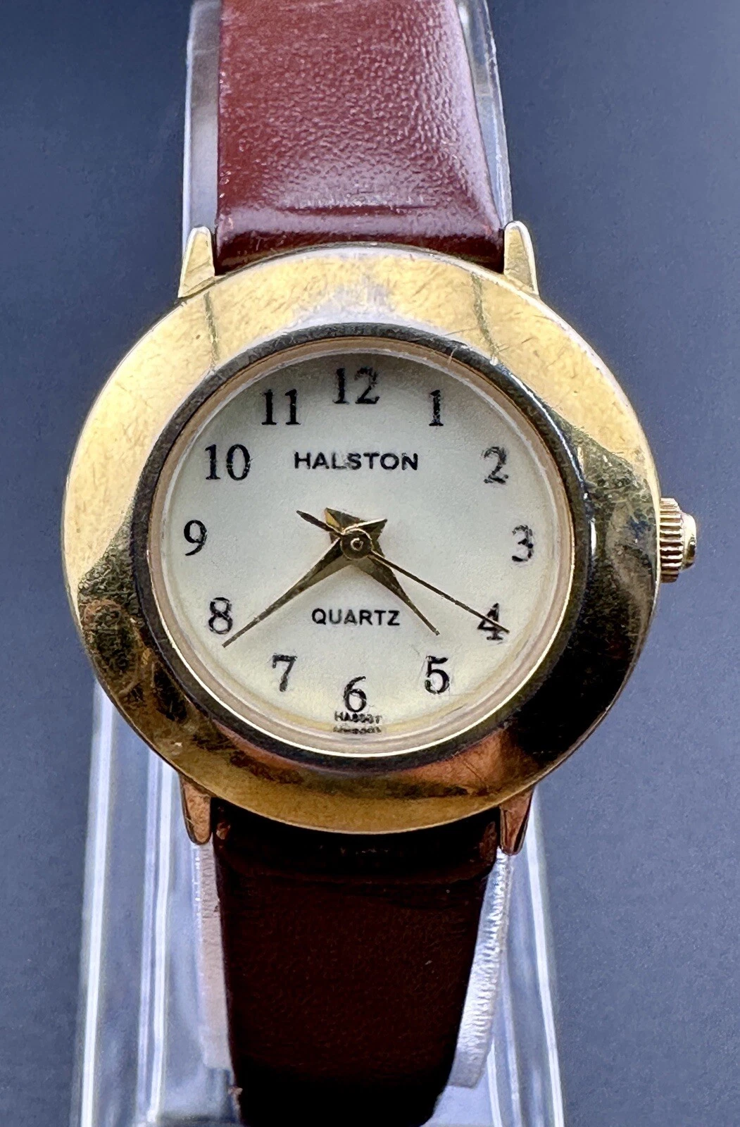 Working Vintage Halston 294-902.105 Gold Tone Bezel Brown Band Women’s Watch U2