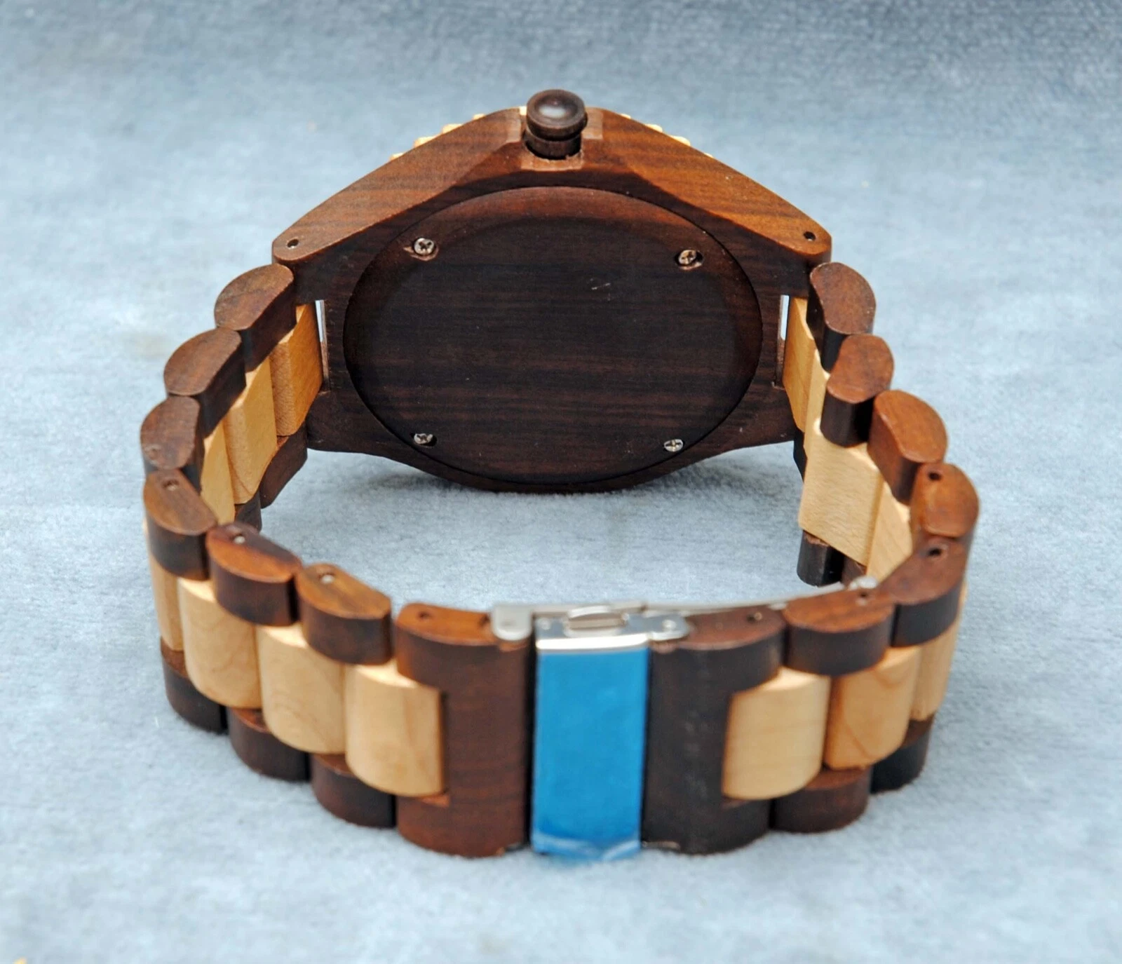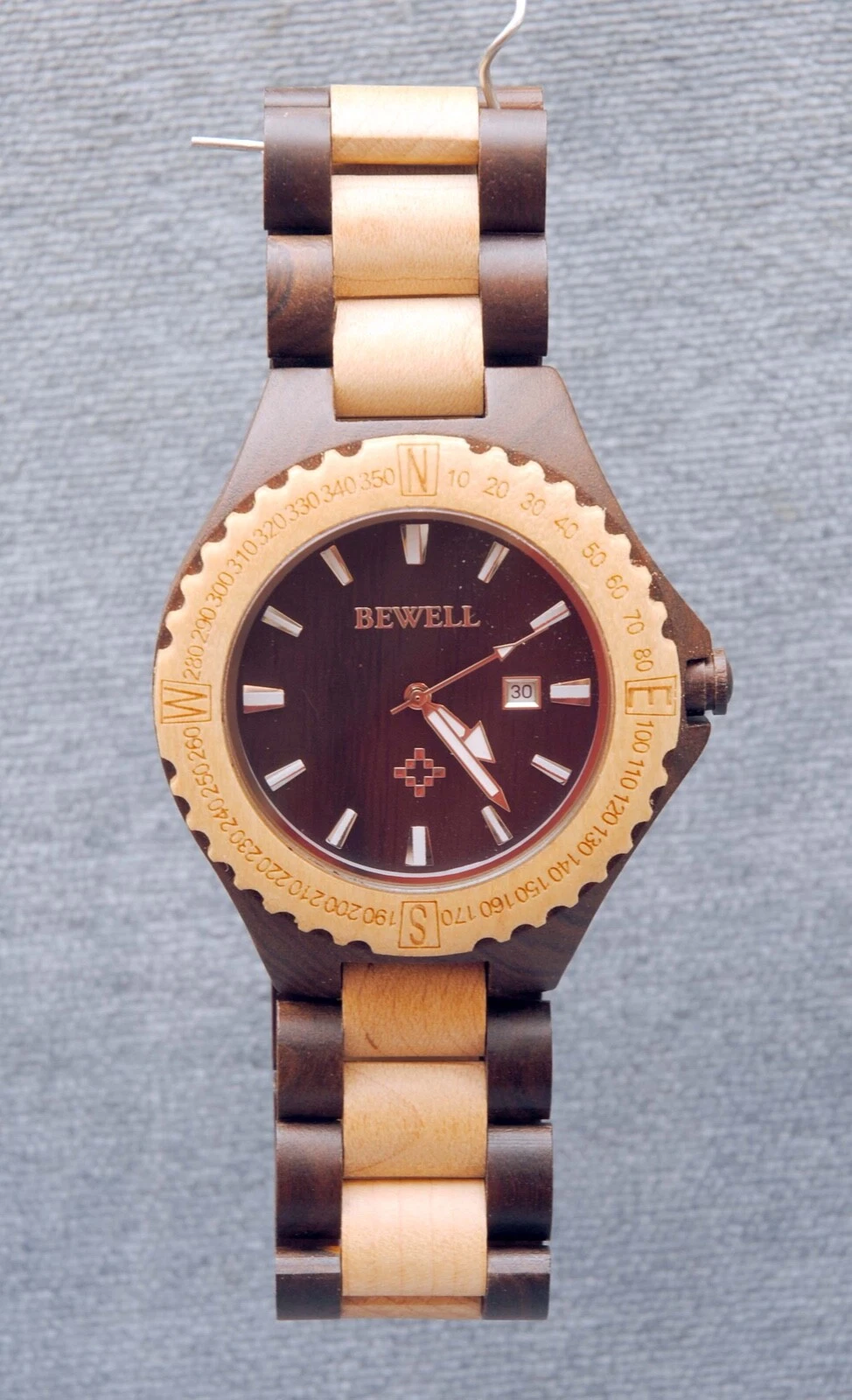 BEWELL "POSEIDON" WOODEN MENS WRISTWATCH WITH NEW BATTERY, RETIRED DESIGN