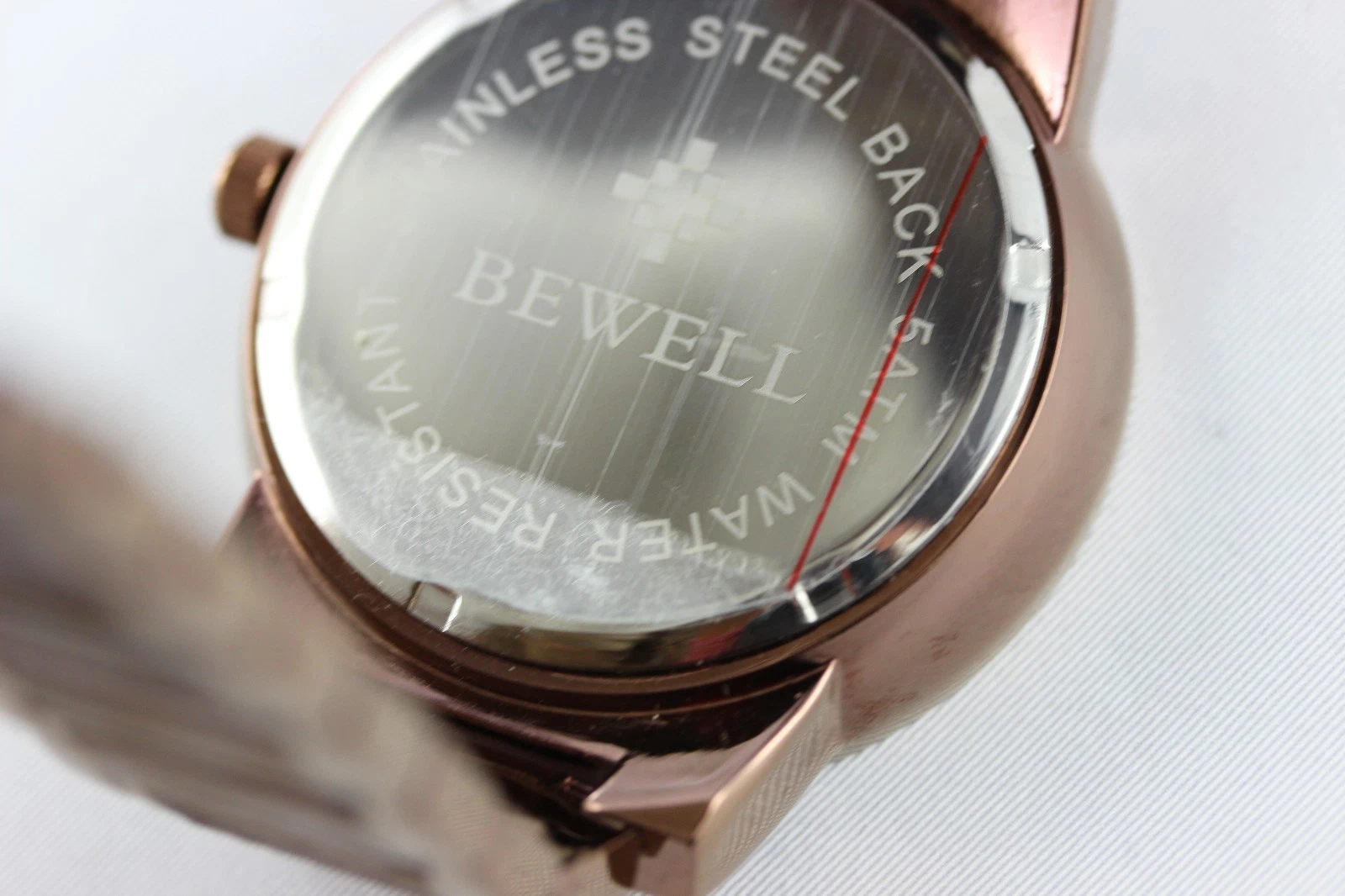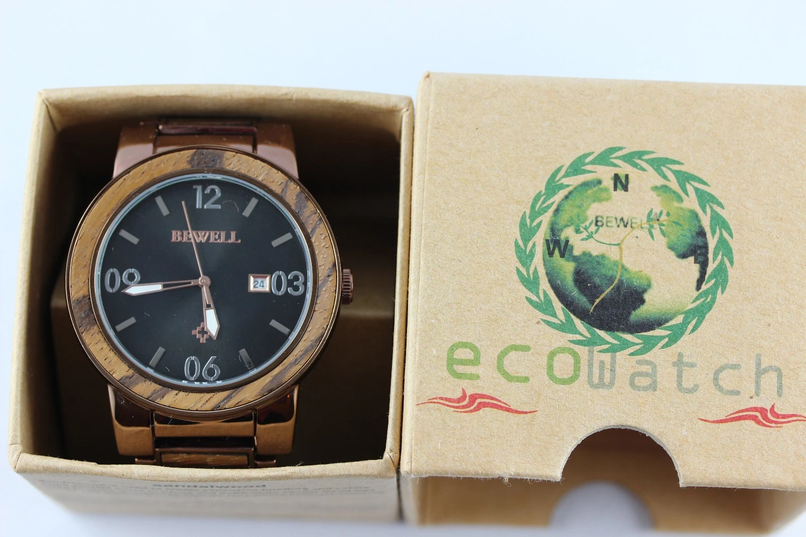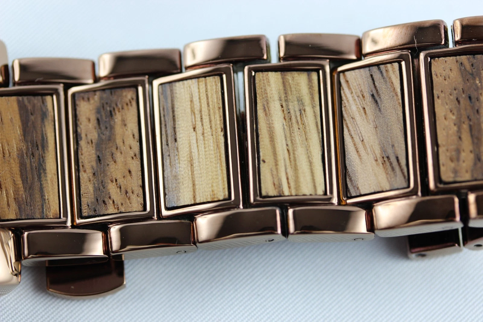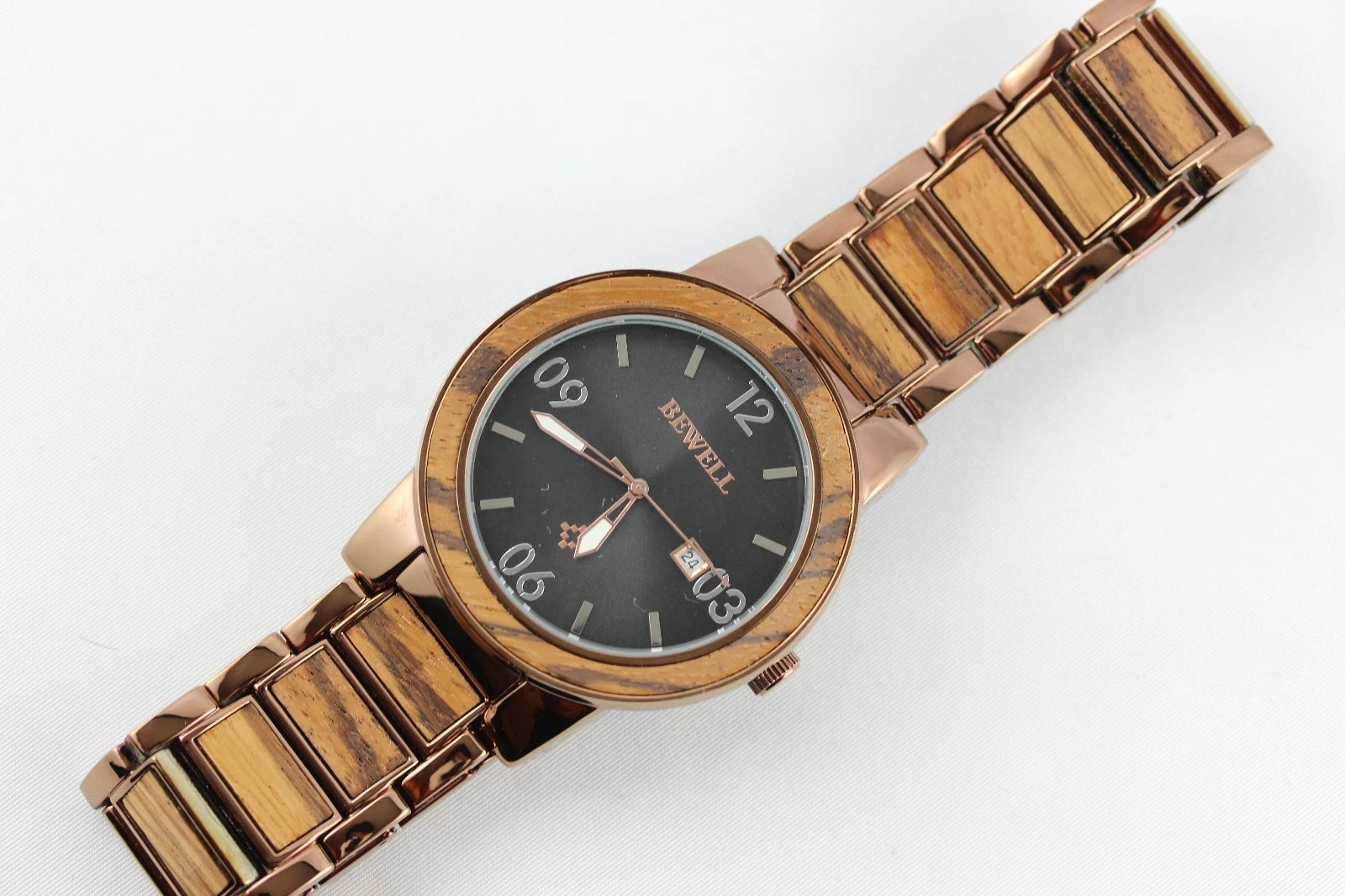 BEWELL Men's Watch Date Zebrano Wood Metal Rose Gold 46mm Gift Wooden Watch