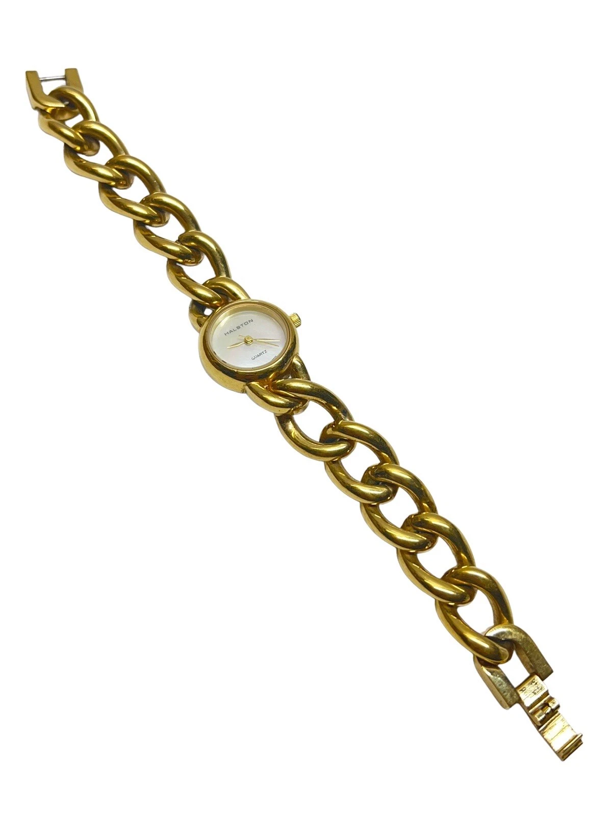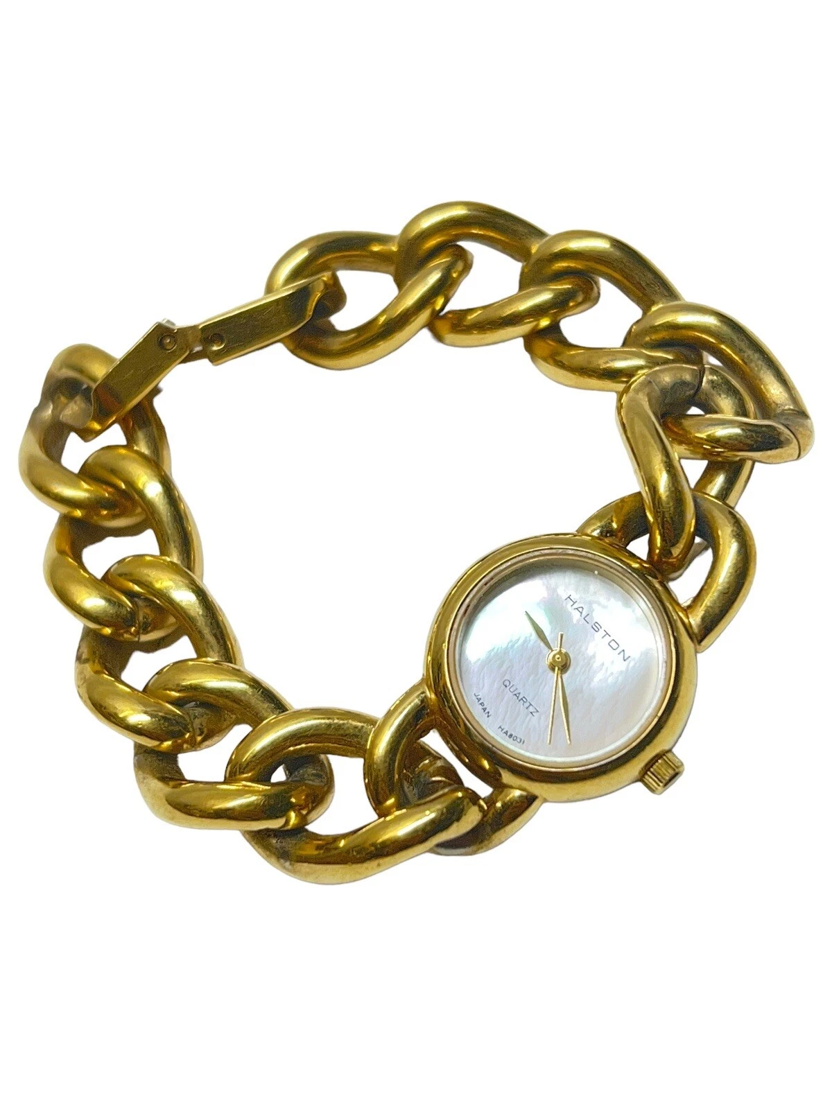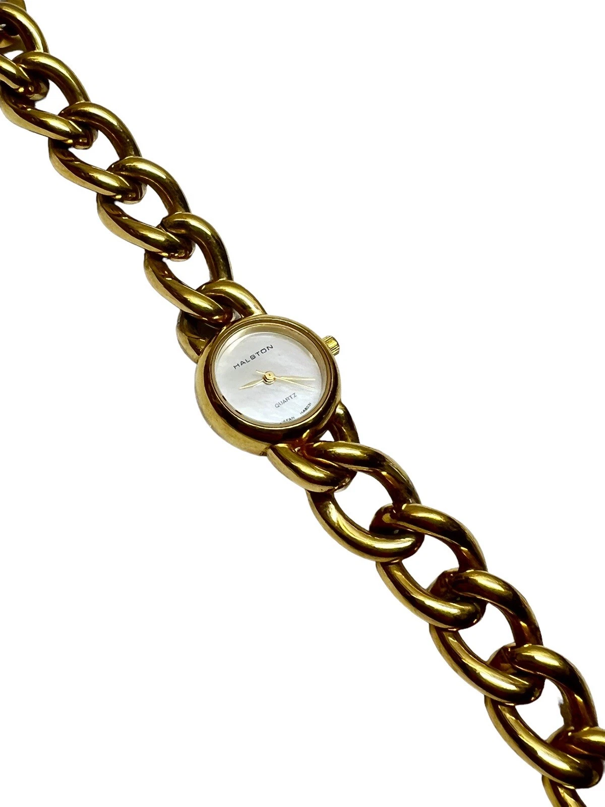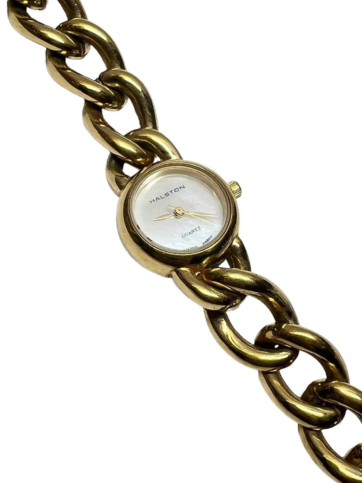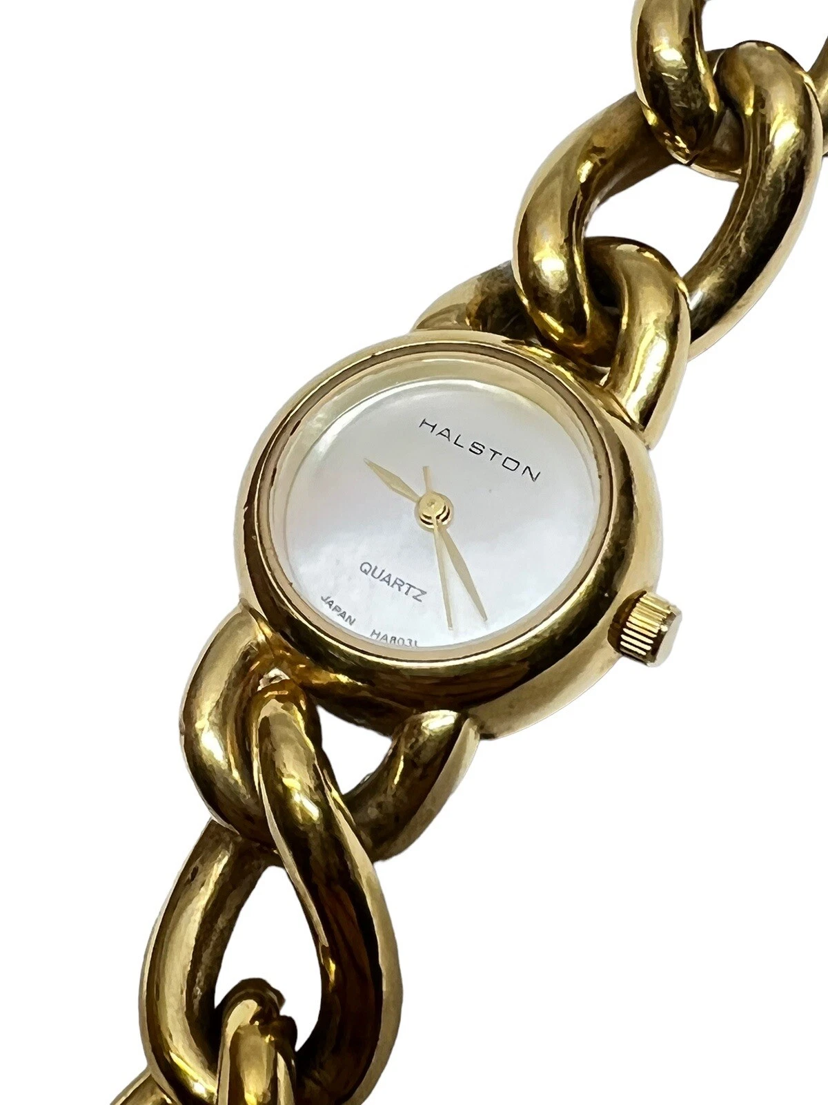 Vintage Halston Women's Mother Of Pearl Gold Chain Bracelet Watch HA8031
