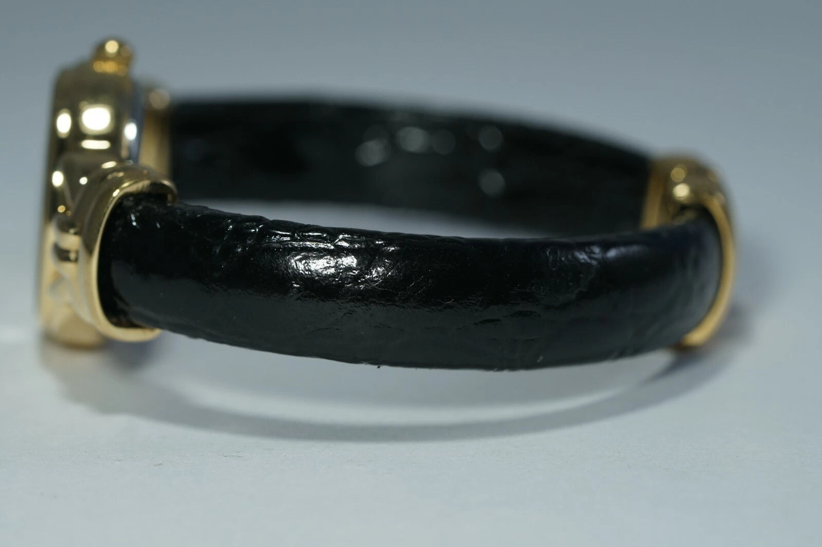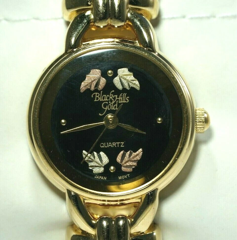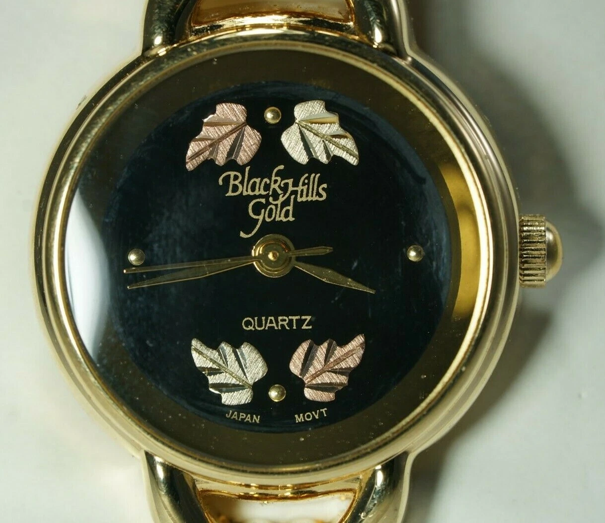 BLACK HILLS 12K Green & Rose Gold Grape Leaves, Cuff Watch, Black Leather