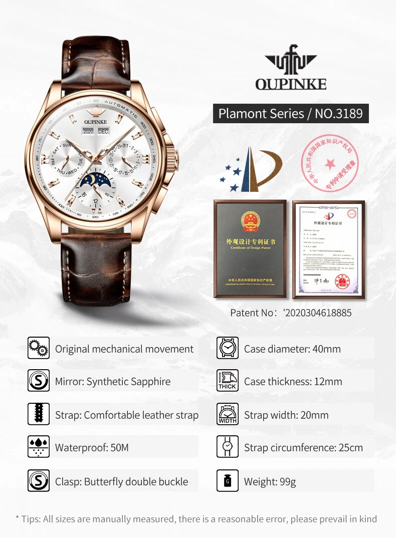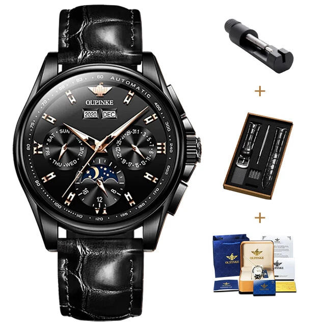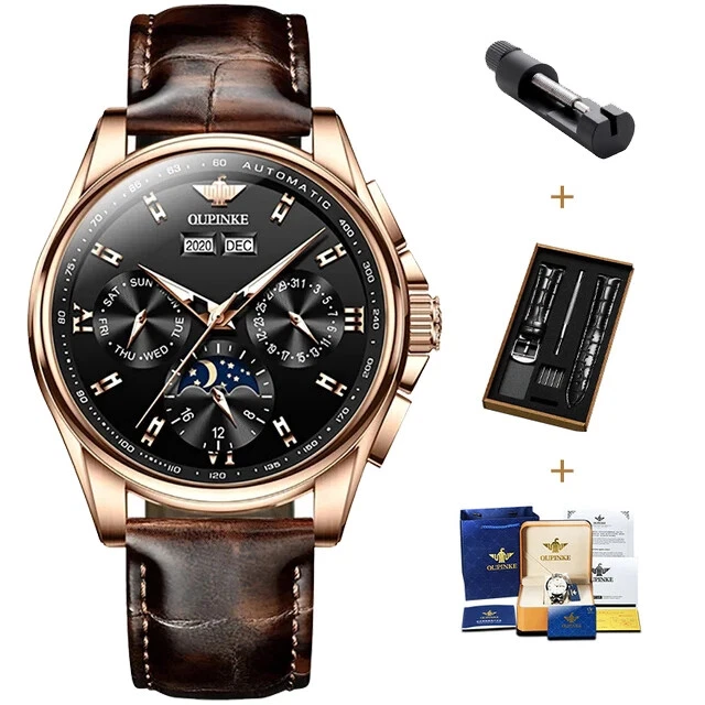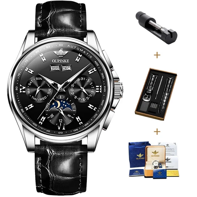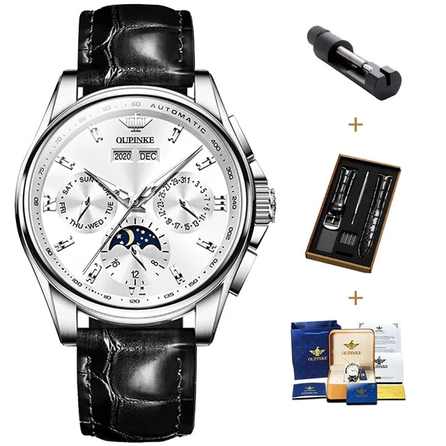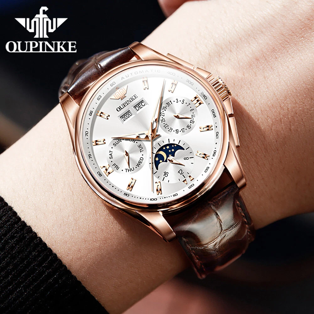 OUPINKE 3189 Automatic Watch for Men Genuine Leather Strap Waterproof Moon Phase