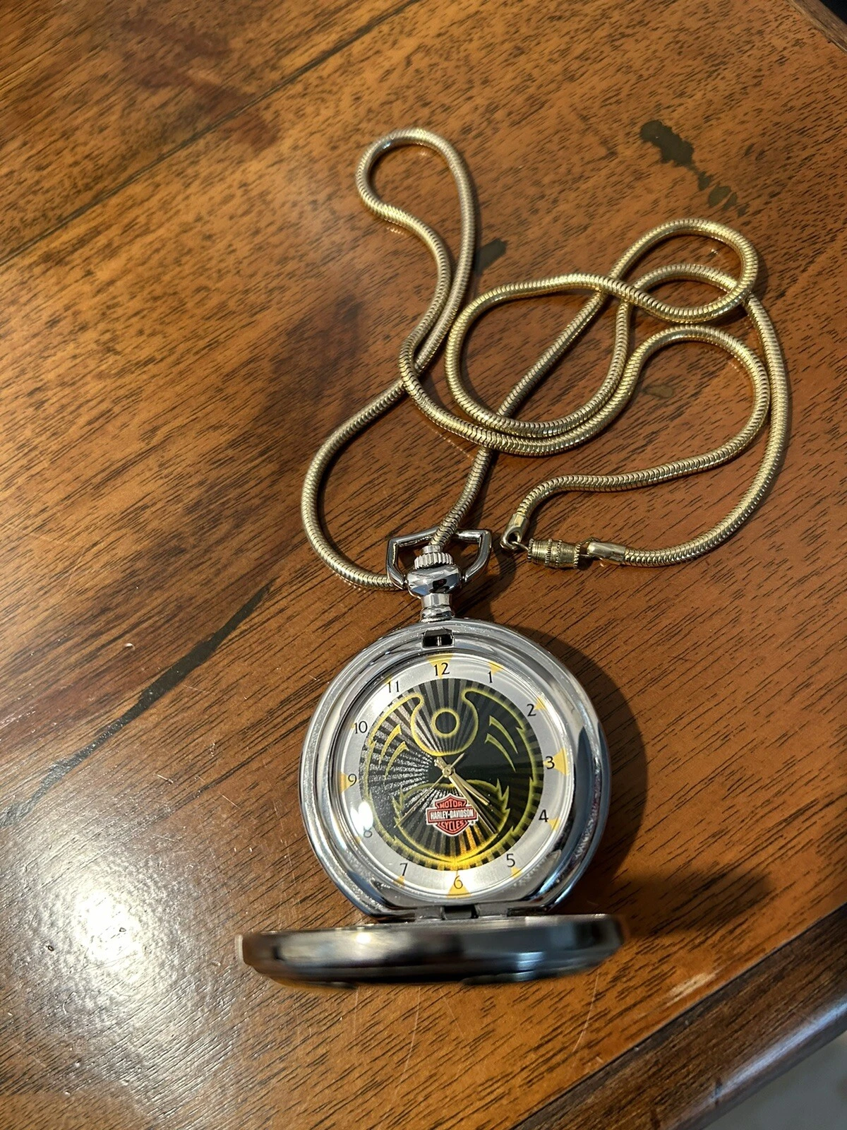 POCKEET MENS WATCH HARLYDAVIDSON WITH 10 KARAT GOLD CHAIN LOOK IN THE BACK  FOR