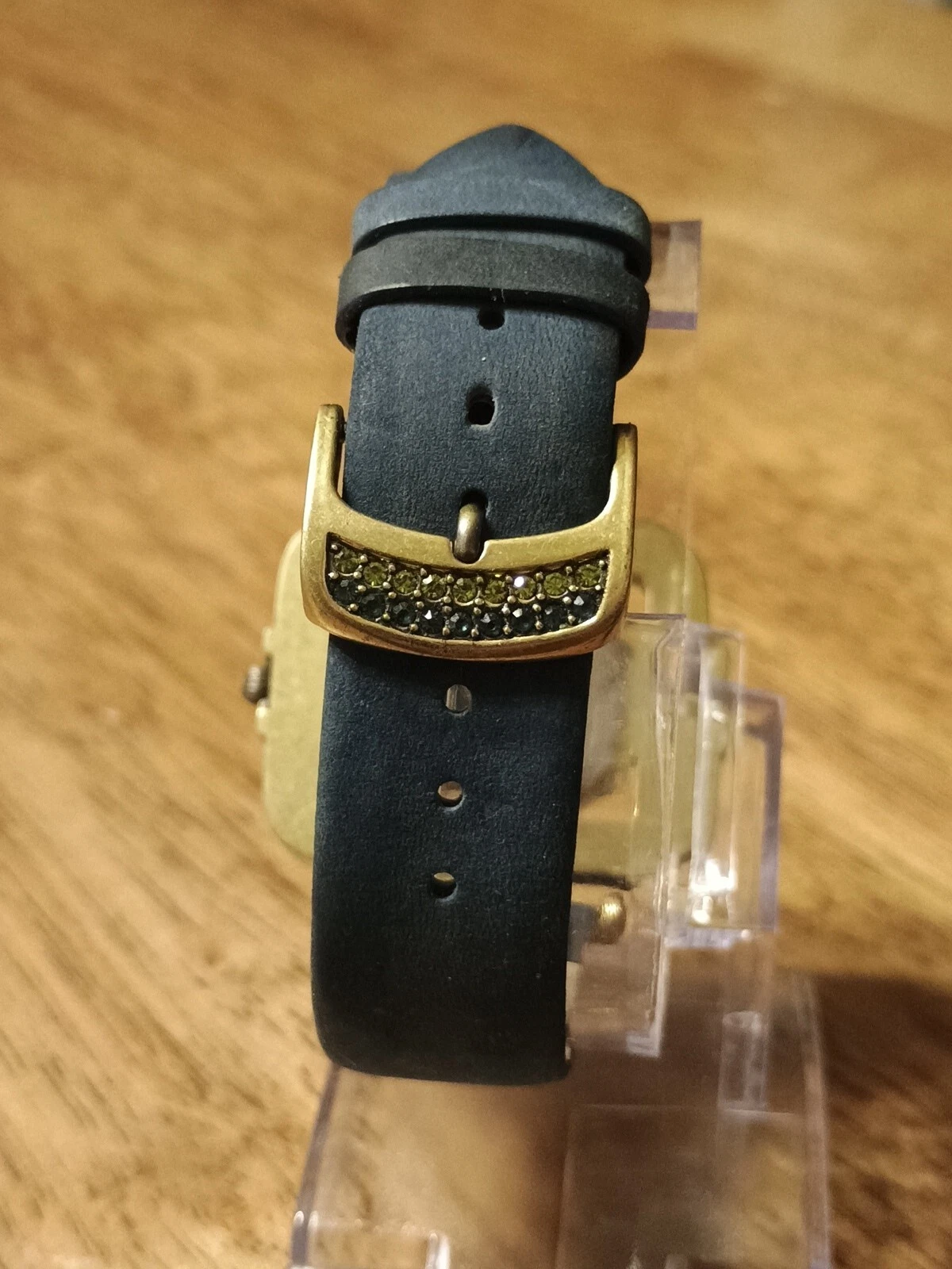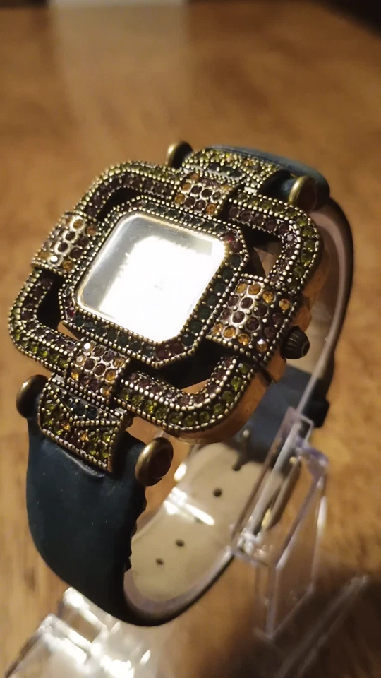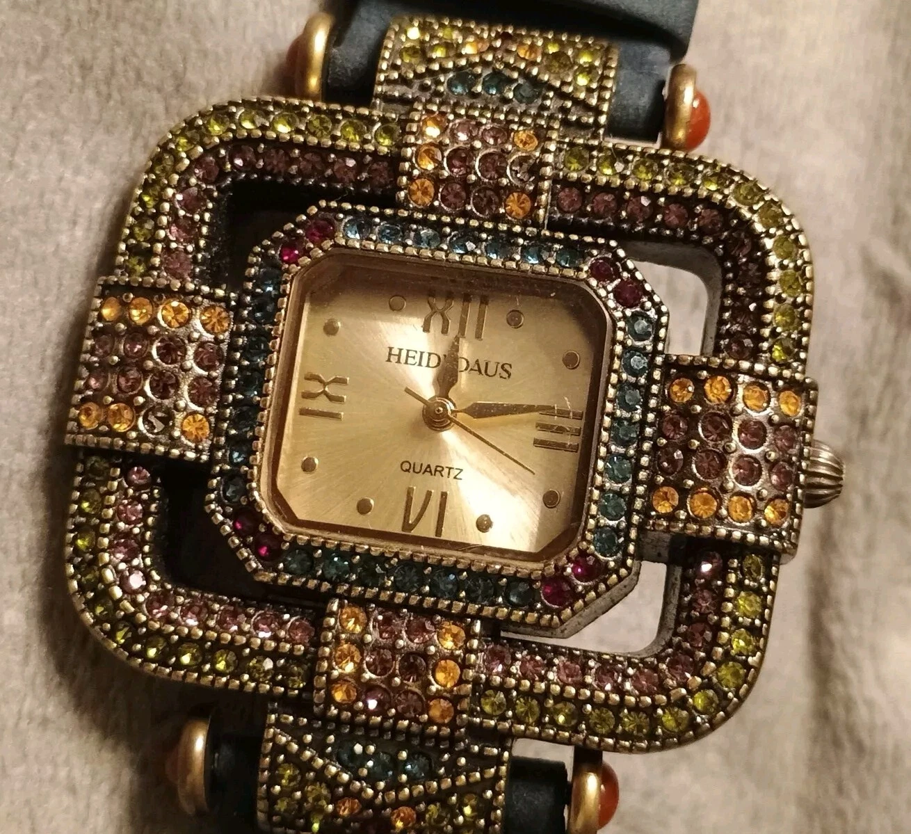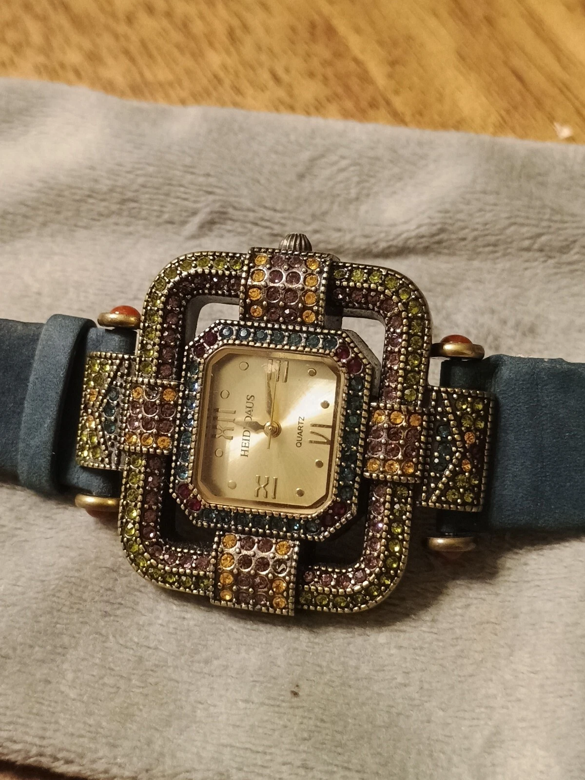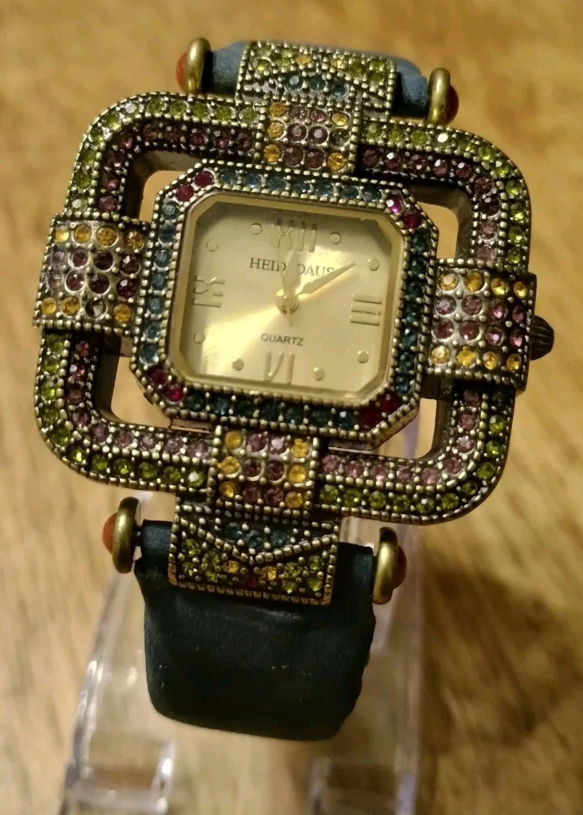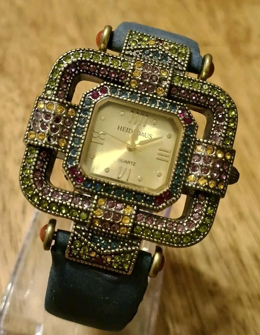 HTF Heidi Daus Multi-Color Swarovski Crystal Watch Blue Suede Art Deco STUNNING!