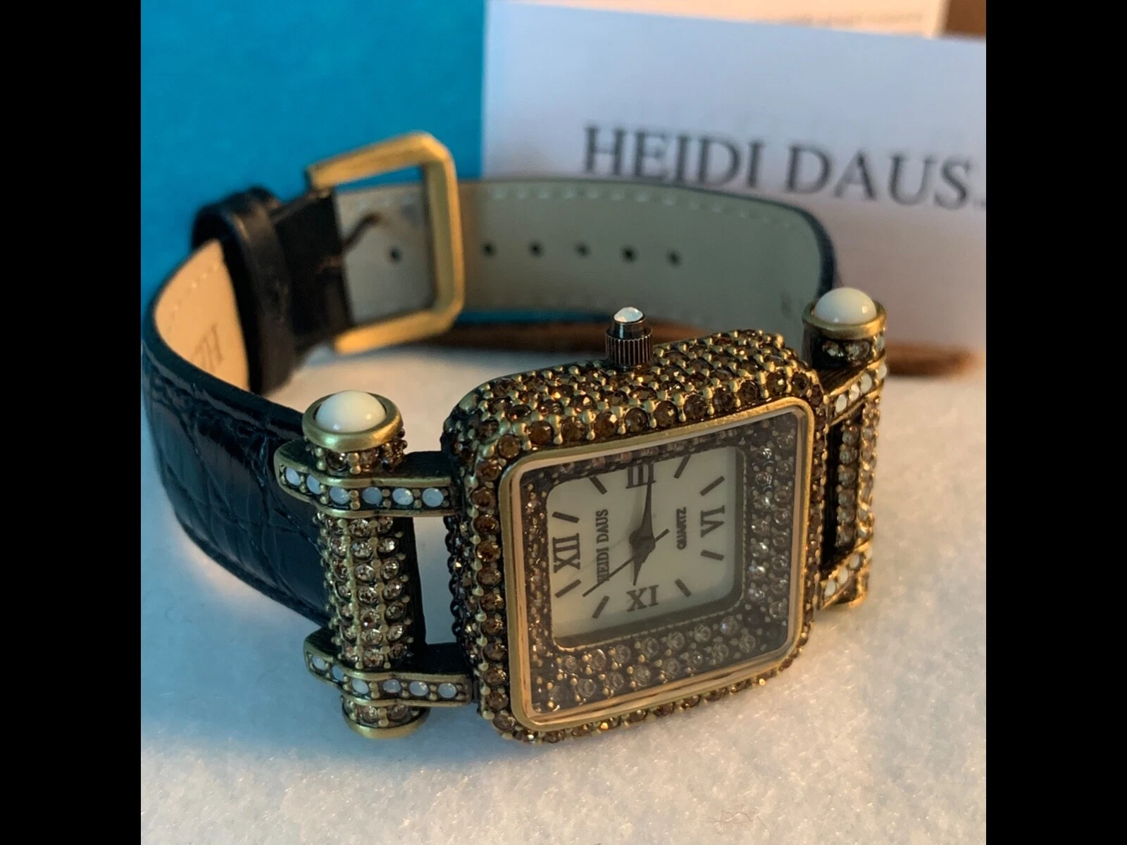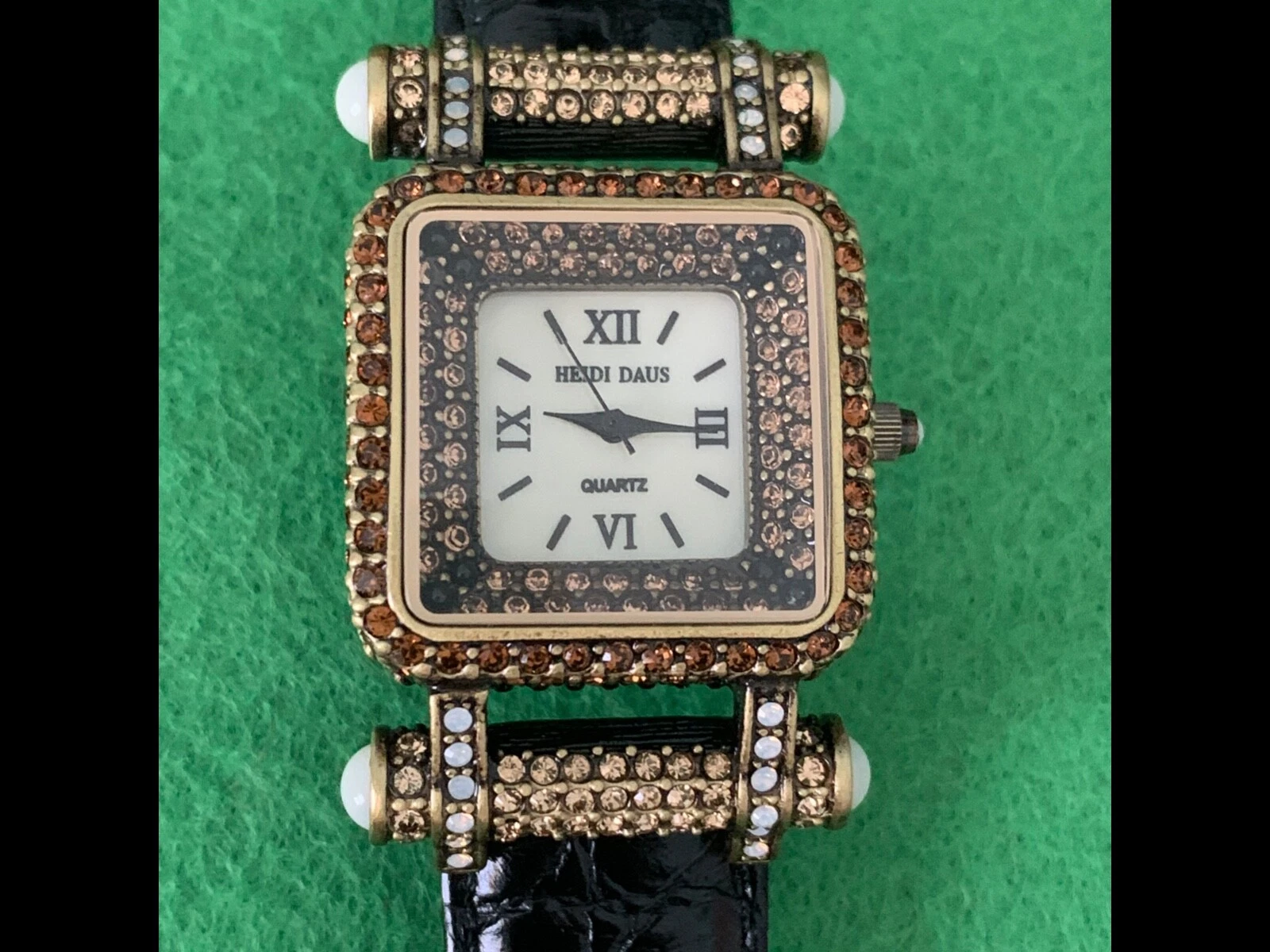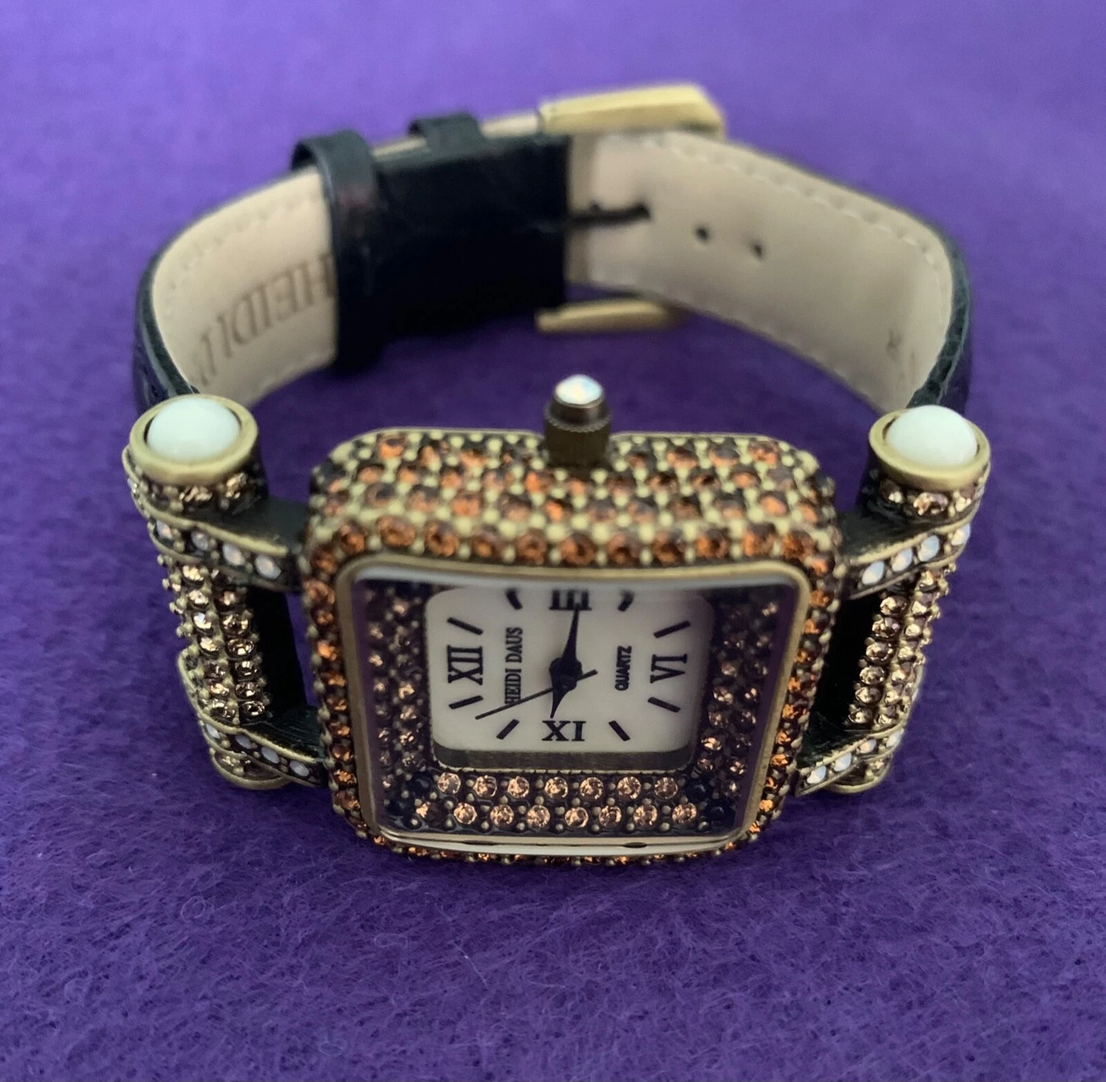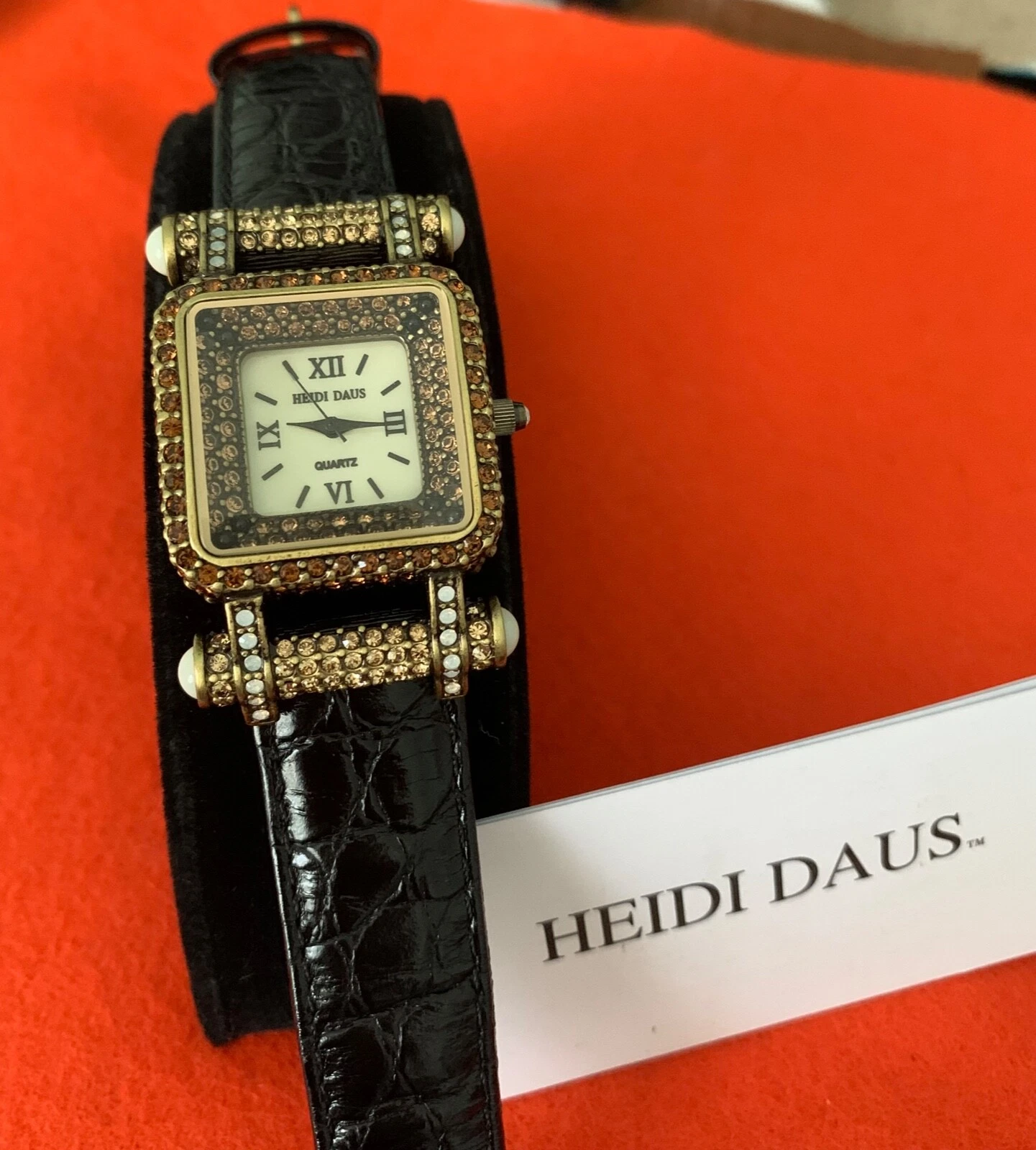 Heidi Daus "Timeless Beauty" Pave' Bezel Black Leather Strap Watch
