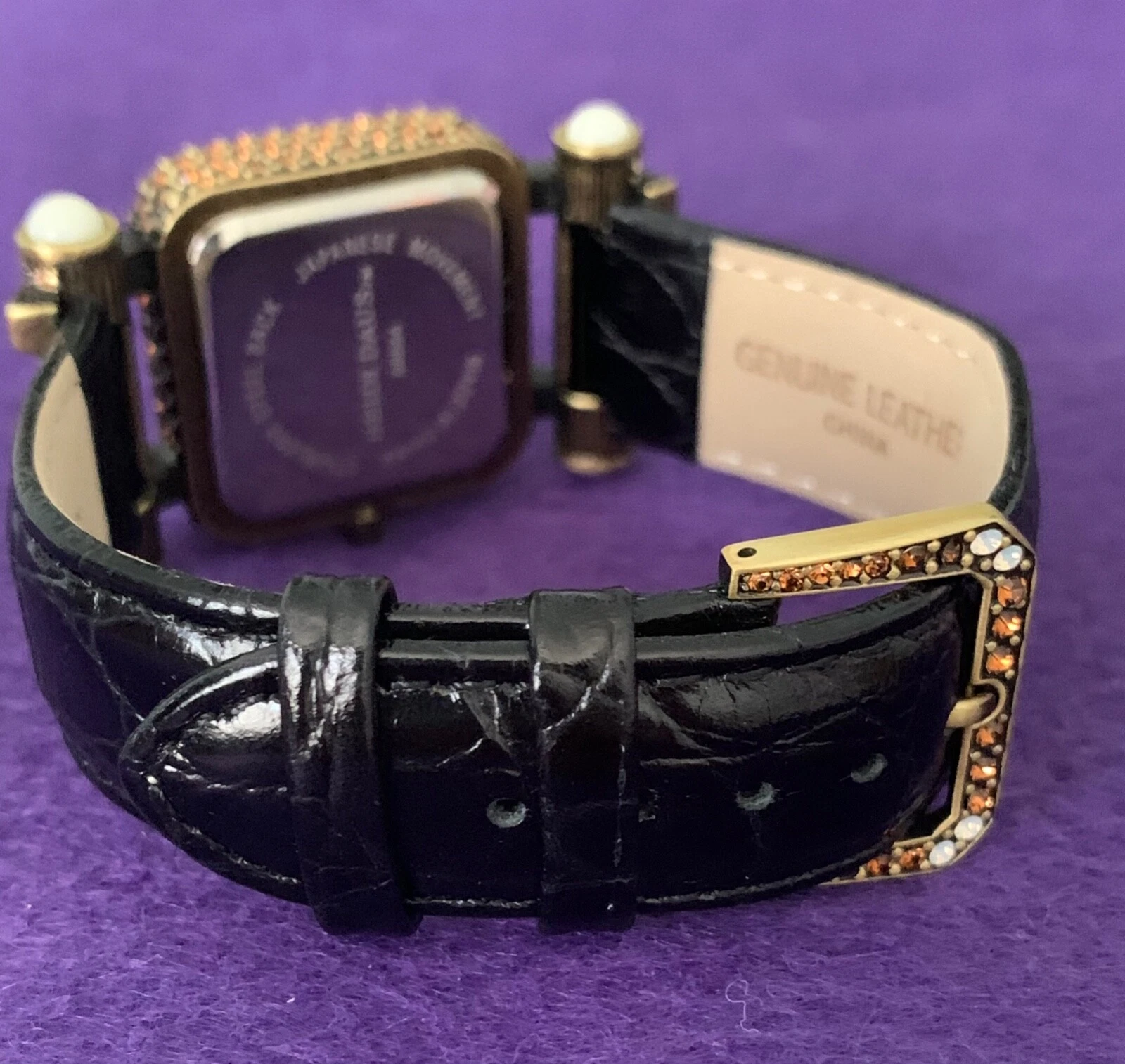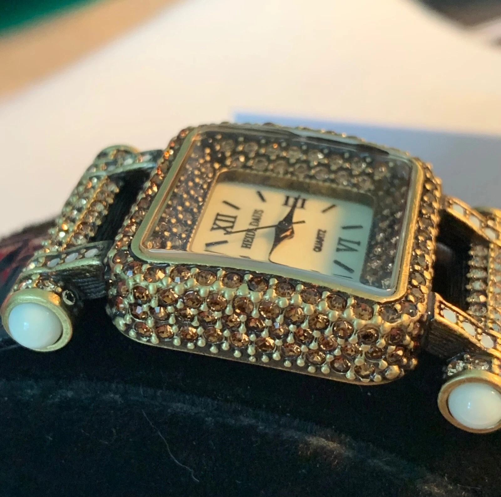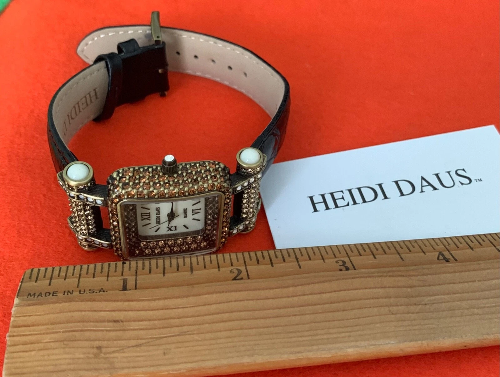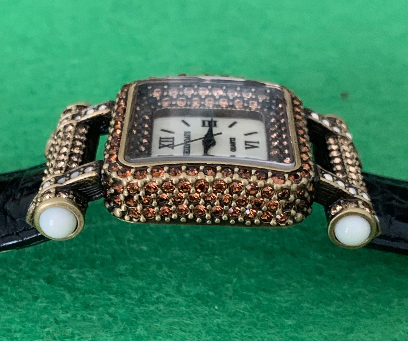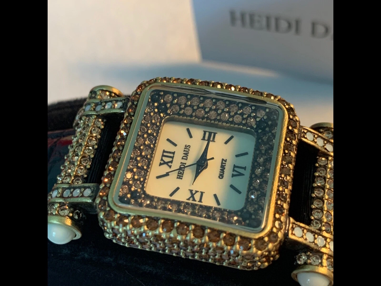 Heidi Daus "Timeless Beauty" Pave' Bezel Black Leather Strap Watch