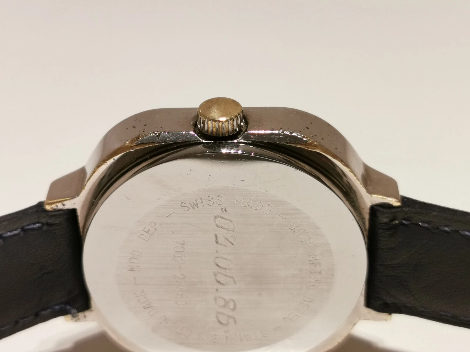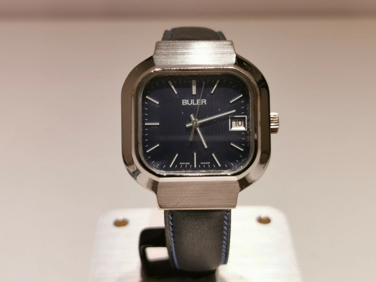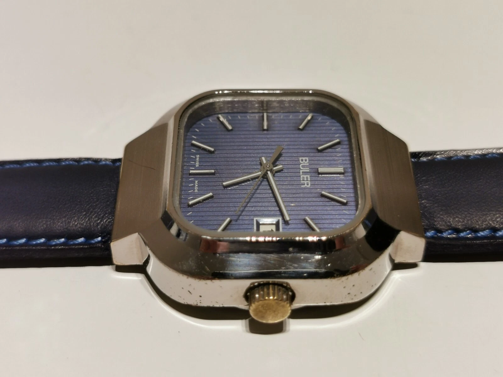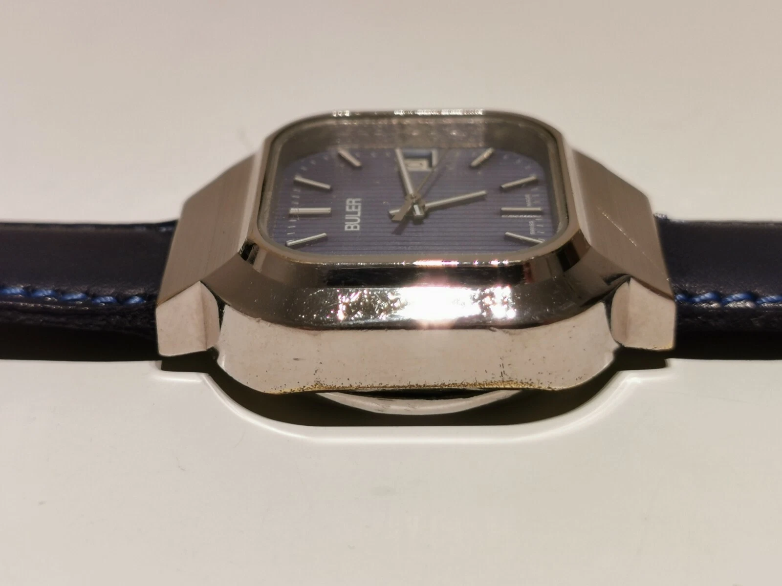 VINTAGE RARE NICE TV MODEL SWISS MEN'S CHROMED QUARTZ WATCH "BULER" /BLUE DIAL