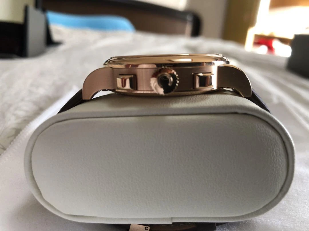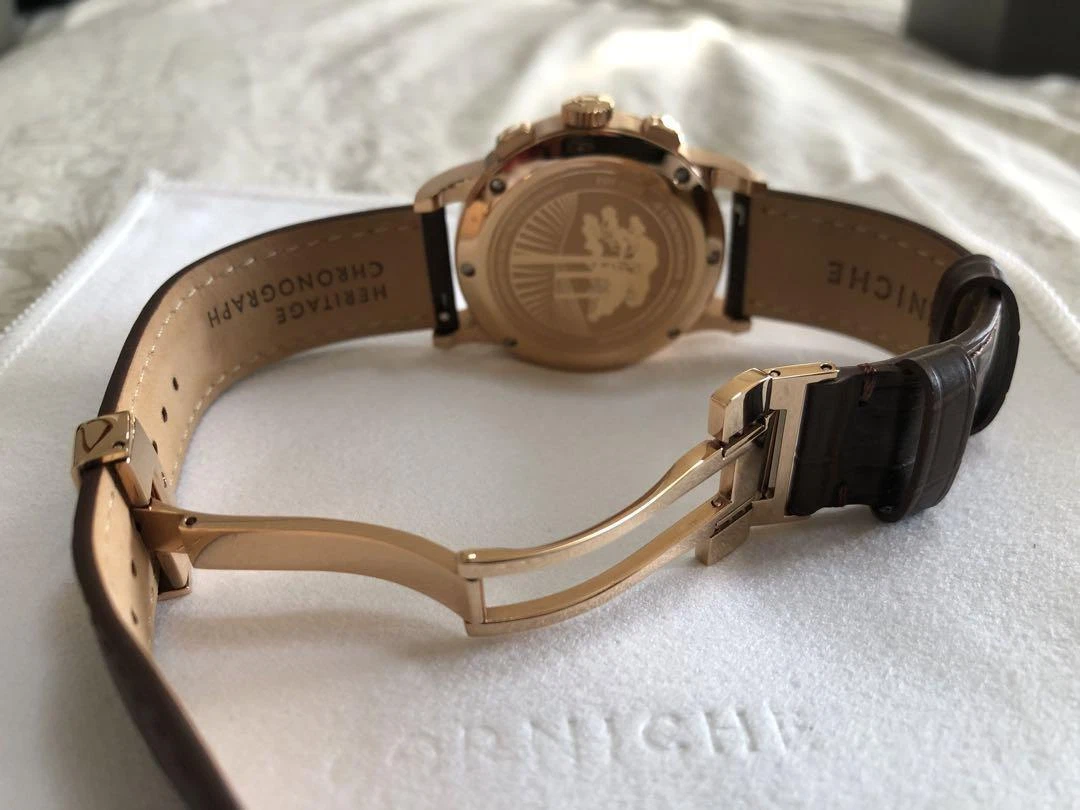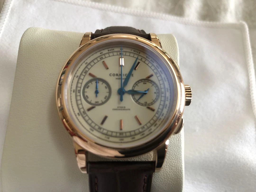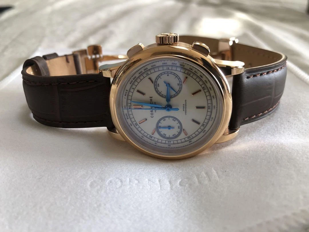 Corniche Heritage Chronograph 39mm Rose Gold Cream Dial Blue Hands Brown Leather