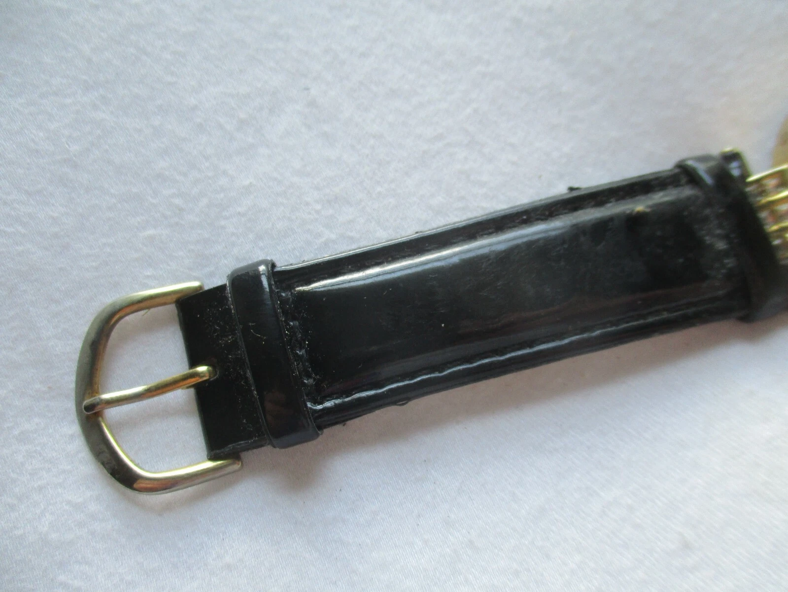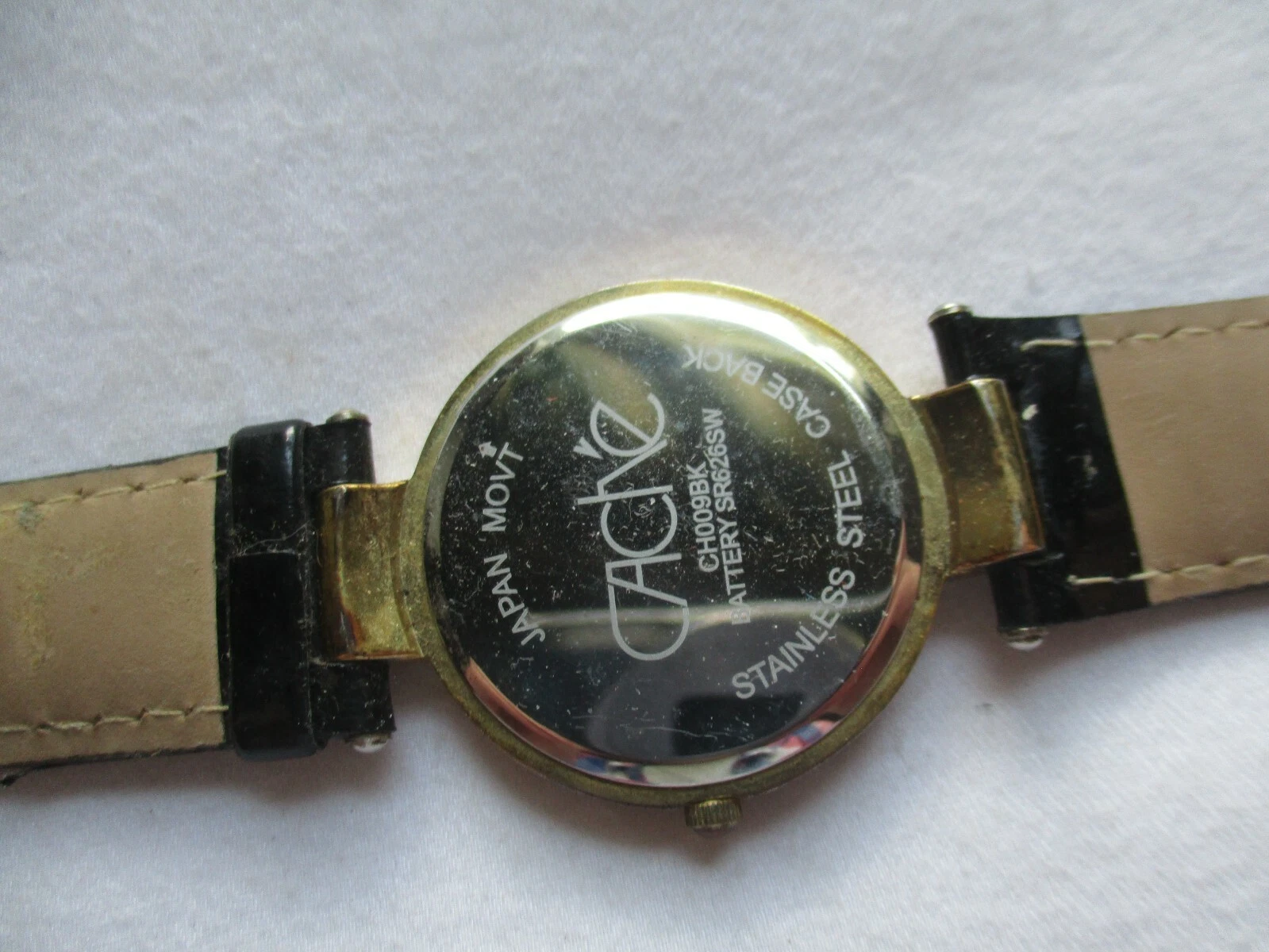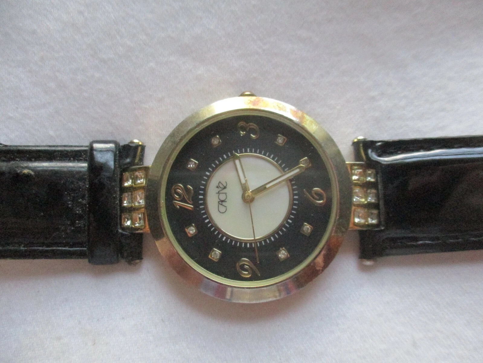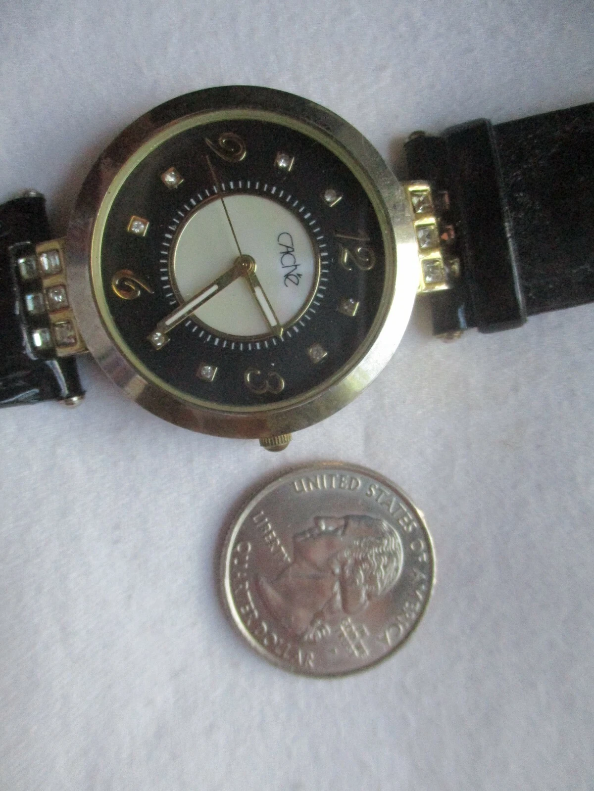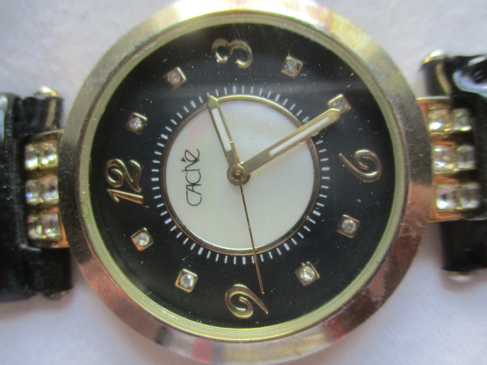 Cache Wristwatch Black Buckle Band Round Mother of Pearl Gold Tone