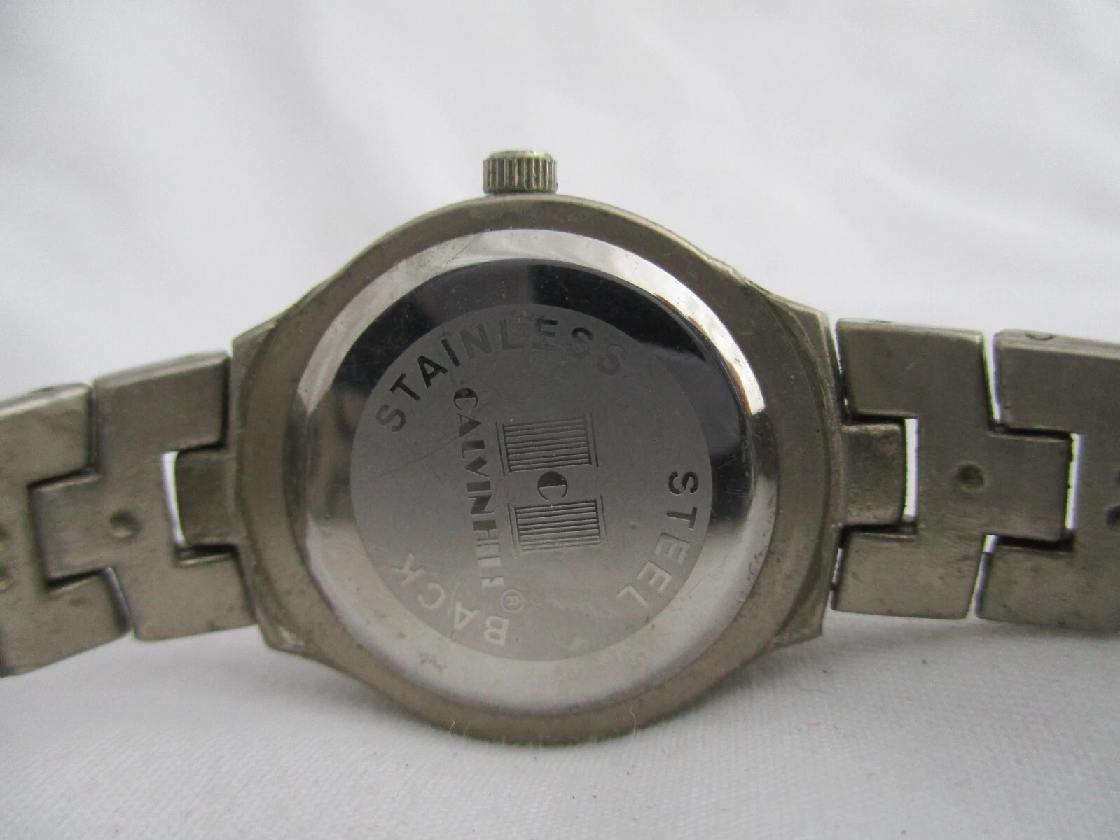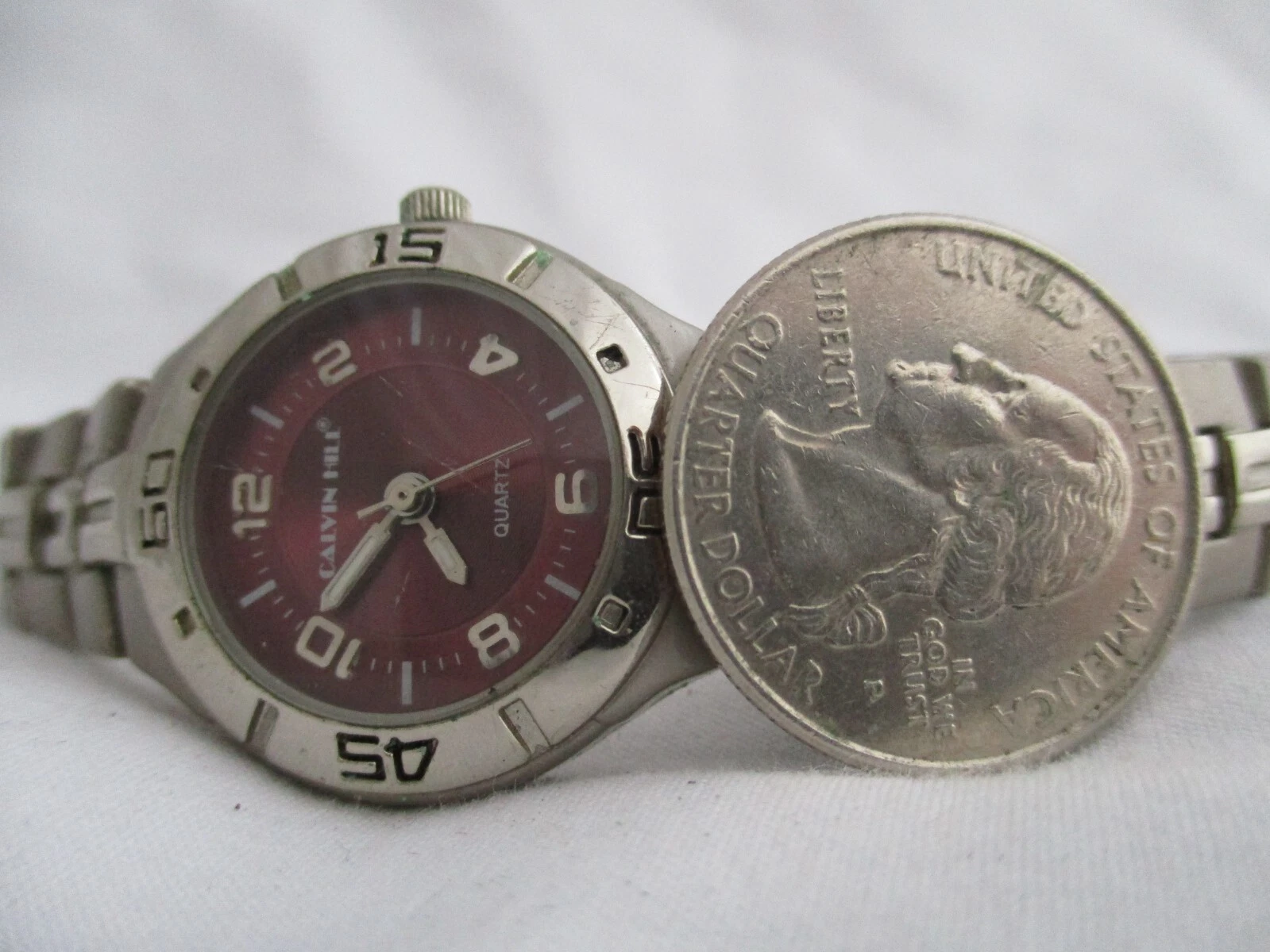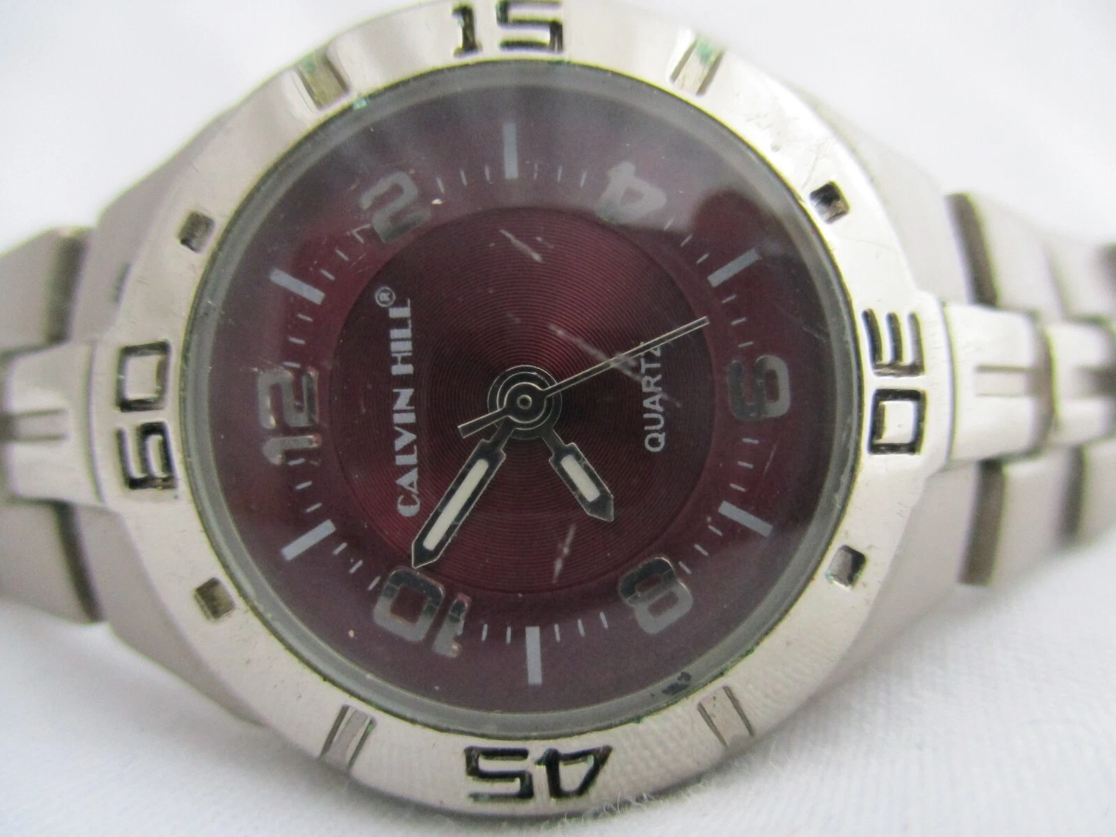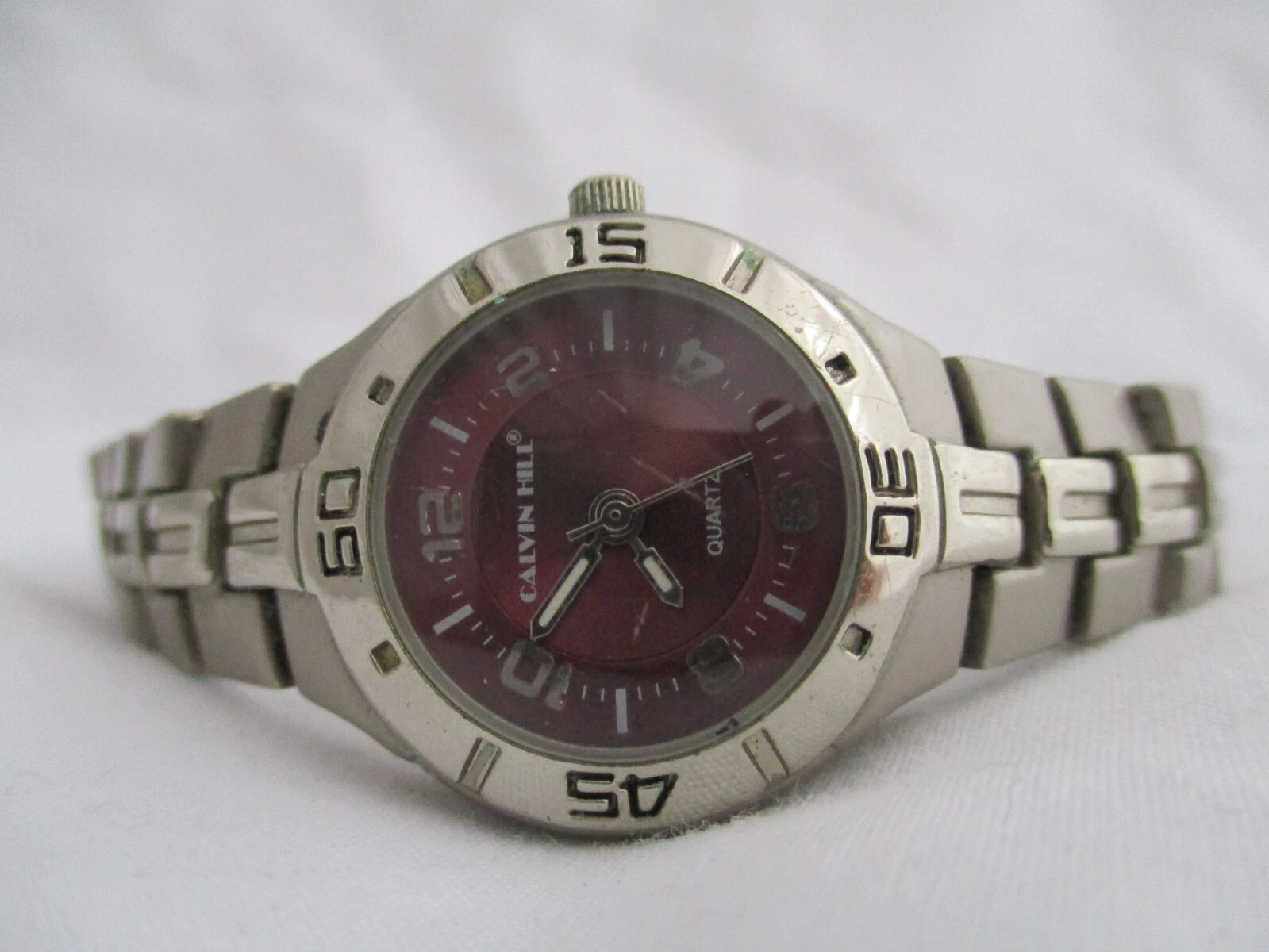 Calvin Hill Analog Wristwatch Silver Tone Stainless Steel Band Round Maroon Face