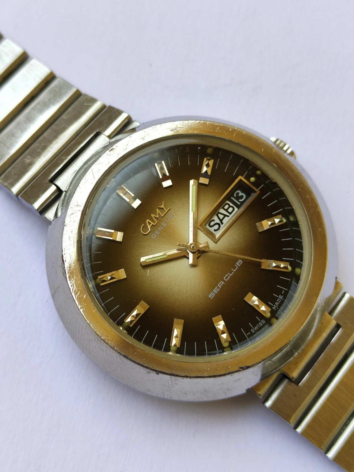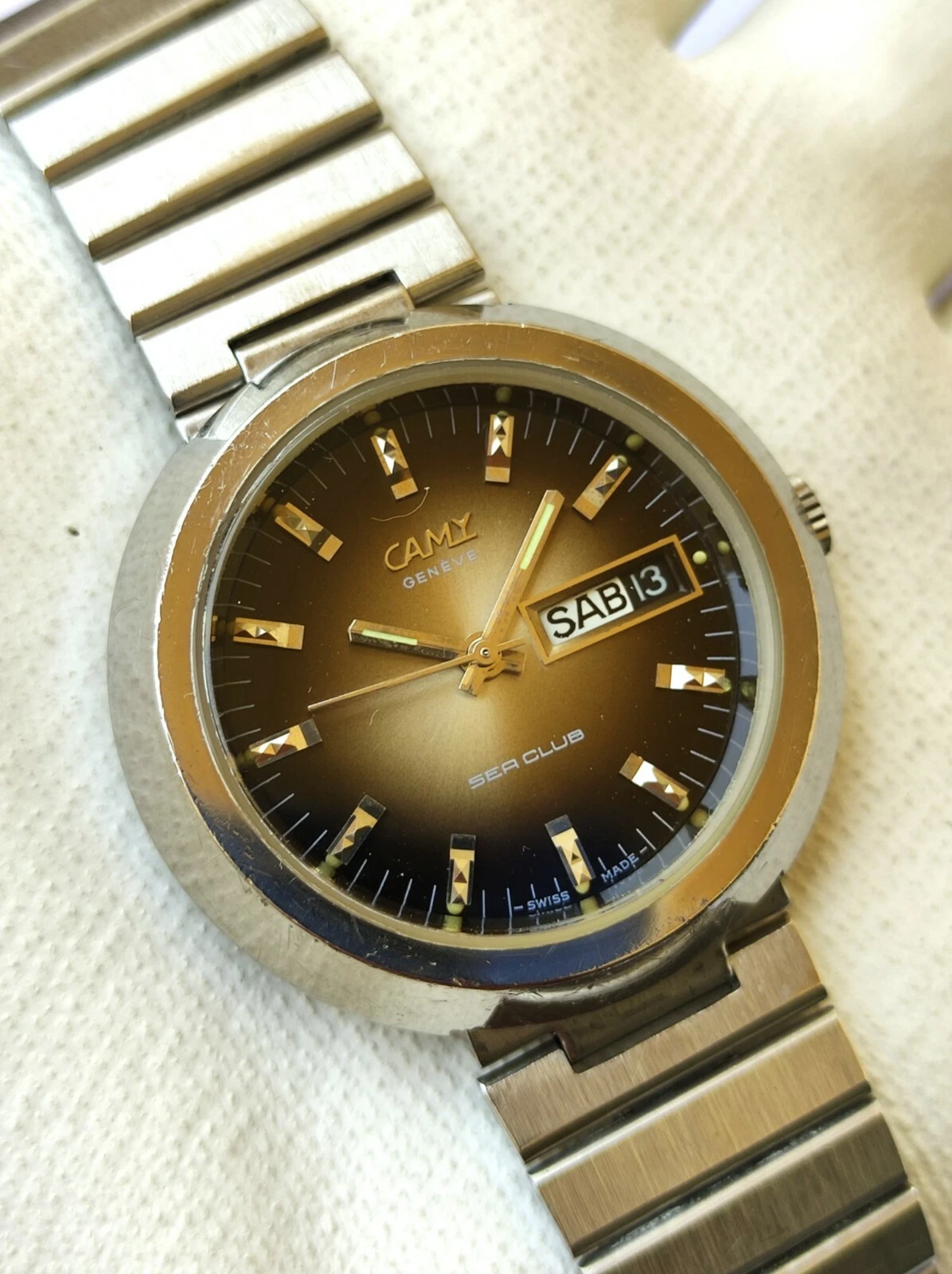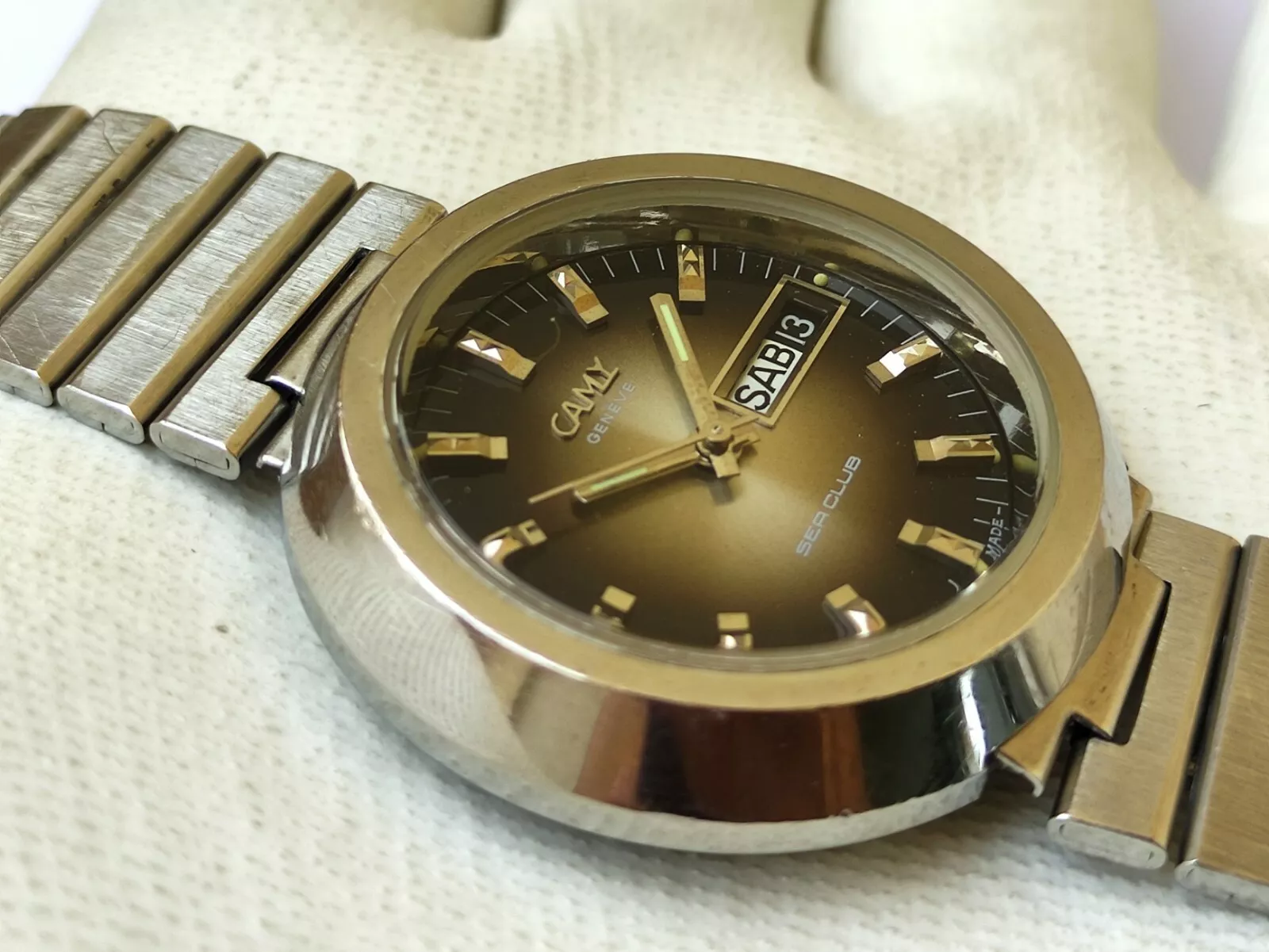 Vintage Camy Geneve Automatic Watch Mens Camy Sea Club Brown Day Date 39mm