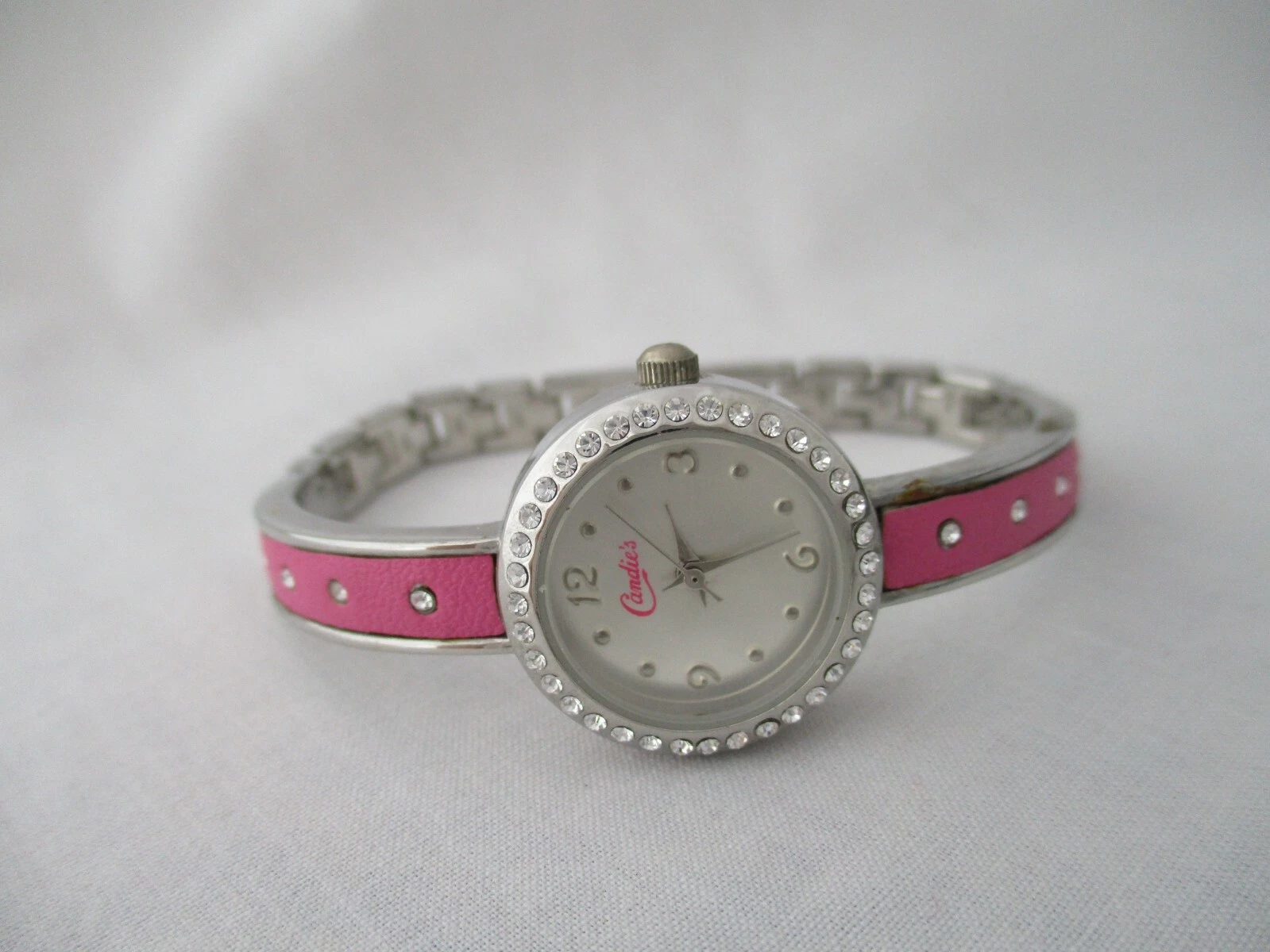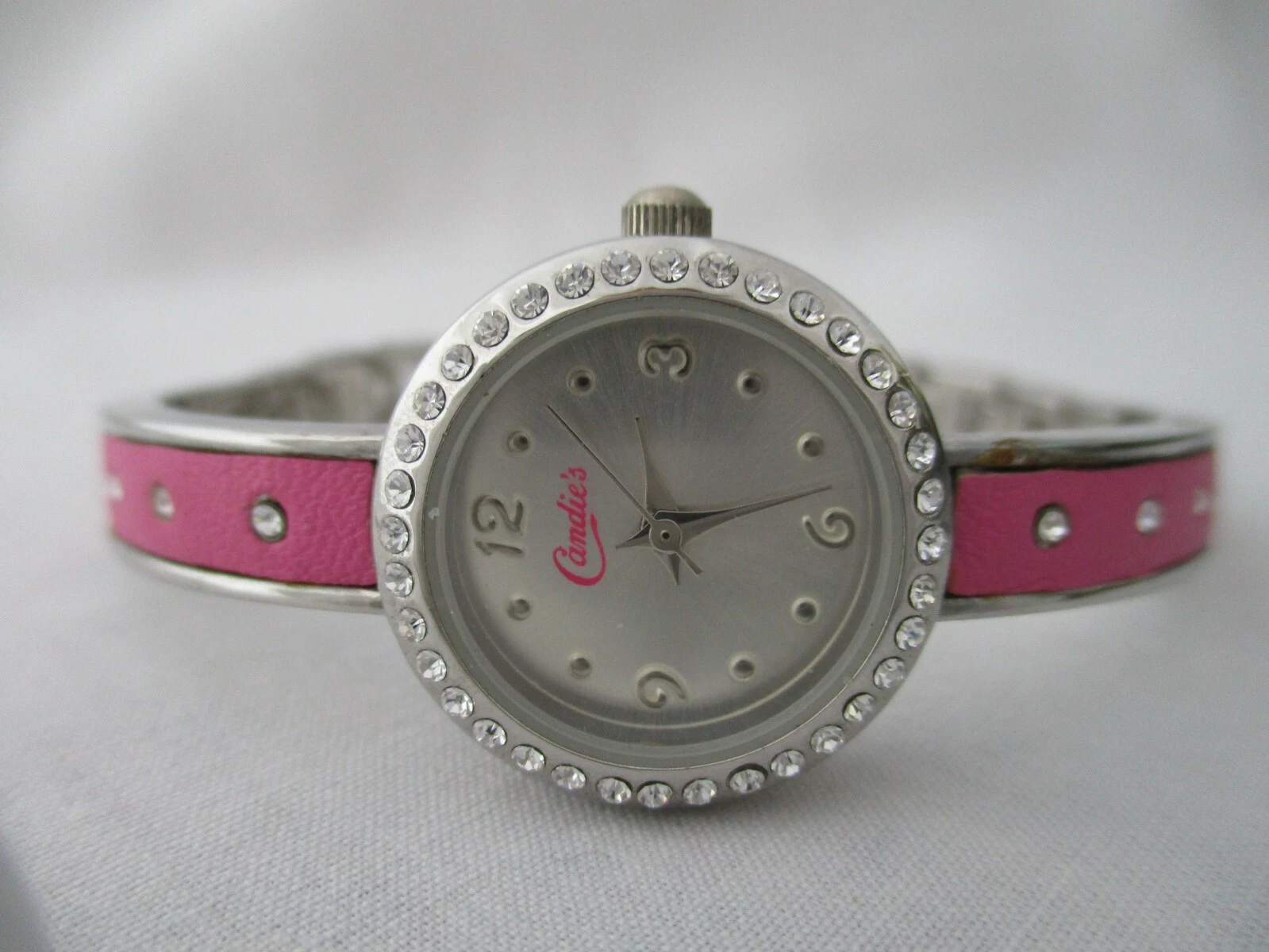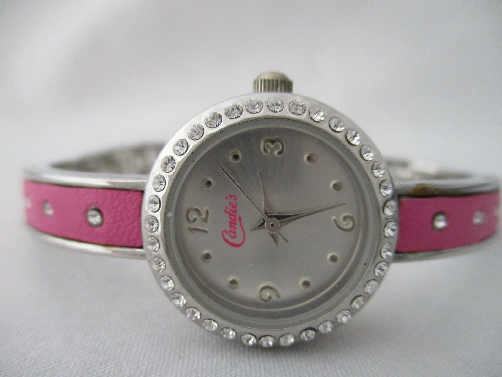 Candies Wristwatch Silver Tone & Pink Band Rhinestones Round Face