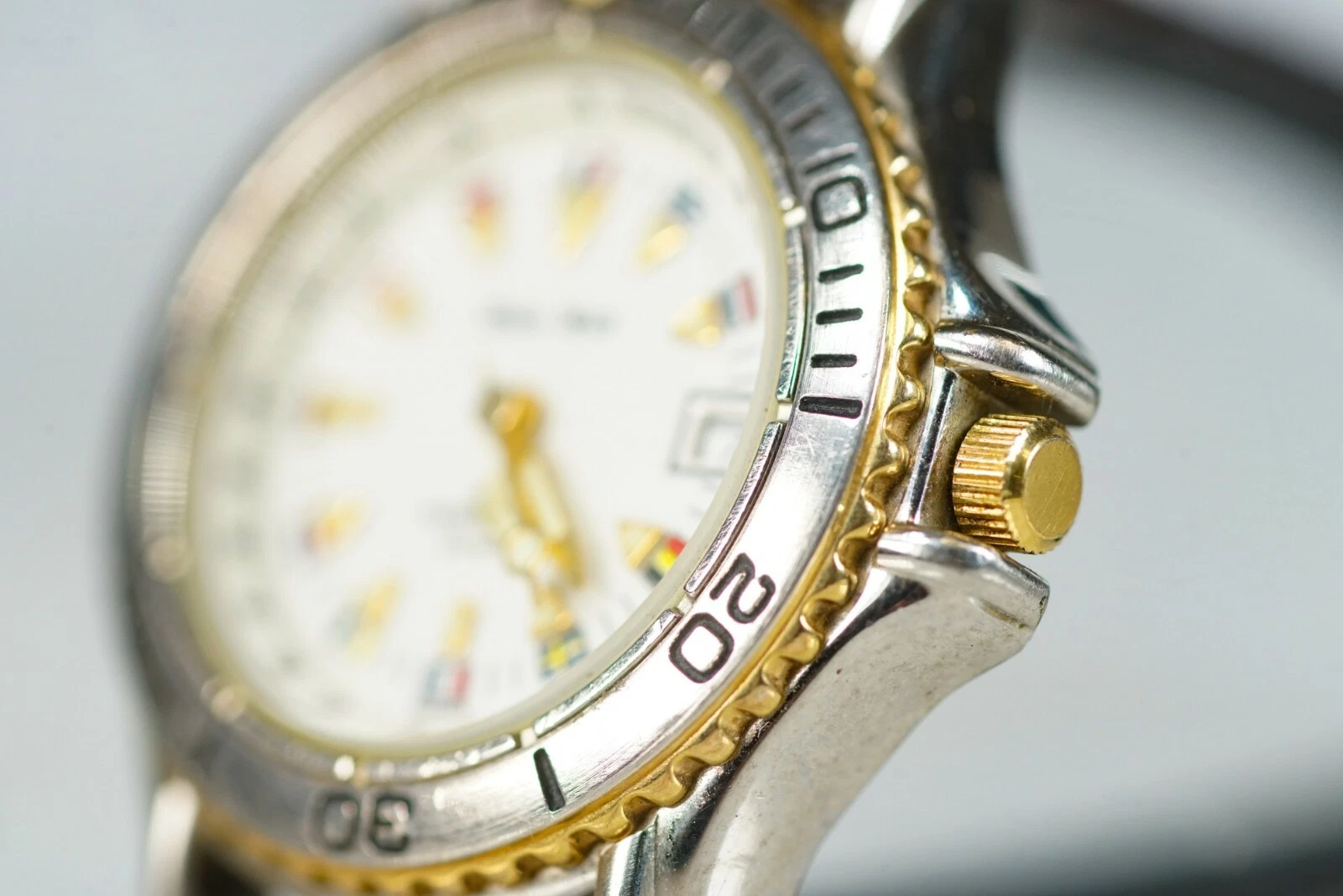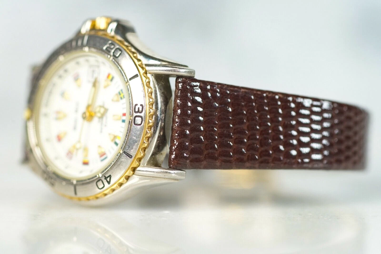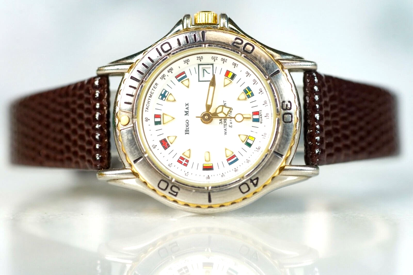 Vintage Hugo Max Watch Women's 18K Gold Plated Bezel World Flag Wristwatch