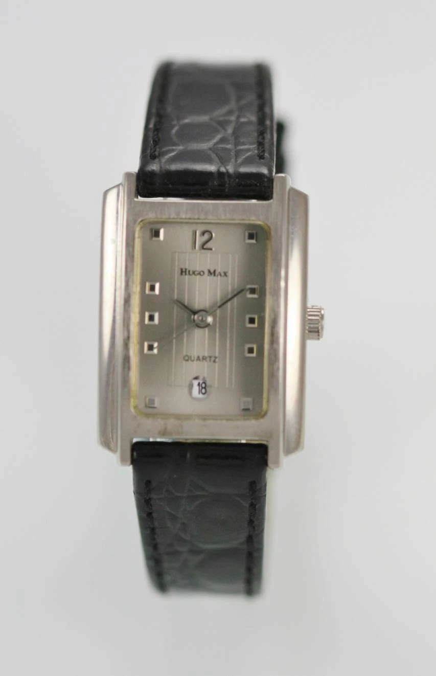 Hugo Max Gray Womens Stainless Silver Black Leather Date Quartz Battery Watch